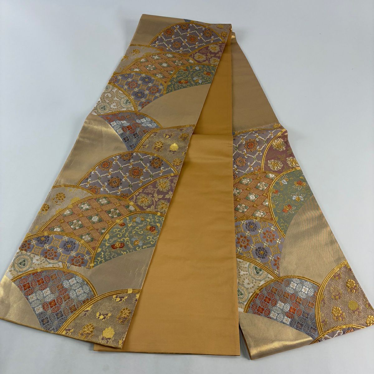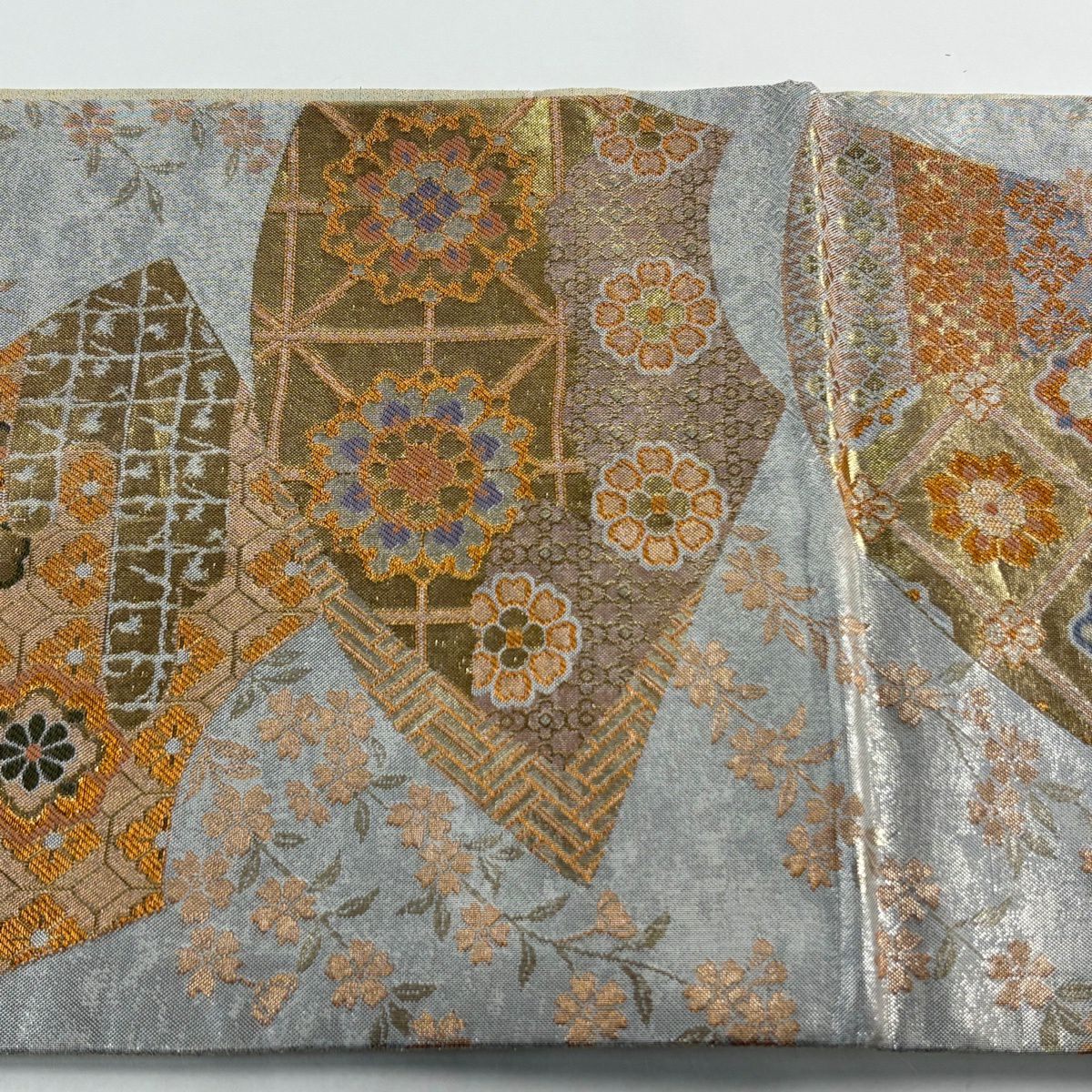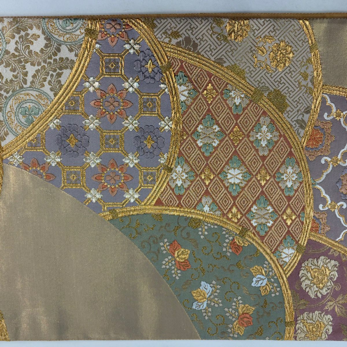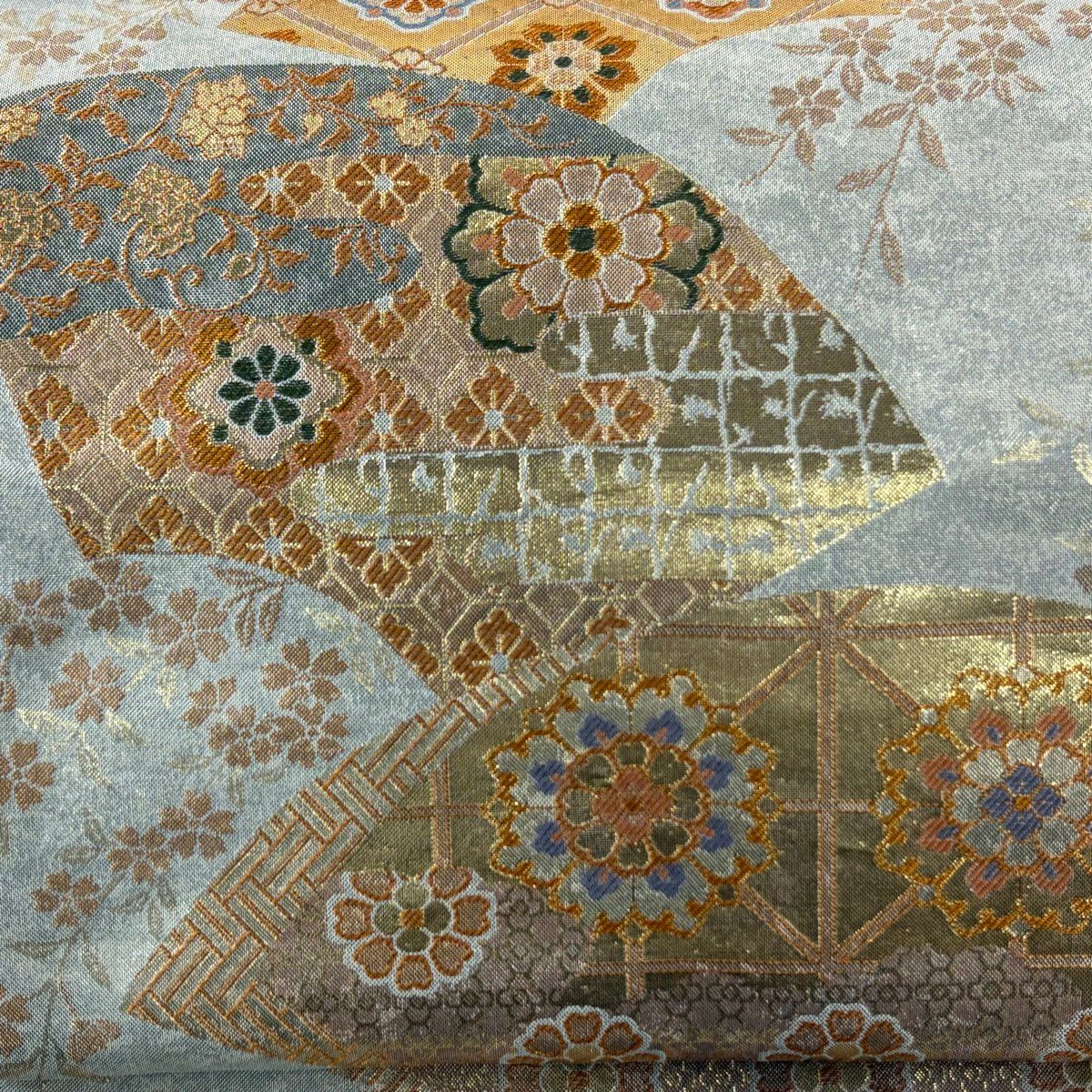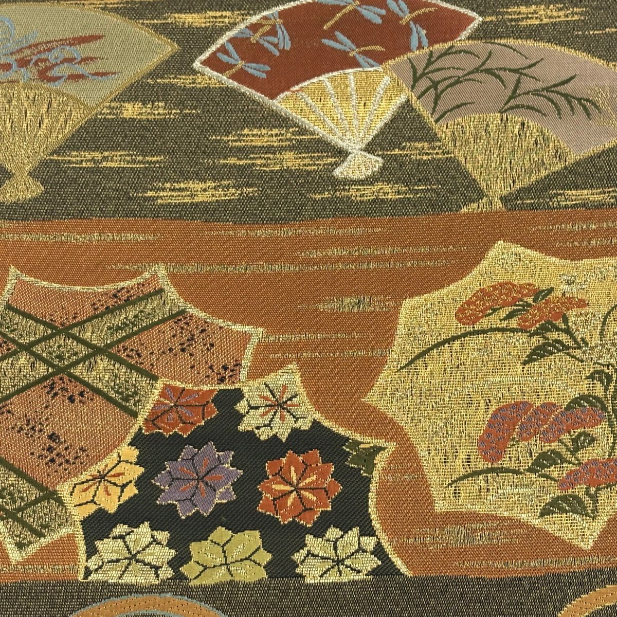 【美品】 袋帯 秀品 華文 扇面 金糸 箔 銀色 六通 正絹