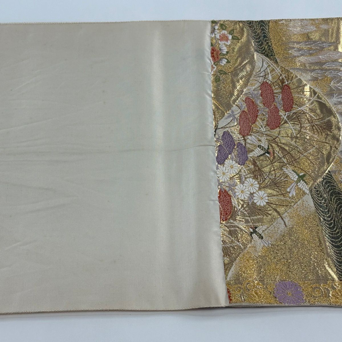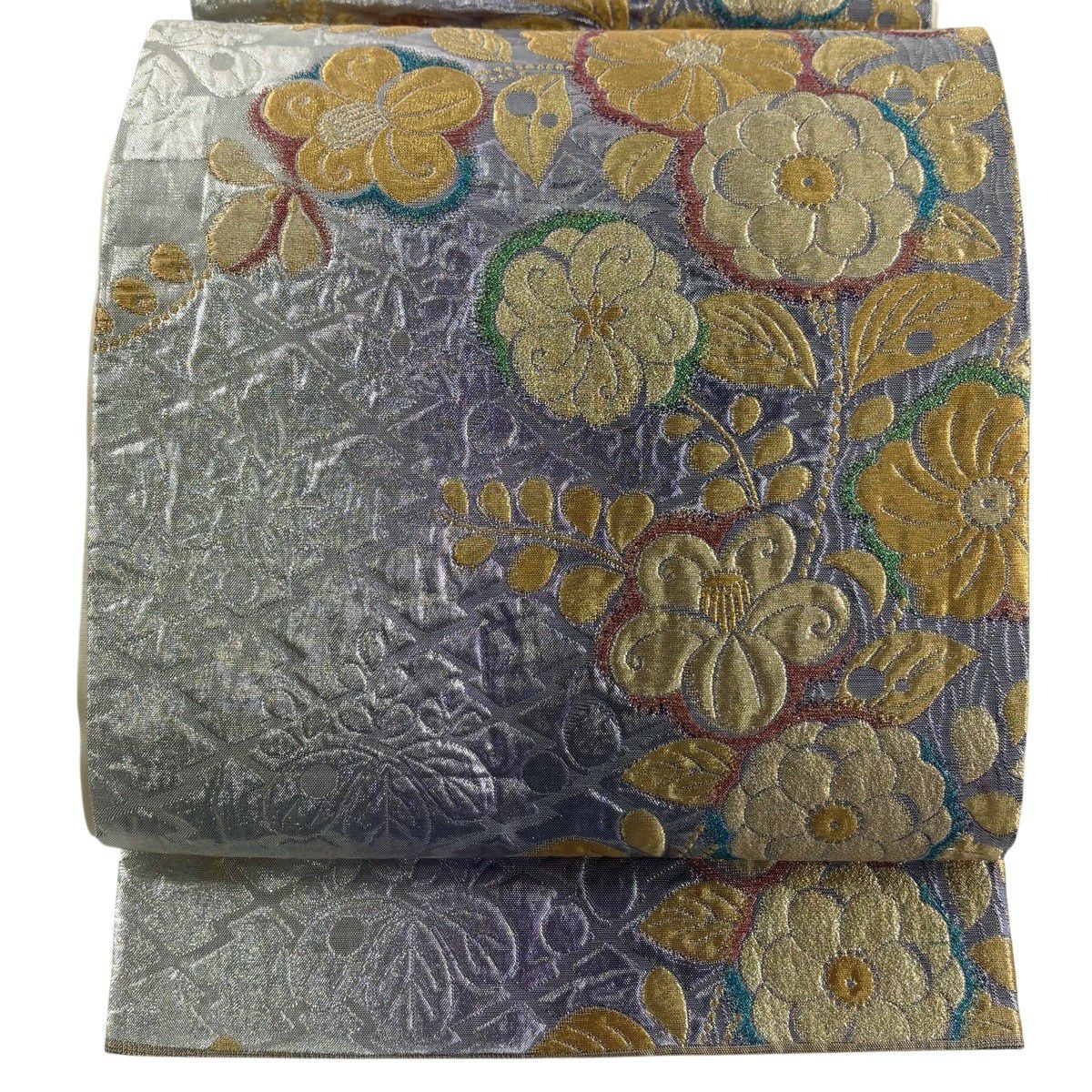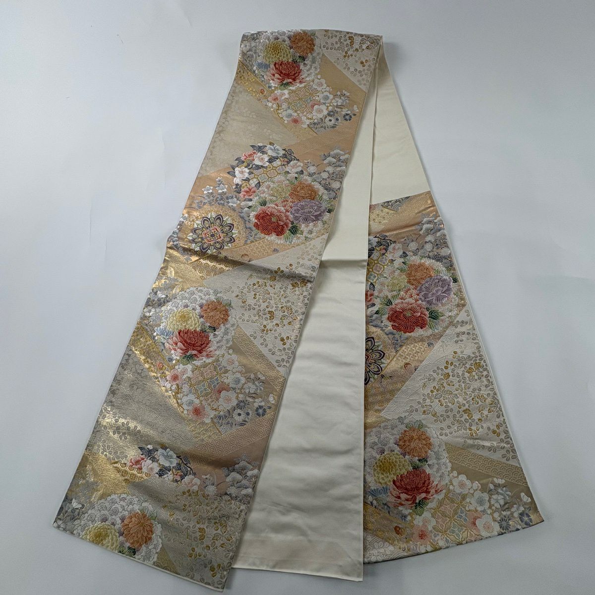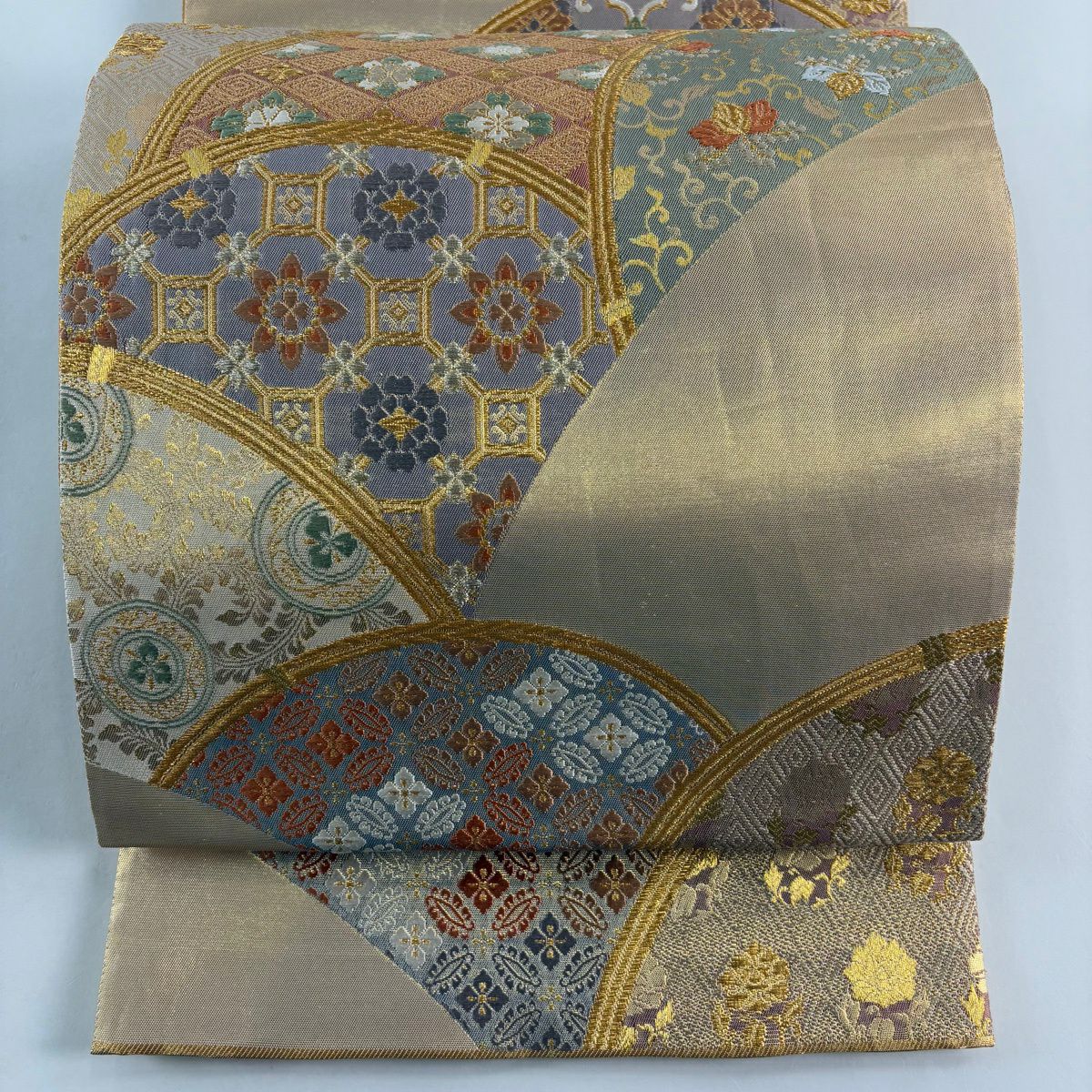 【美品】 袋帯 秀品 華文 扇面 金糸 箔 銀色 六通 正絹