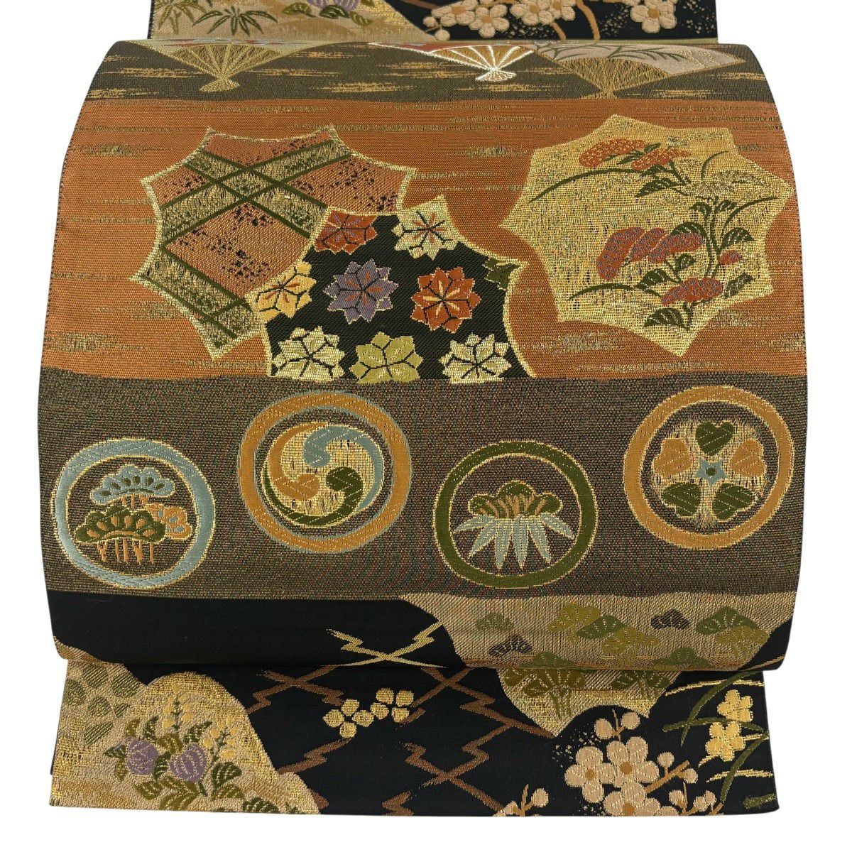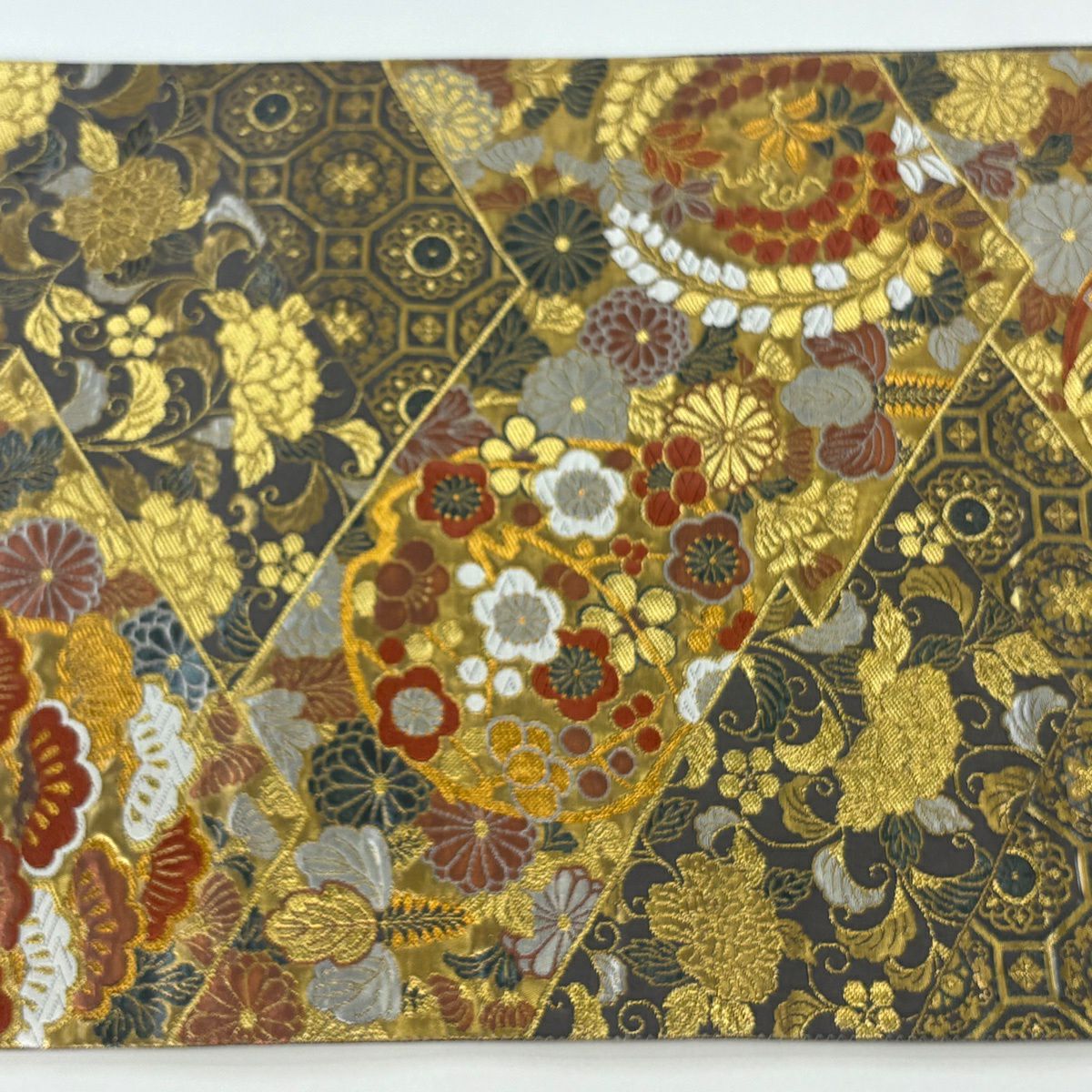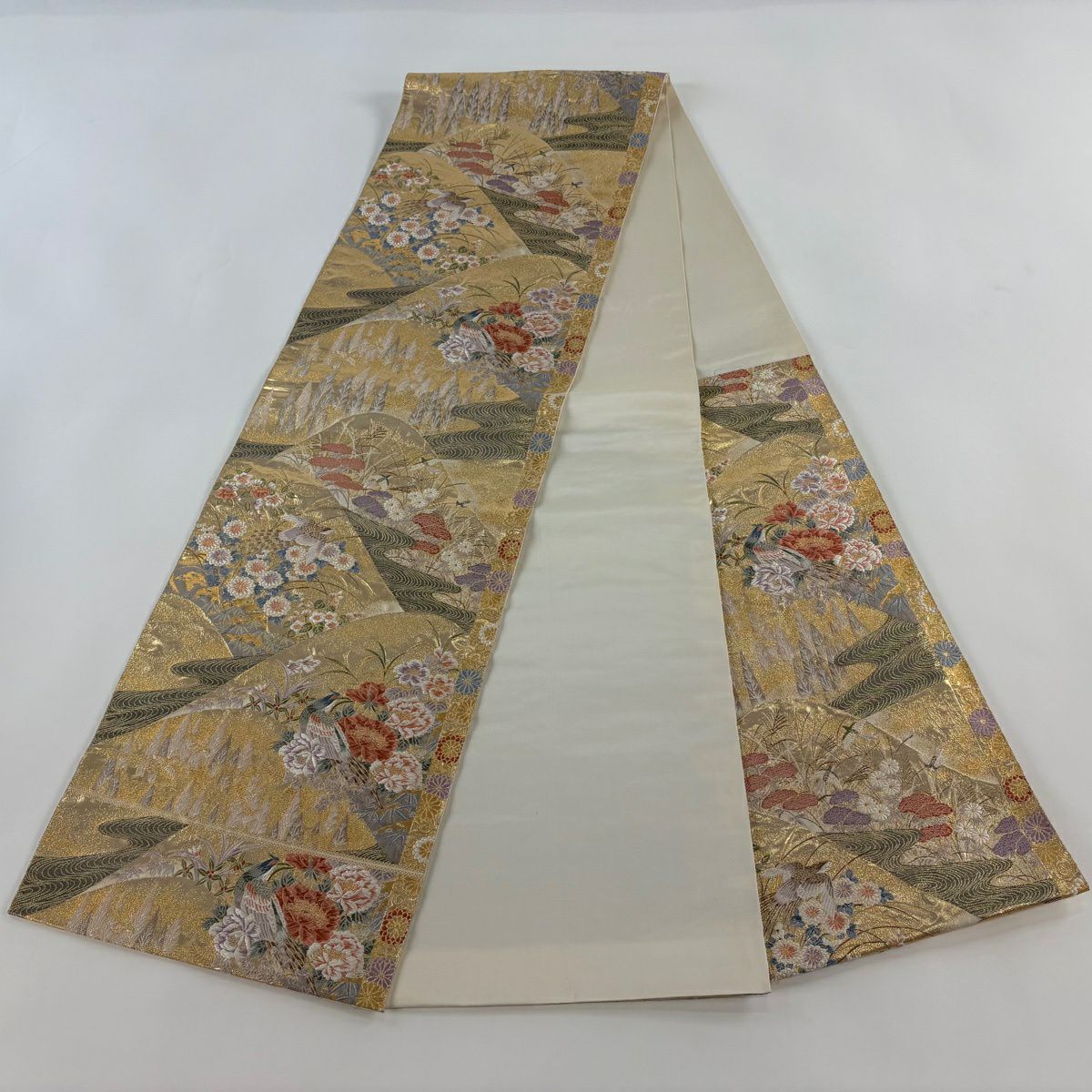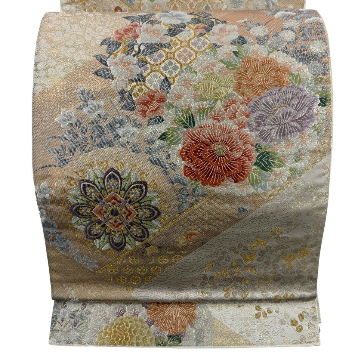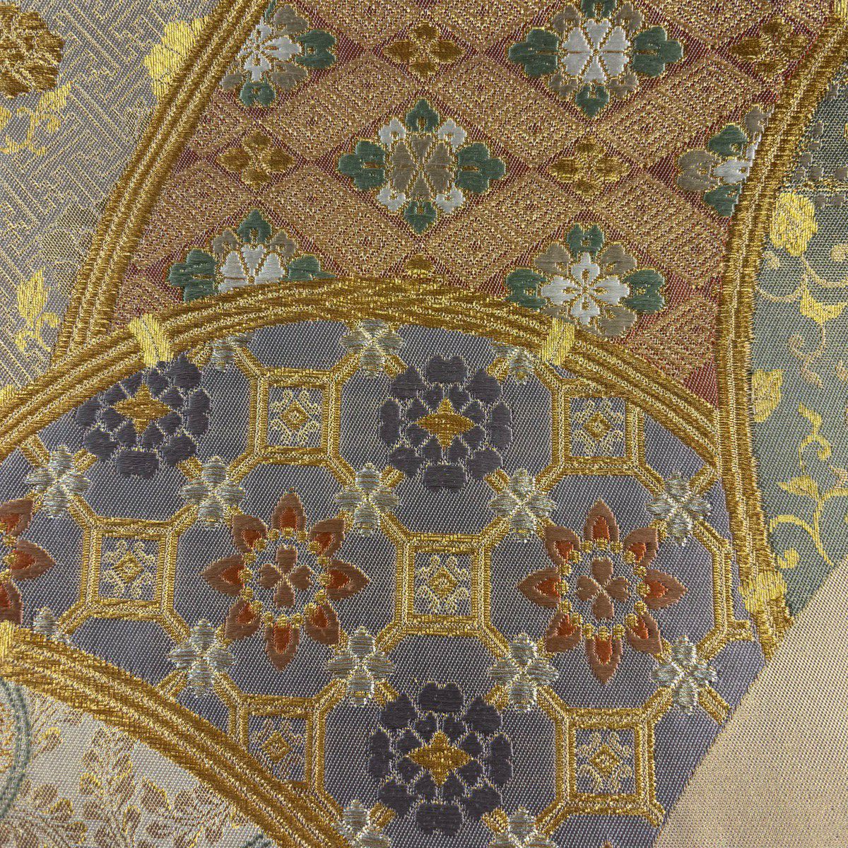 【美品】 袋帯 秀品 華文 扇面 金糸 箔 銀色 六通 正絹