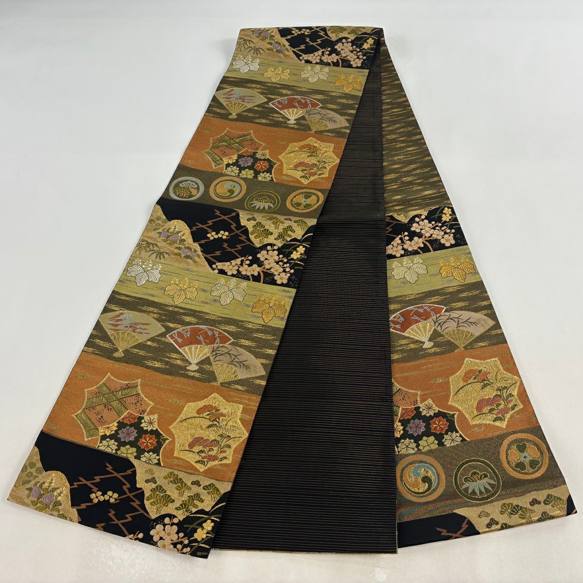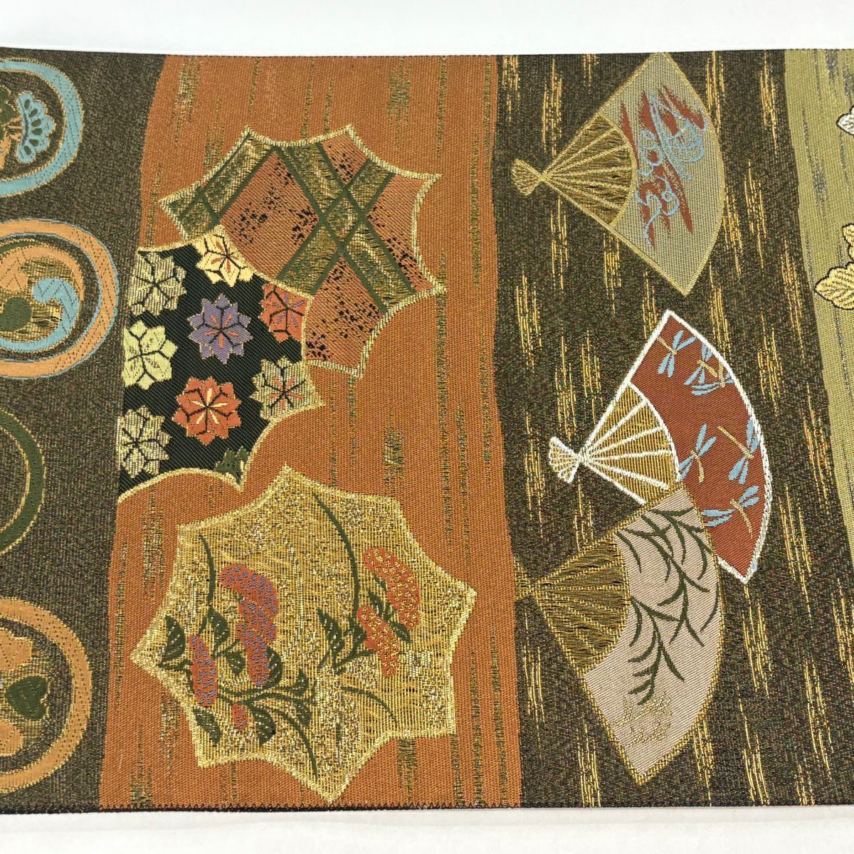 【美品】 袋帯 秀品 扇 桐 金銀糸 箔 茶緑色 六通 正絹