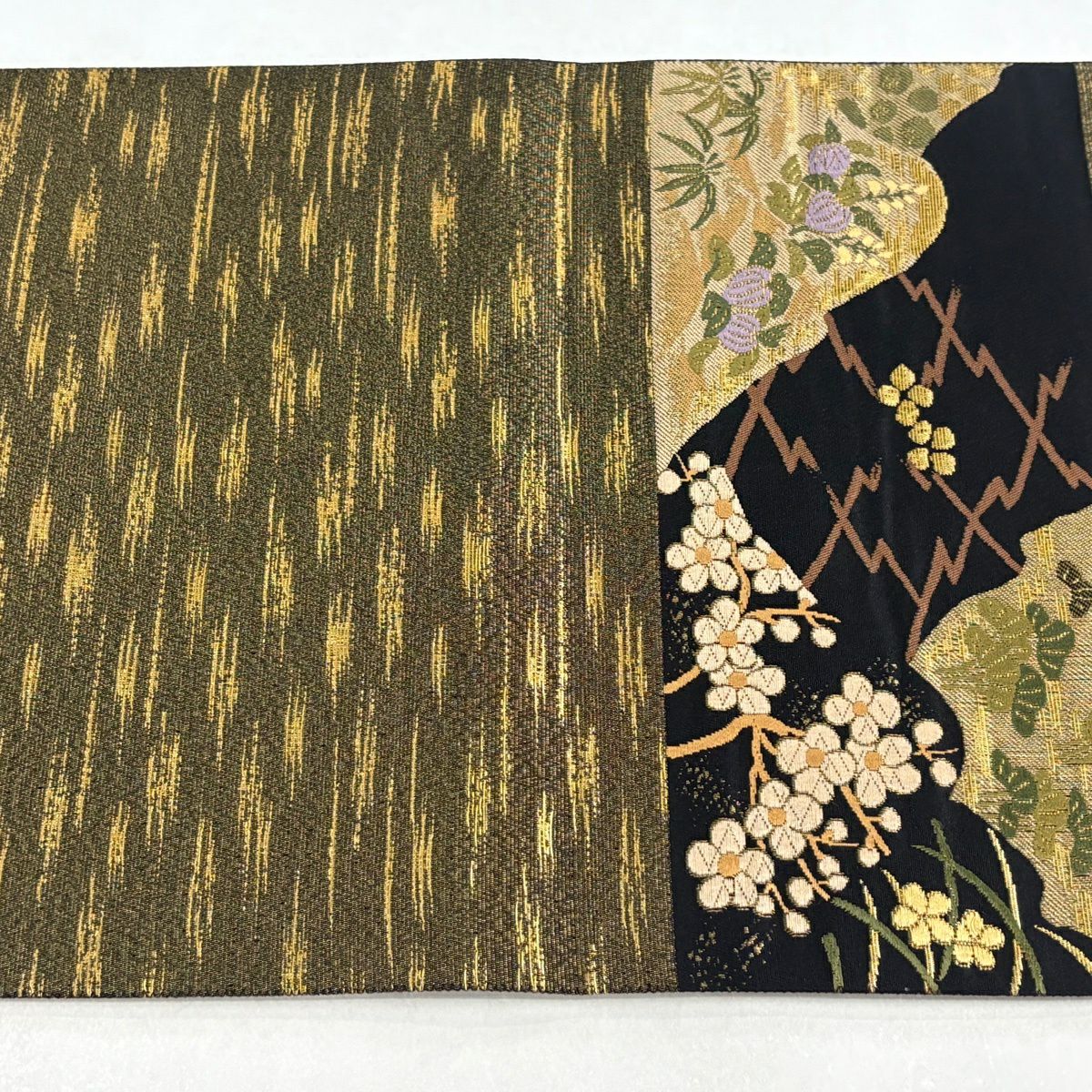 【美品】 袋帯 秀品 梅 疋田 金糸 箔 抹茶色 六通 正絹