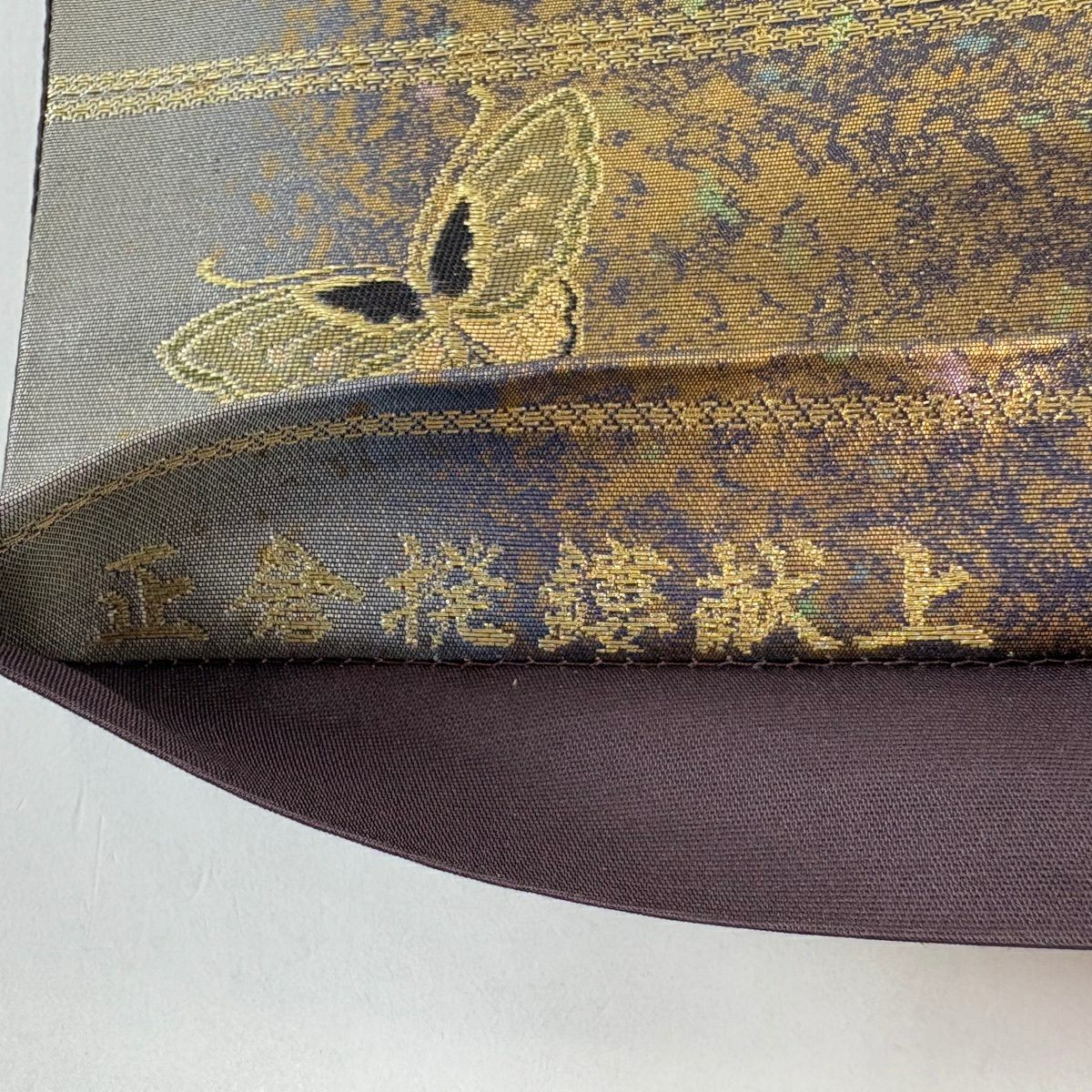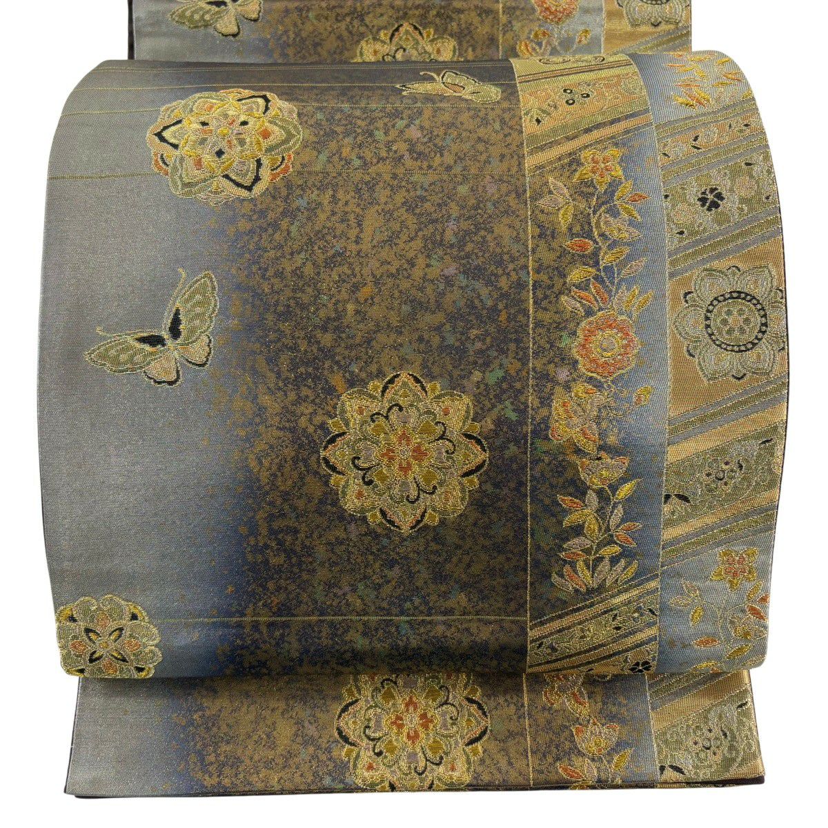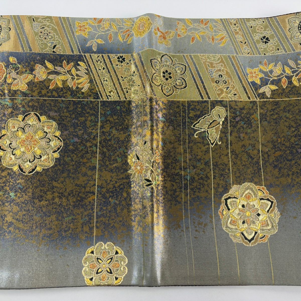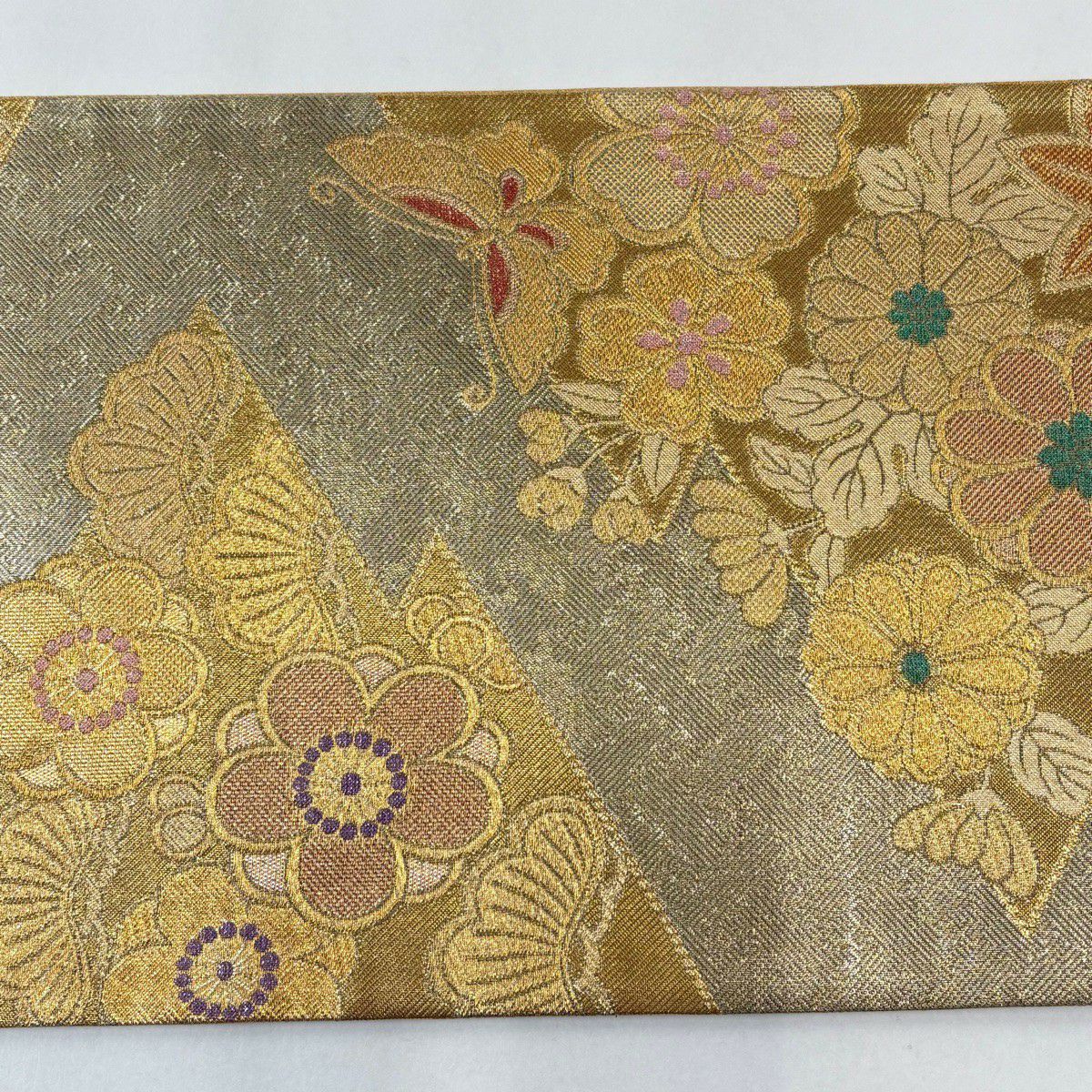 【美品】 袋帯 秀品 華文 花蝶 金糸 箔 灰色 六通 正絹
