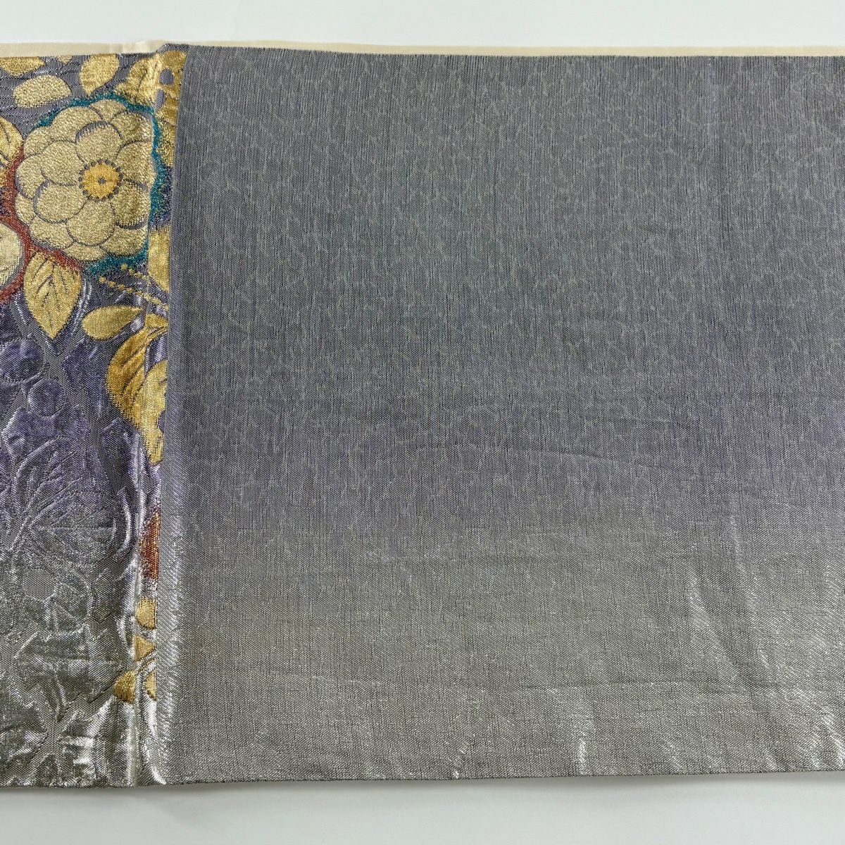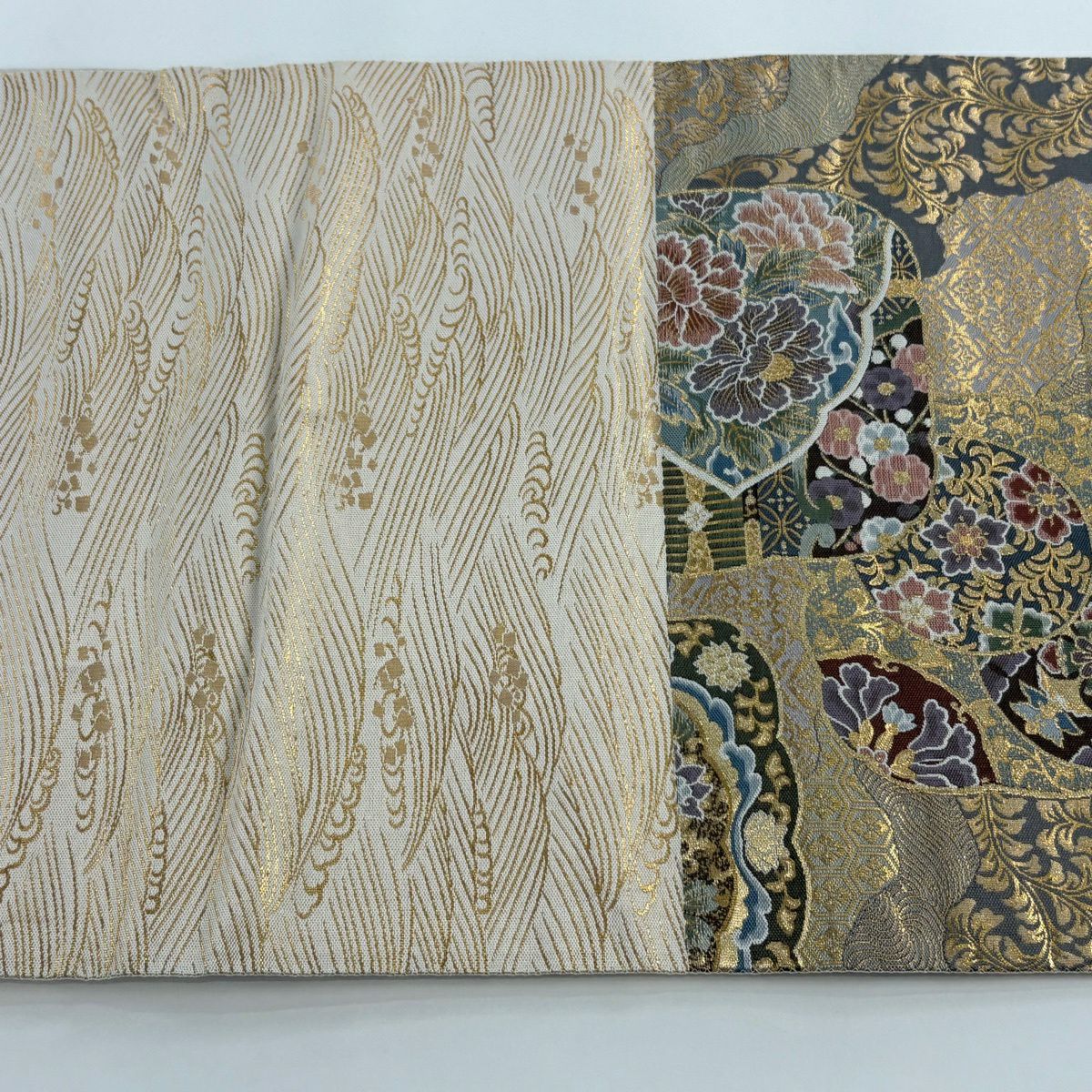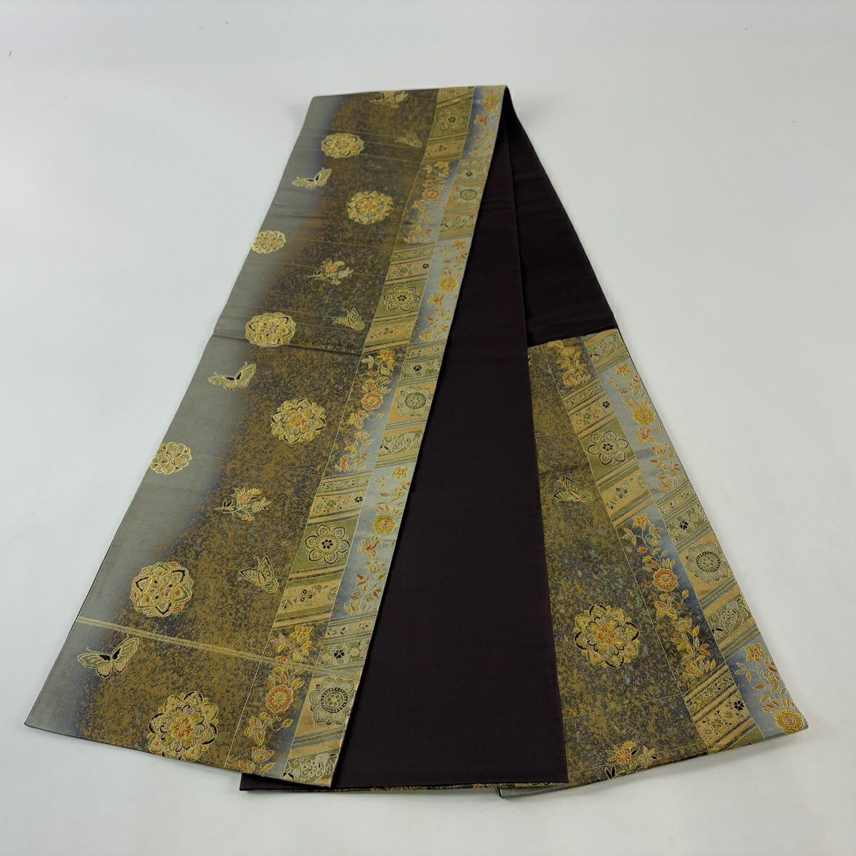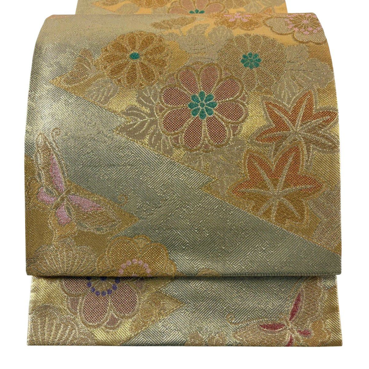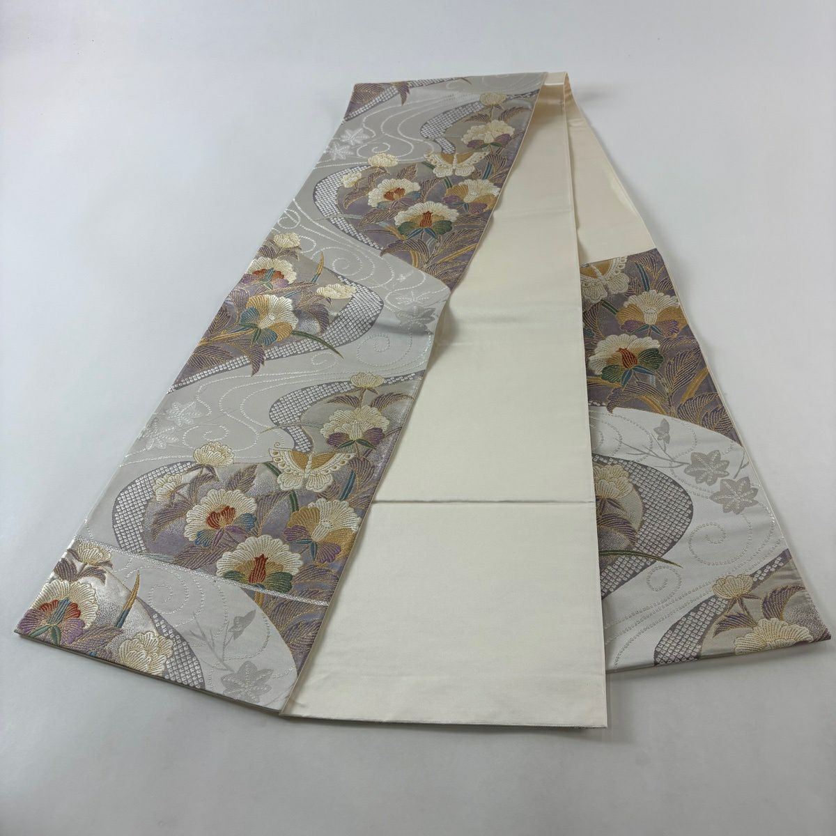 【美品】 袋帯 秀品 華文 花蝶 金糸 箔 灰色 六通 正絹