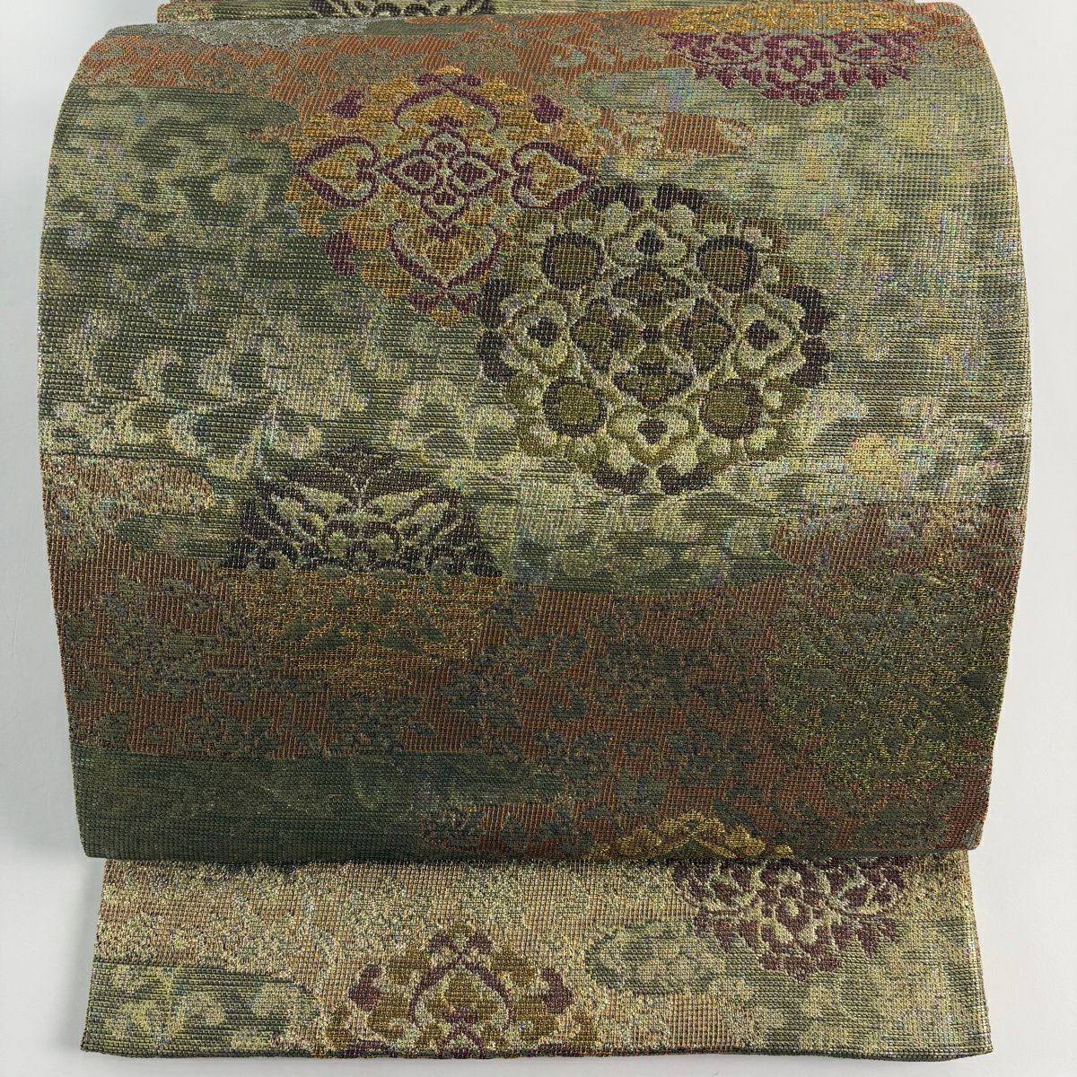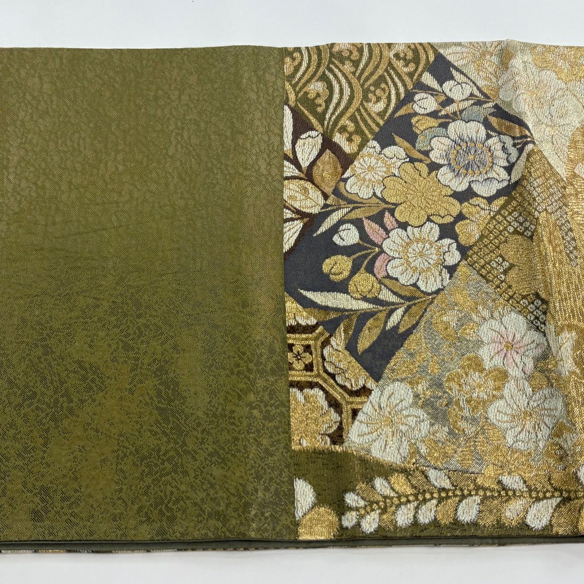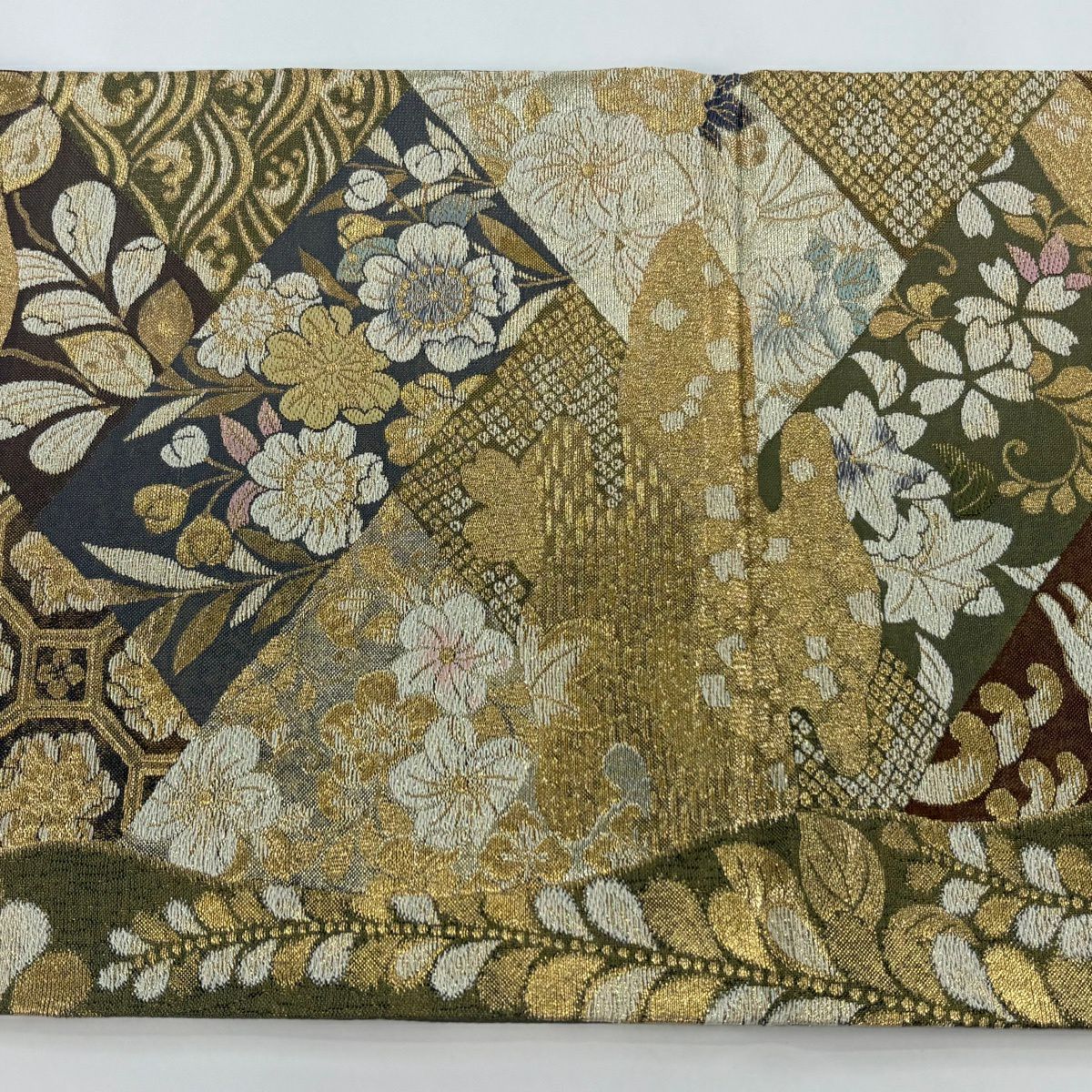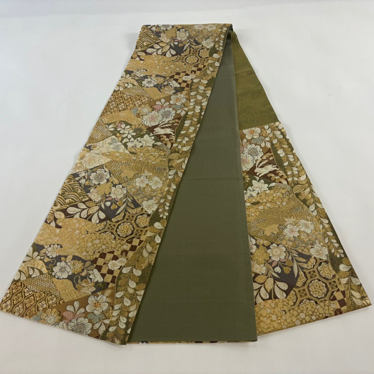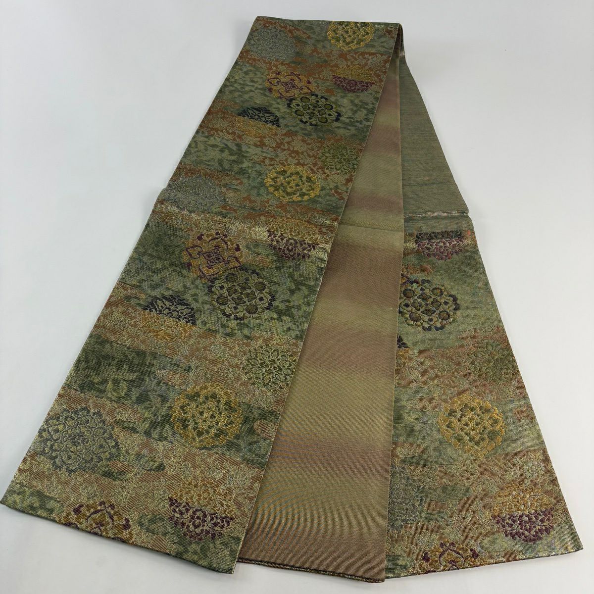 【美品】 袋帯 秀品 華文 霞 箔 金糸 茶緑色 六通 正絹