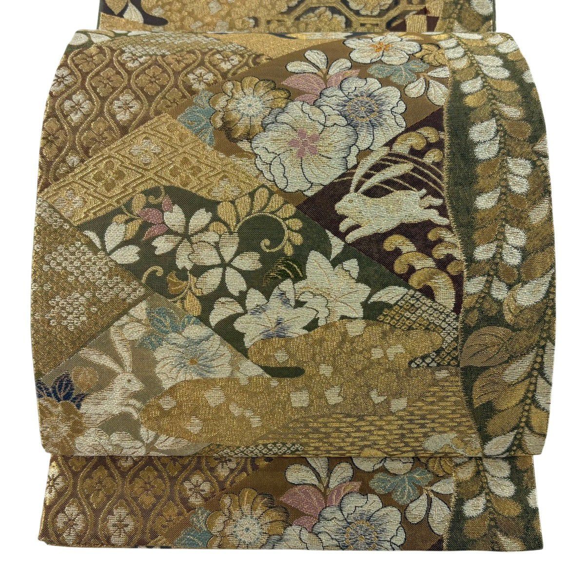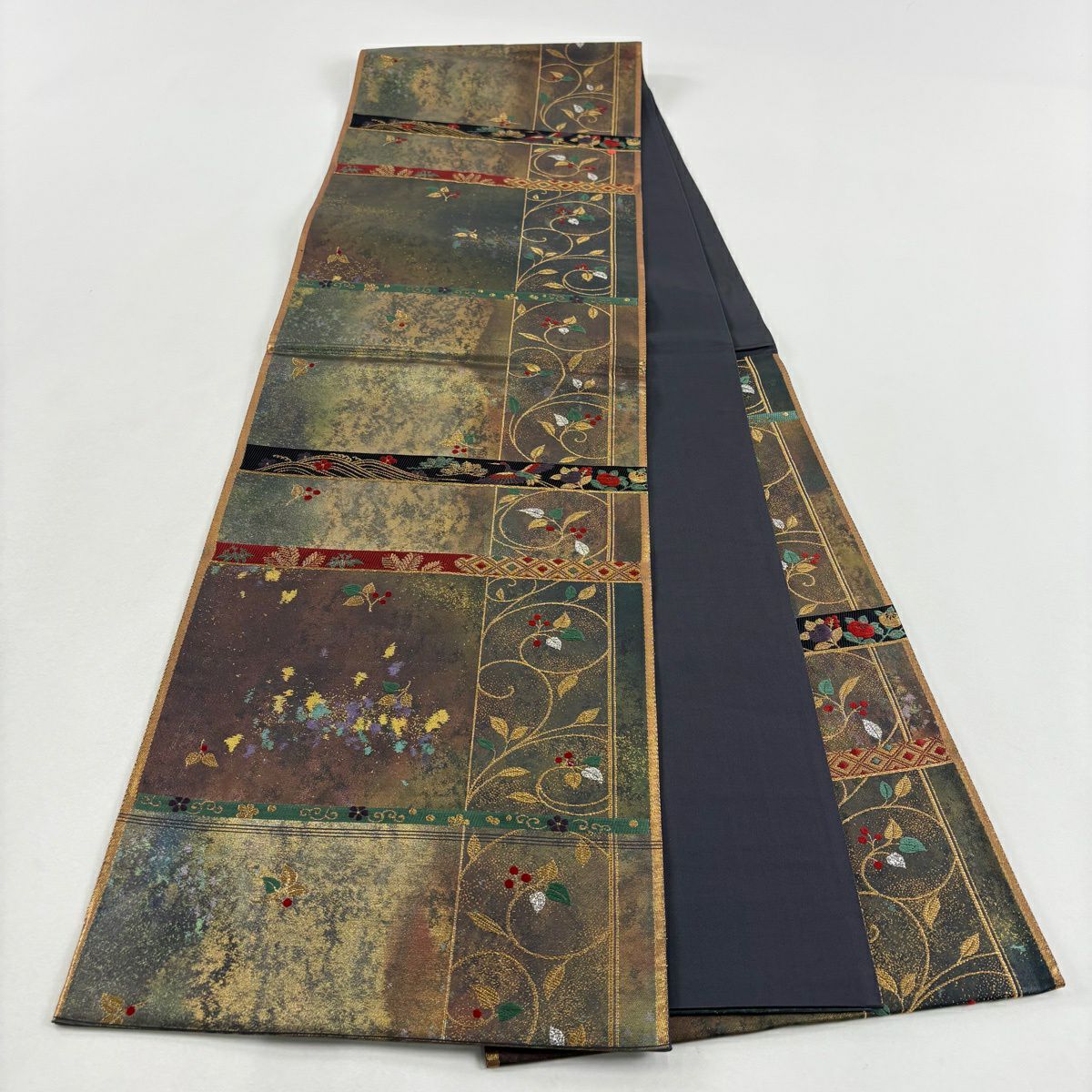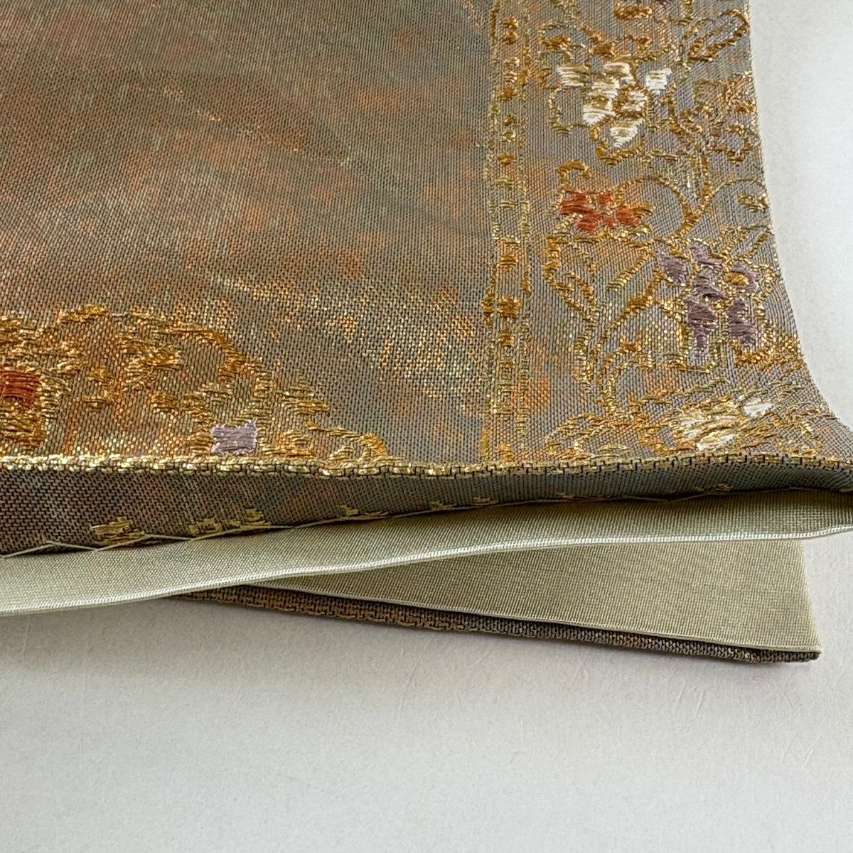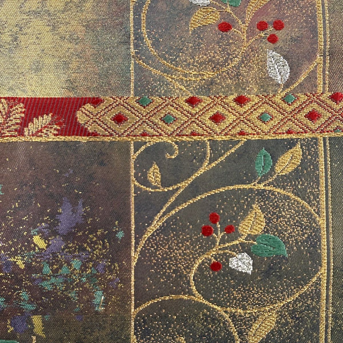 【美品】 袋帯 秀品 華文 霞 箔 金糸 茶緑色 六通 正絹