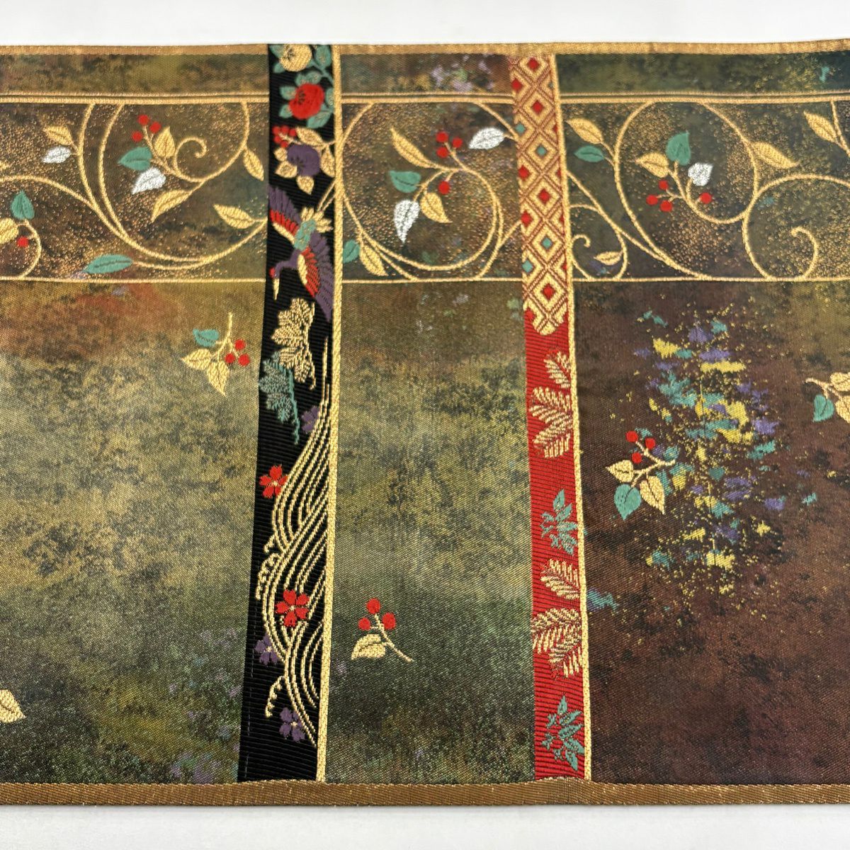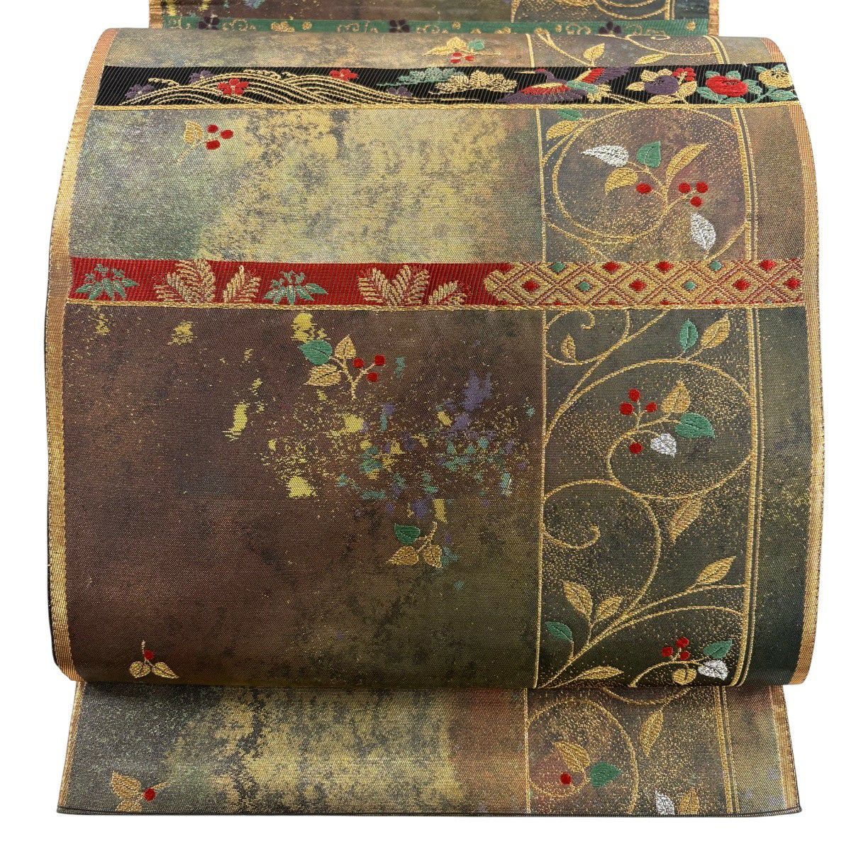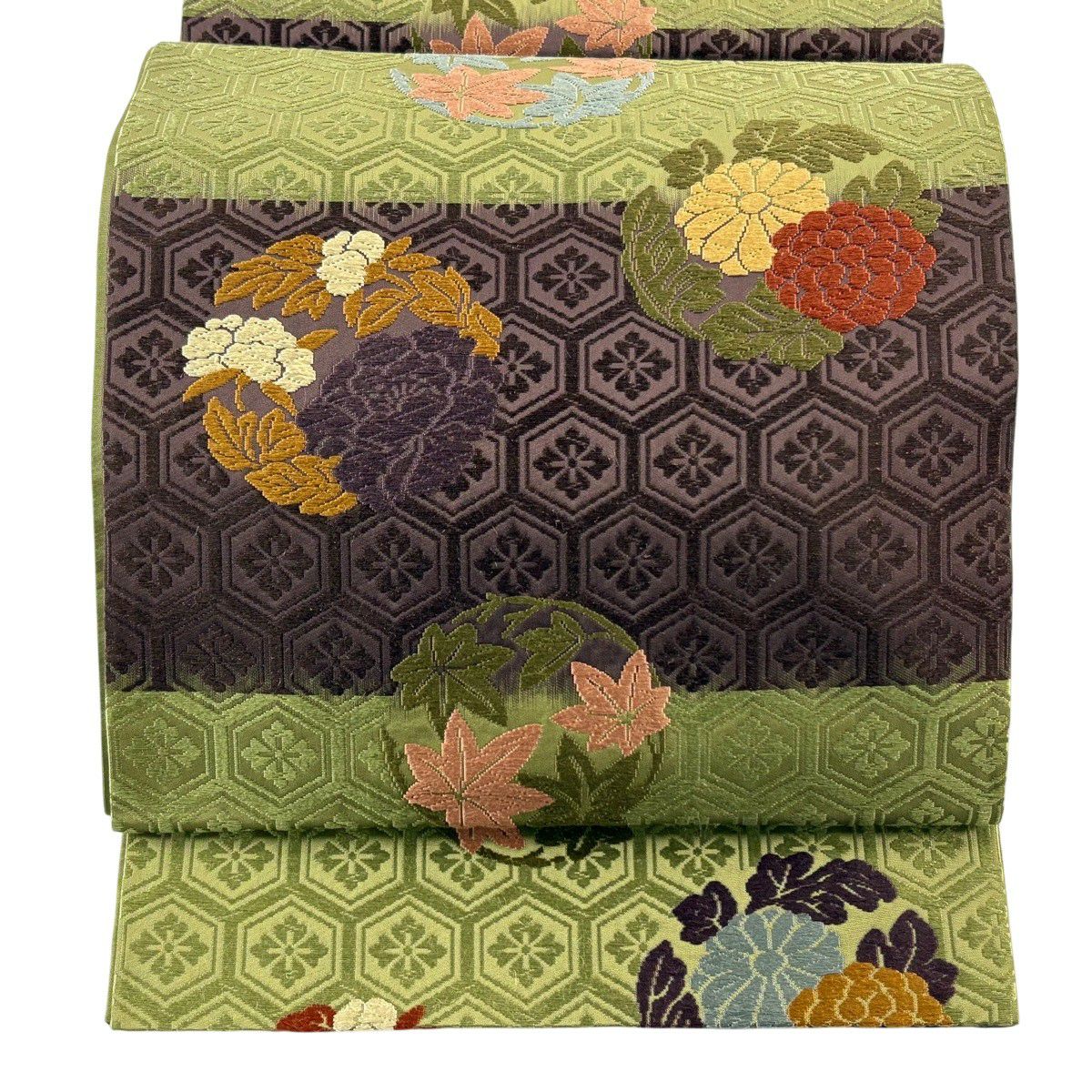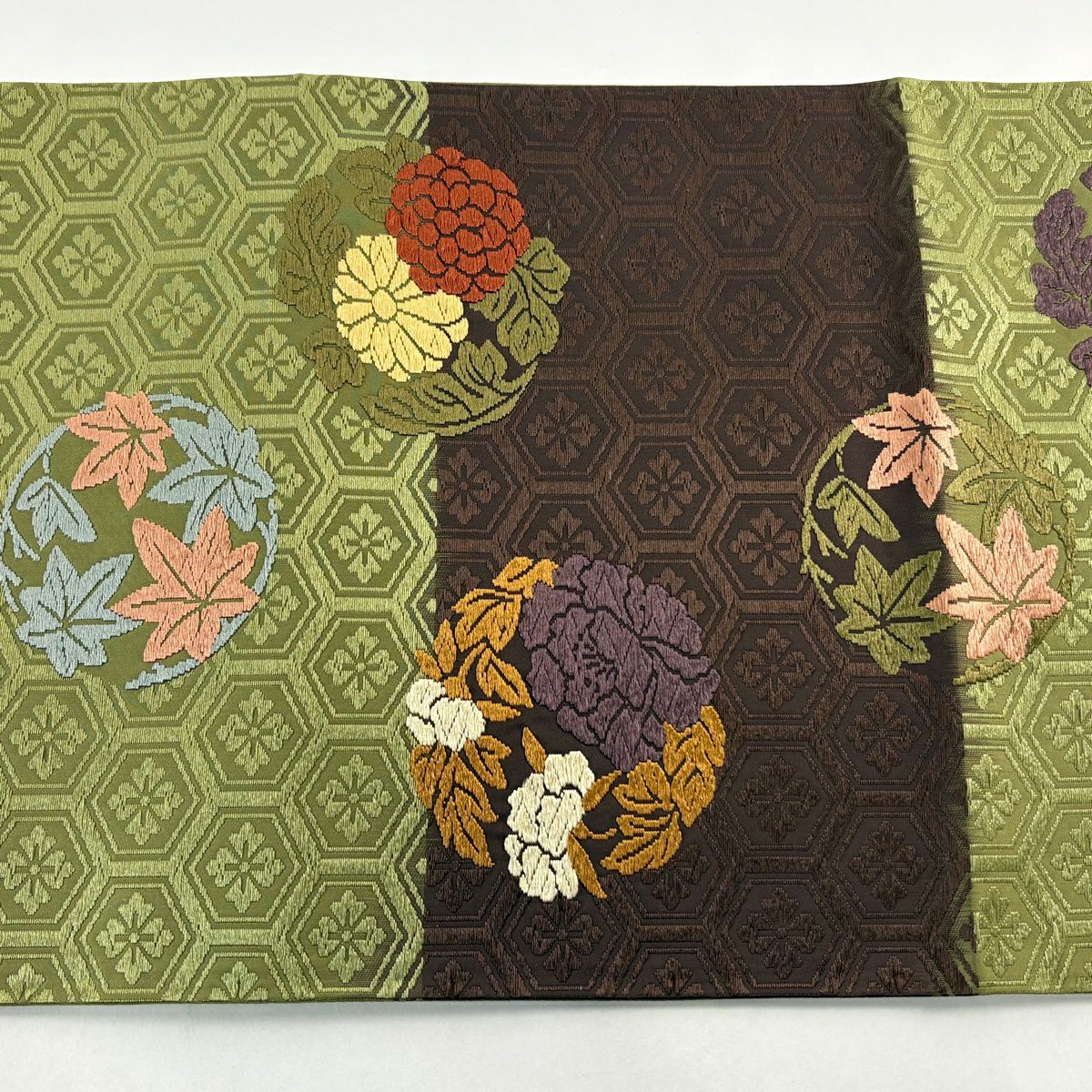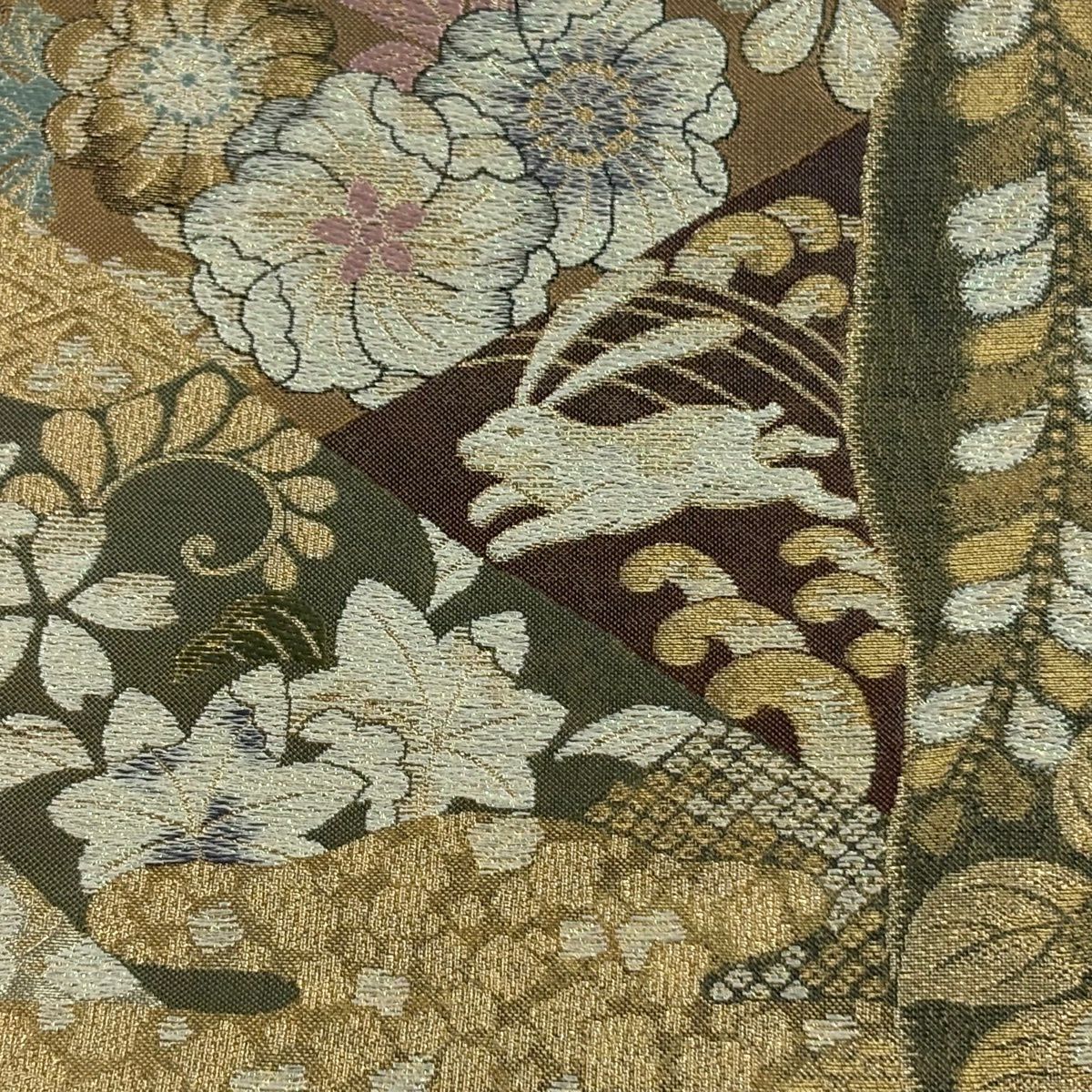 【美品】 袋帯 秀品 華文 霞 箔 金糸 茶緑色 六通 正絹