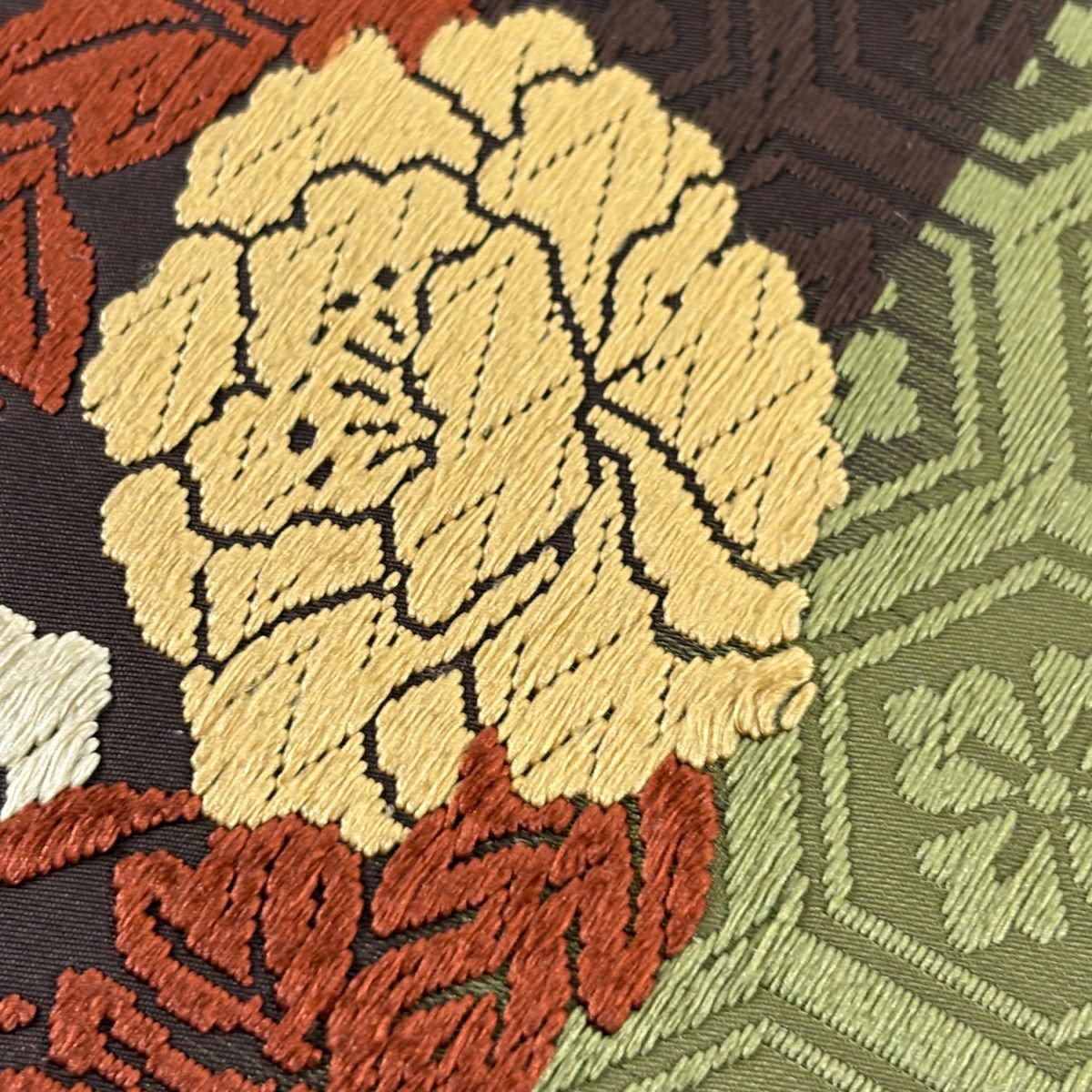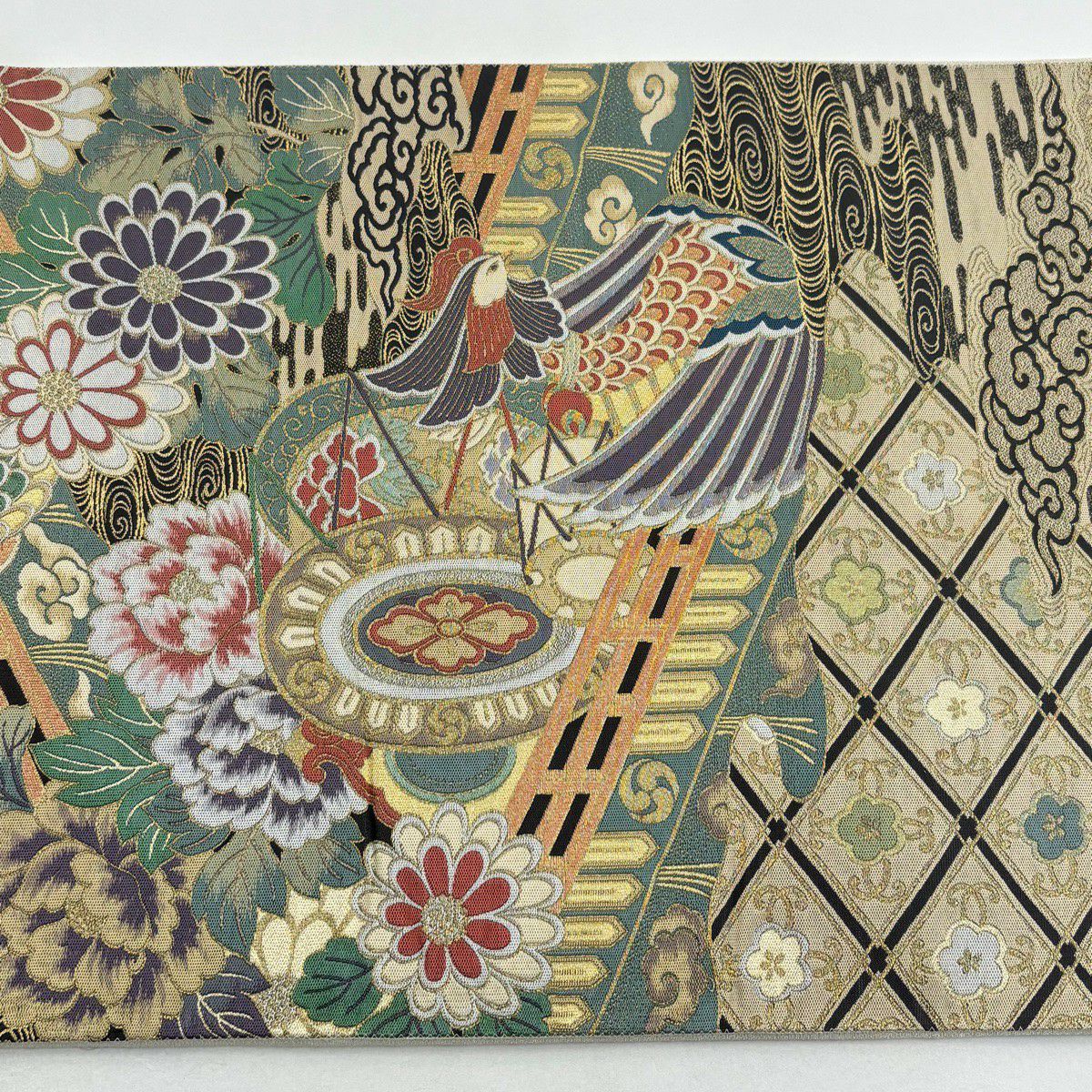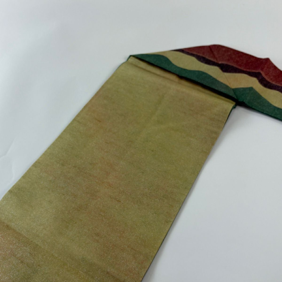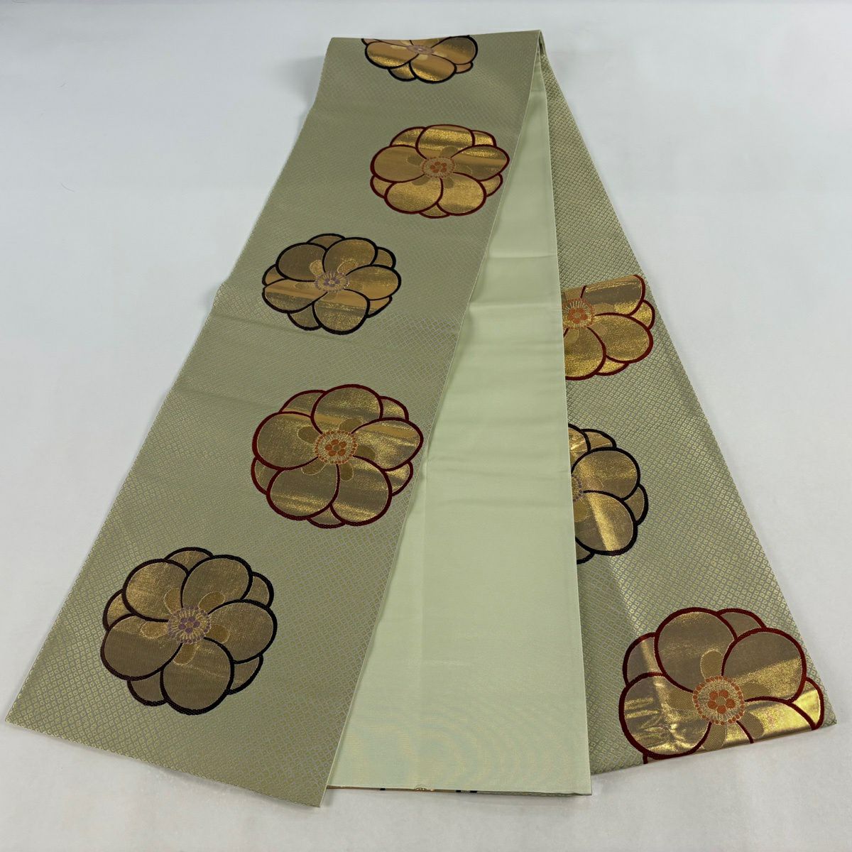 【美品】 袋帯 秀品 華文 霞 箔 金糸 茶緑色 六通 正絹