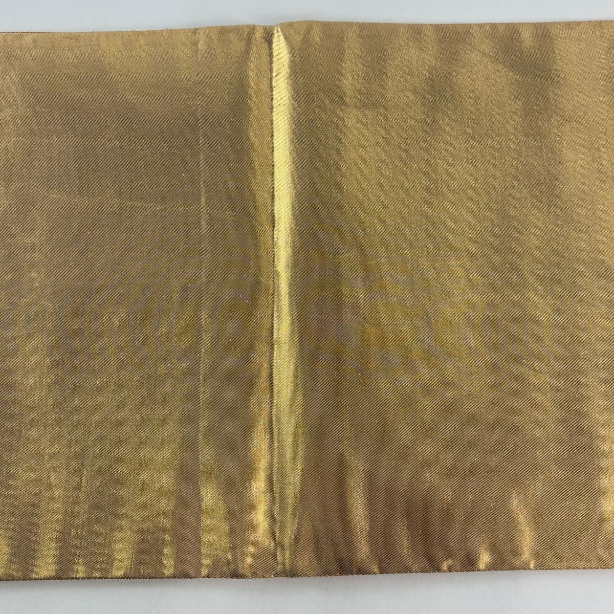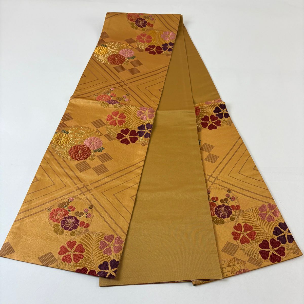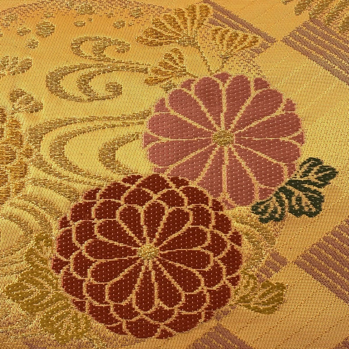 【美品】 袋帯 秀品 幾何学模様 金糸 山吹茶色 全通 正絹