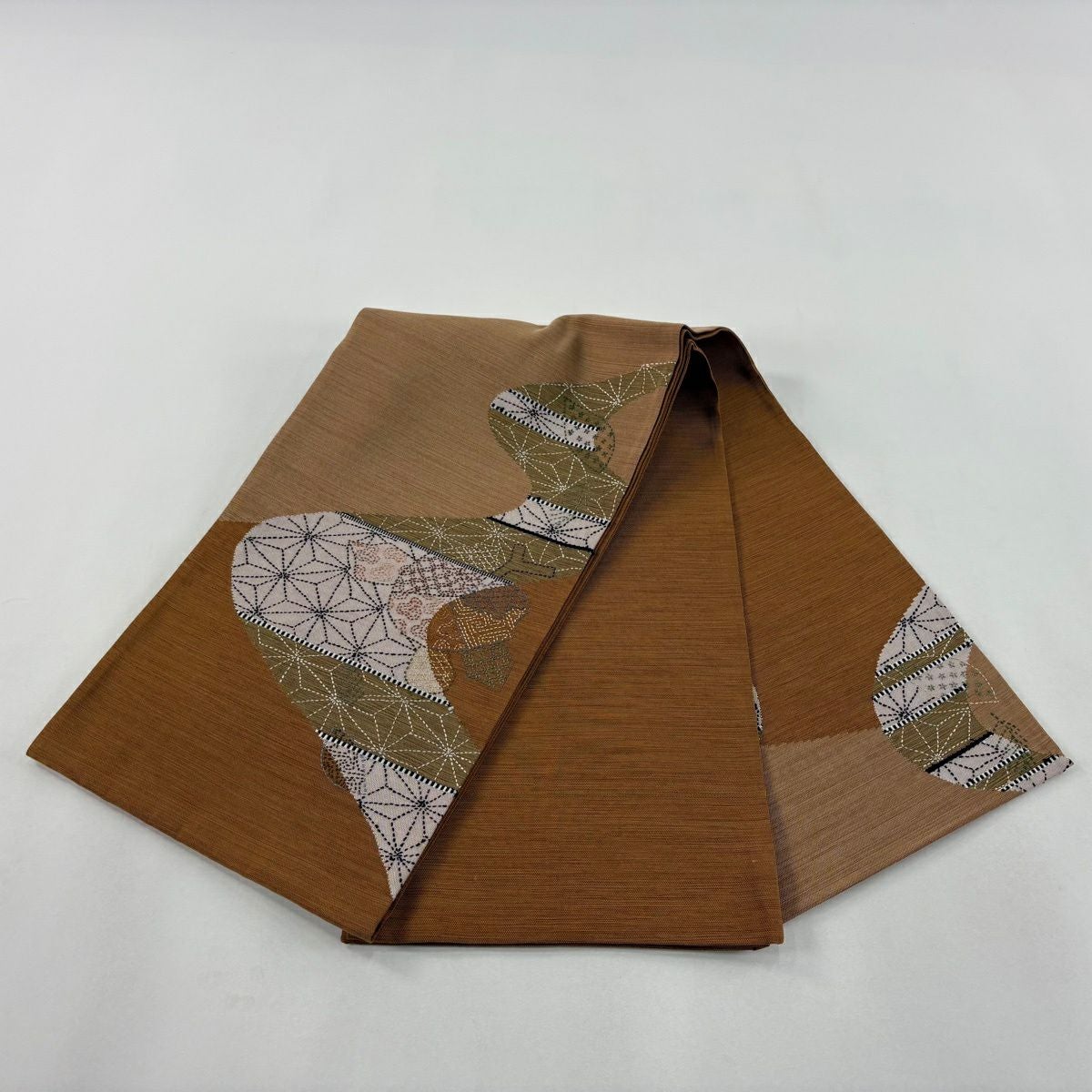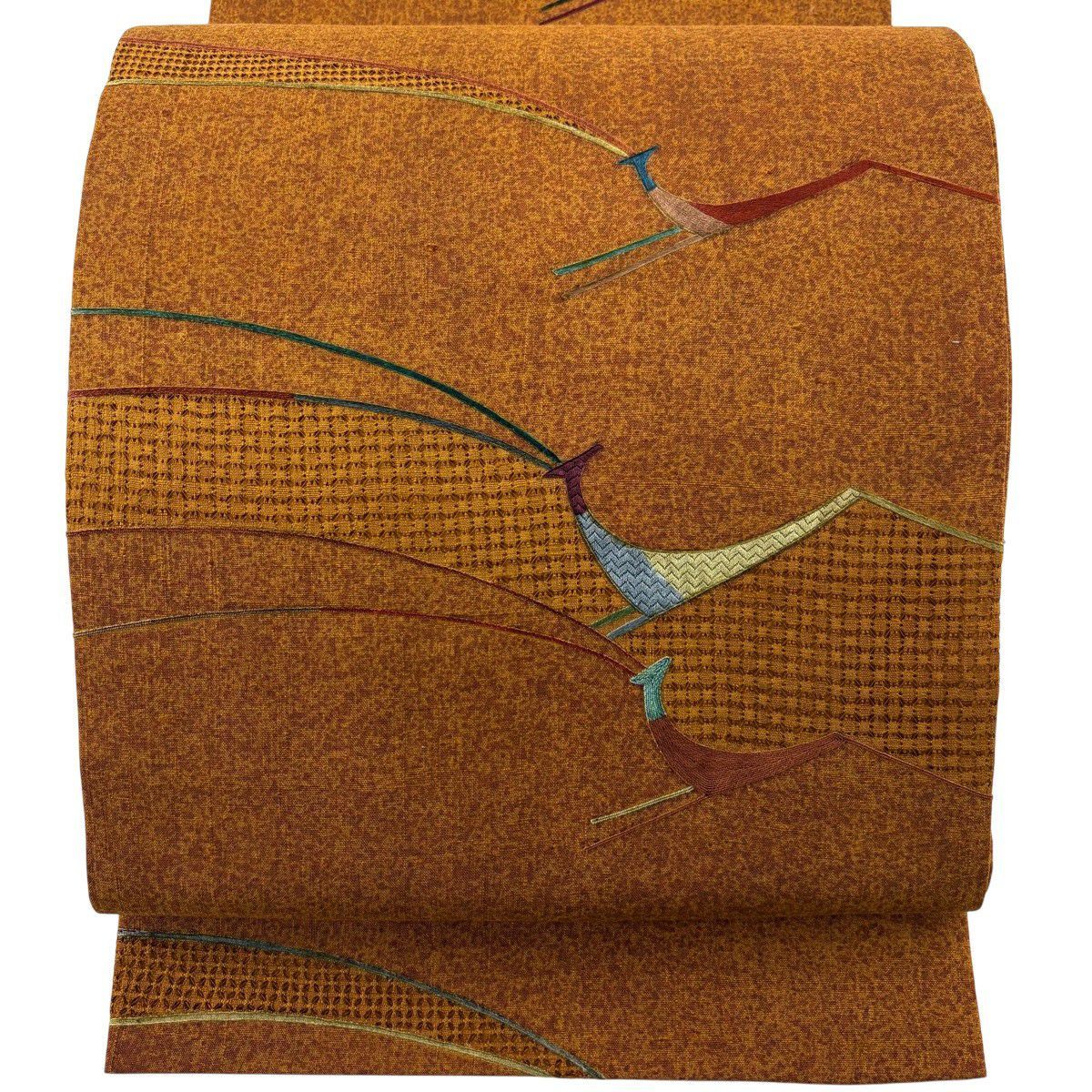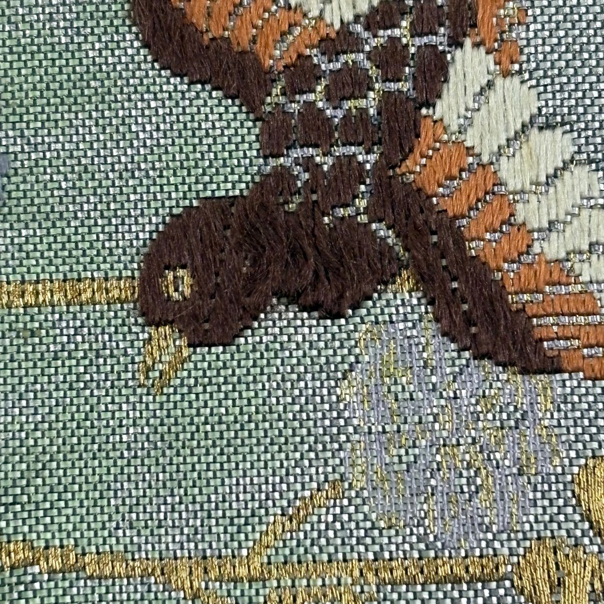 【美品】 袋帯 秀品 紬地 動物 刺繍 山吹茶色 全通 正絹