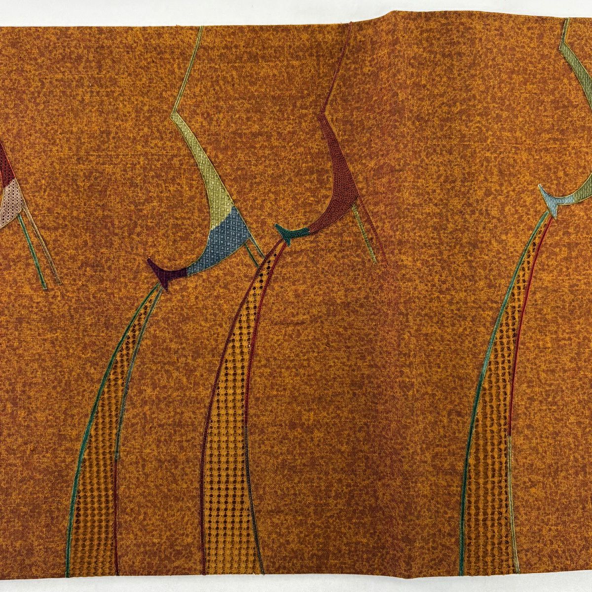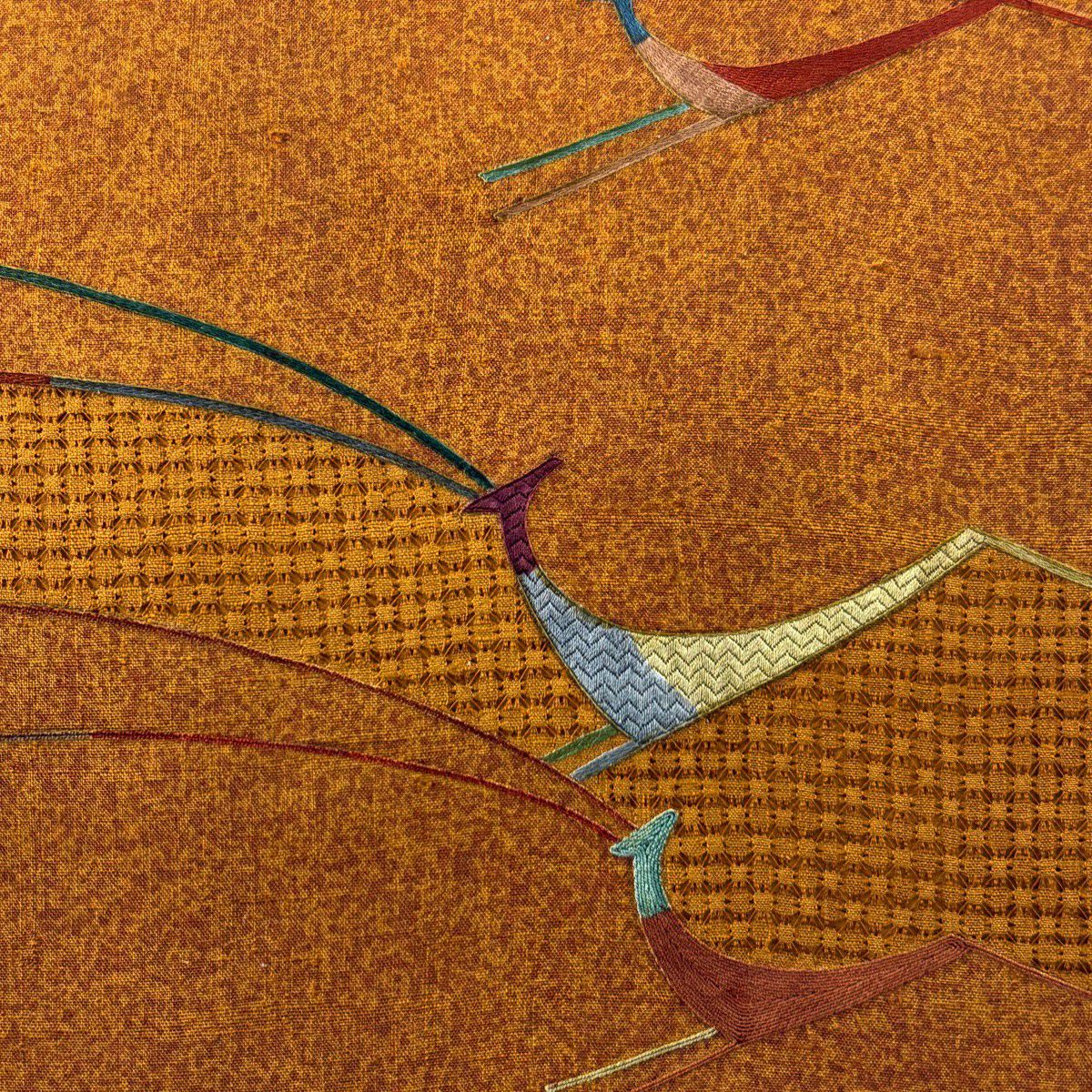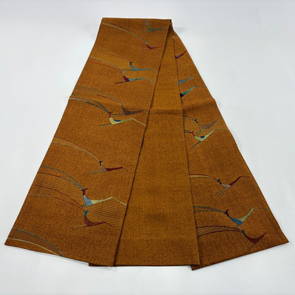 【美品】 袋帯 秀品 紬地 動物 刺繍 山吹茶色 全通 正絹