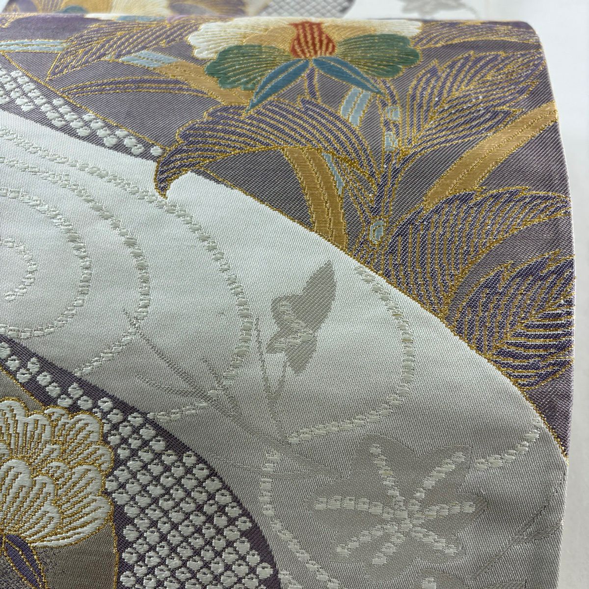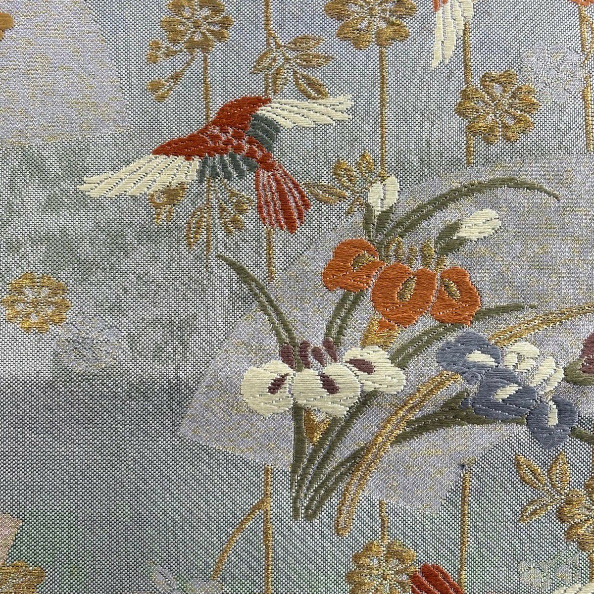 【美品】 袋帯 秀品 扇面 花鳥 金糸 箔 灰紫 六通 正絹
