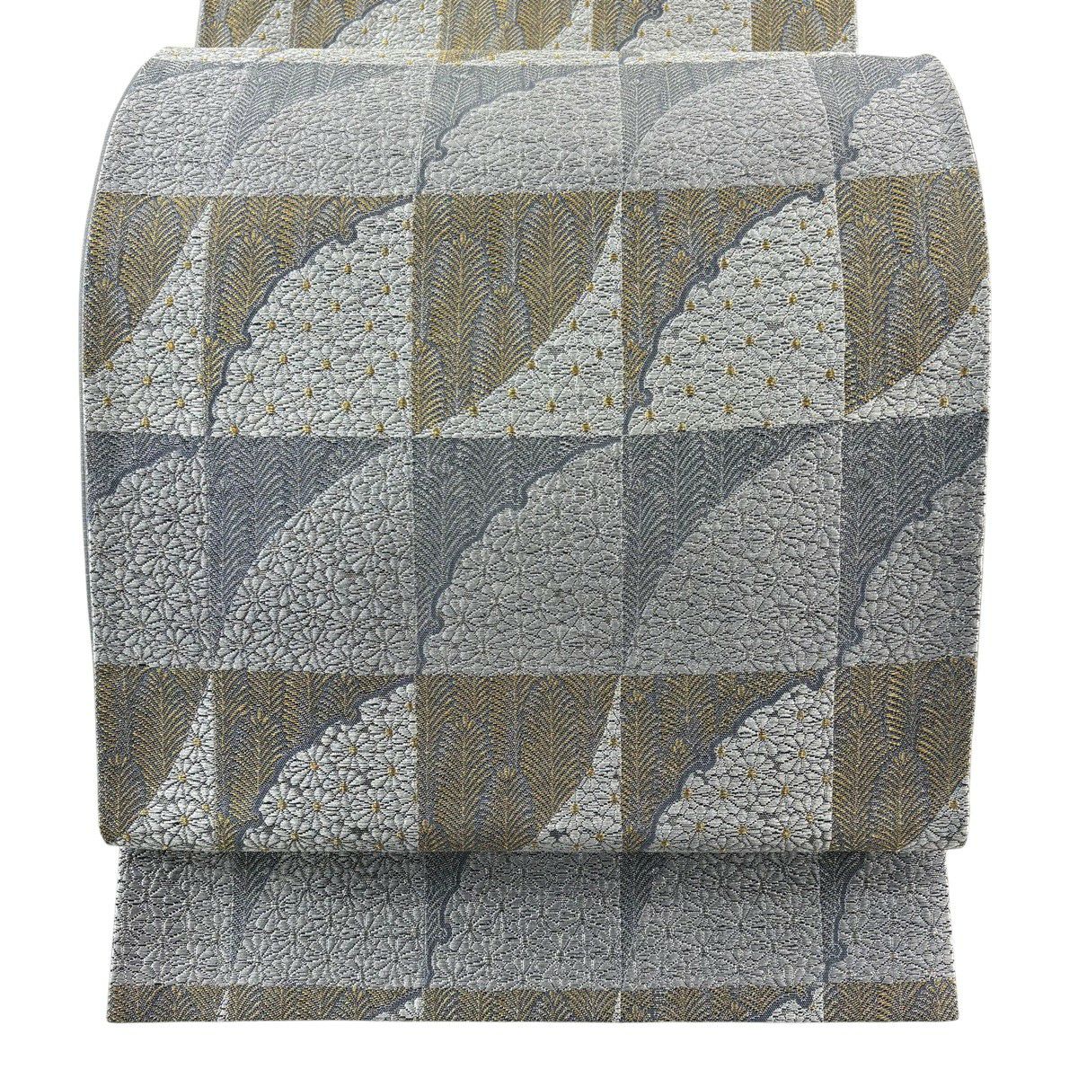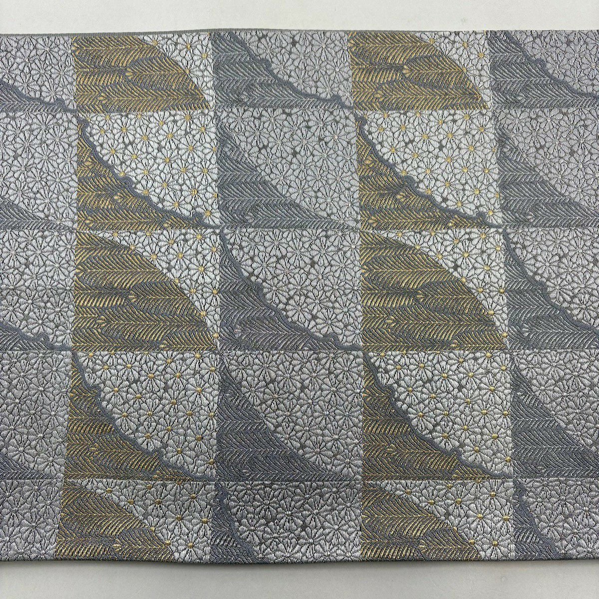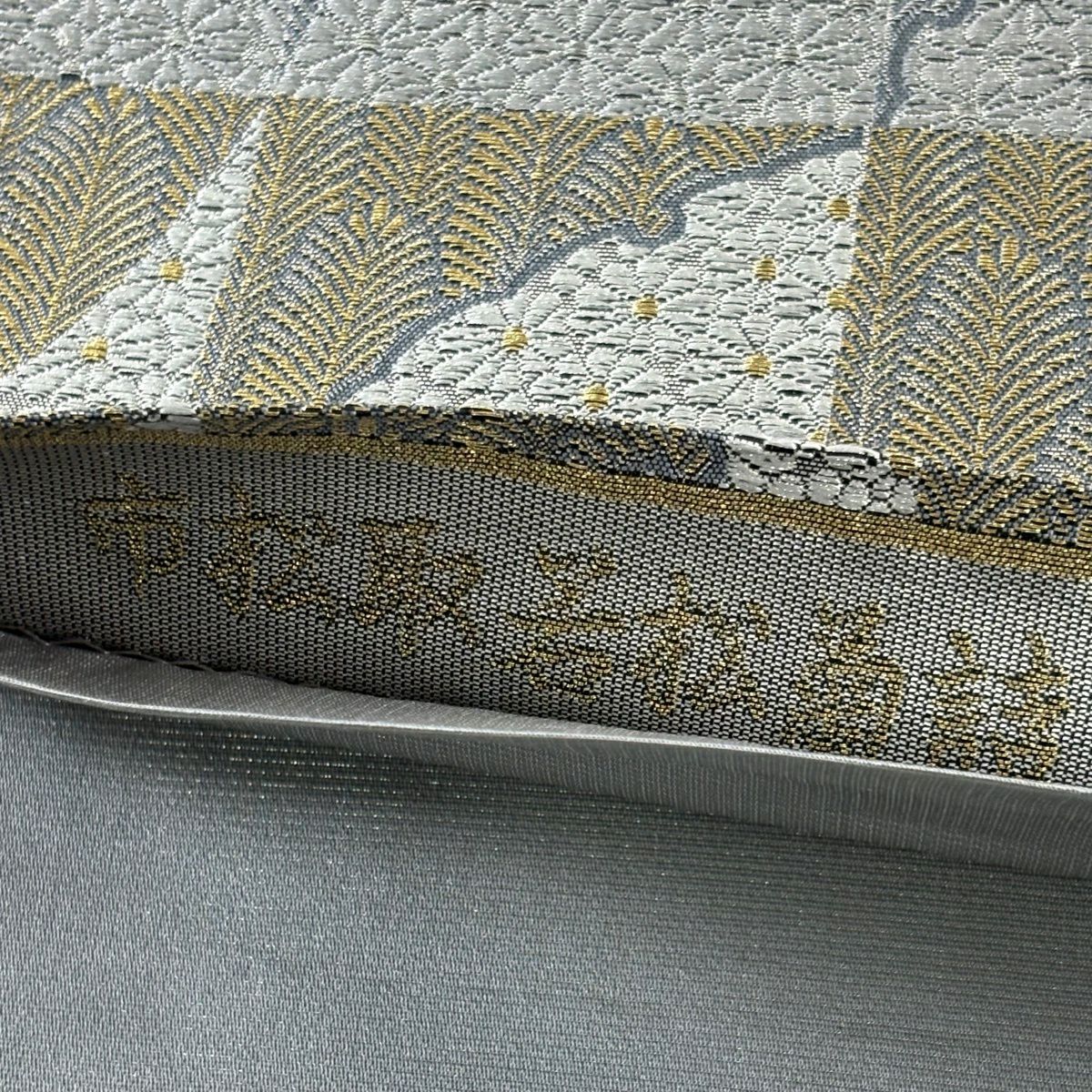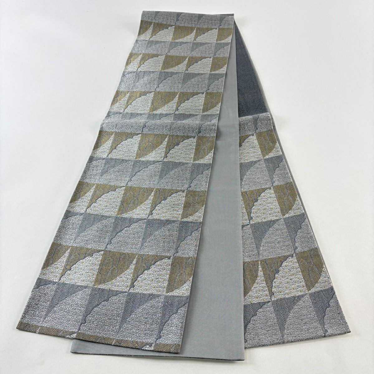 名古屋帯 秀品 八寸名古屋帯 松葉仕立て 幾何学 金糸 灰白 正絹