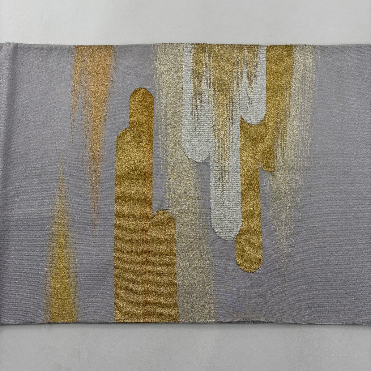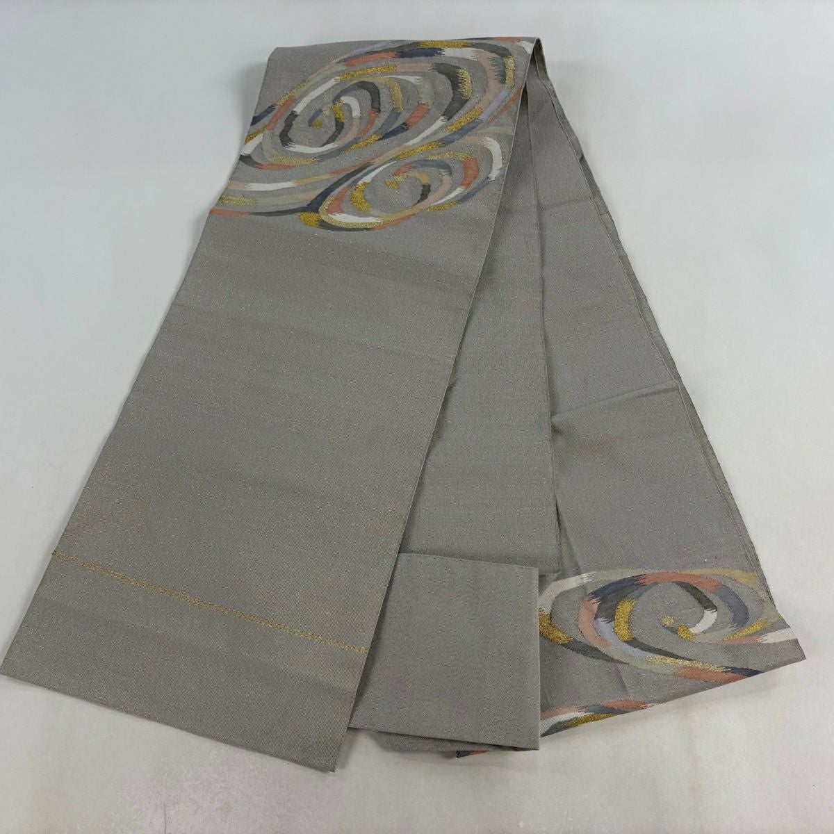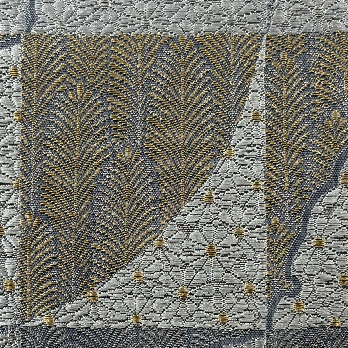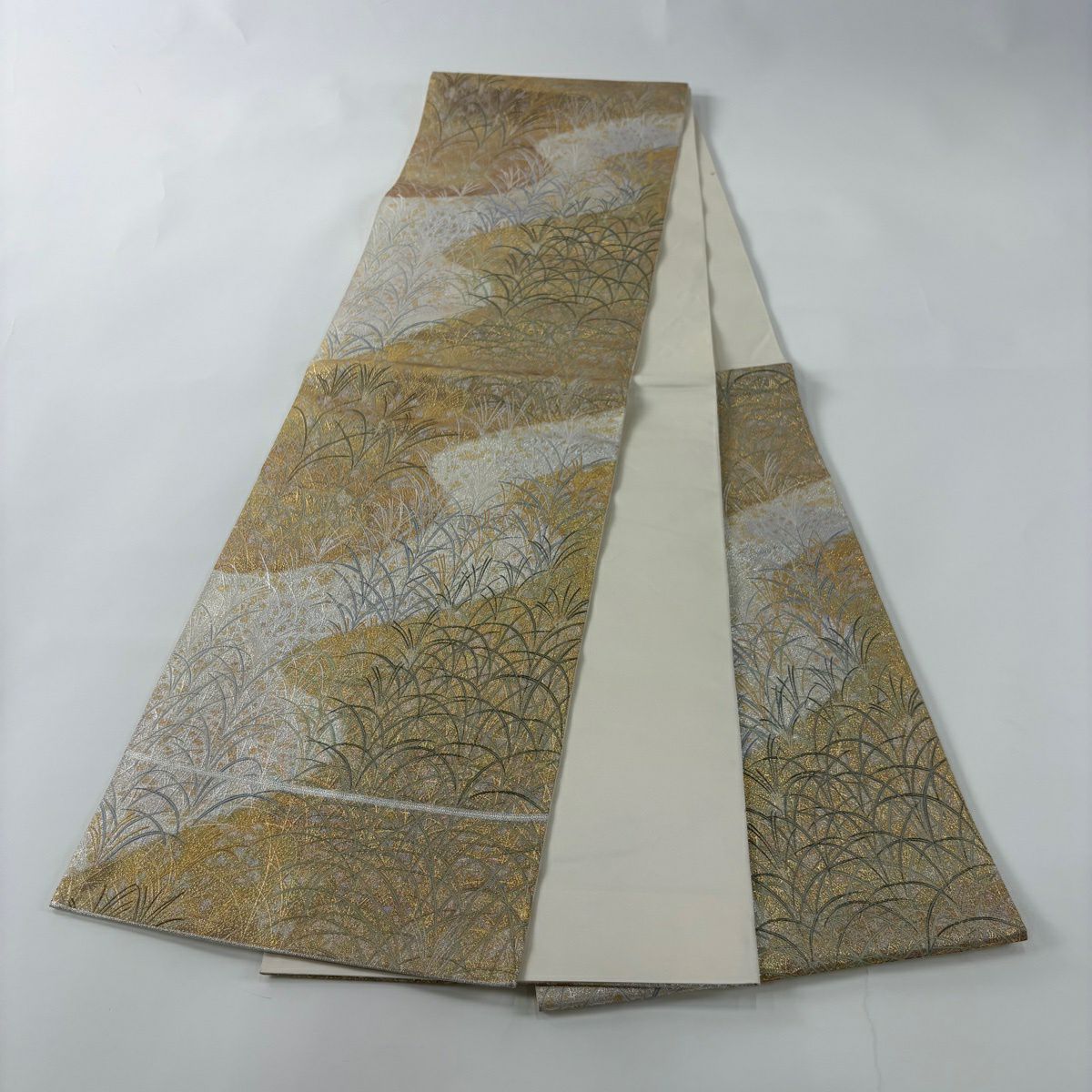 名古屋帯 秀品 八寸名古屋帯 松葉仕立て 幾何学 金糸 灰白 正絹