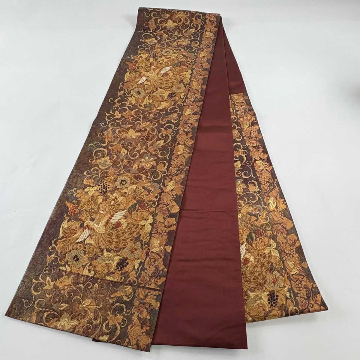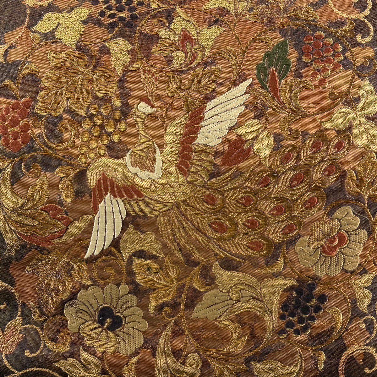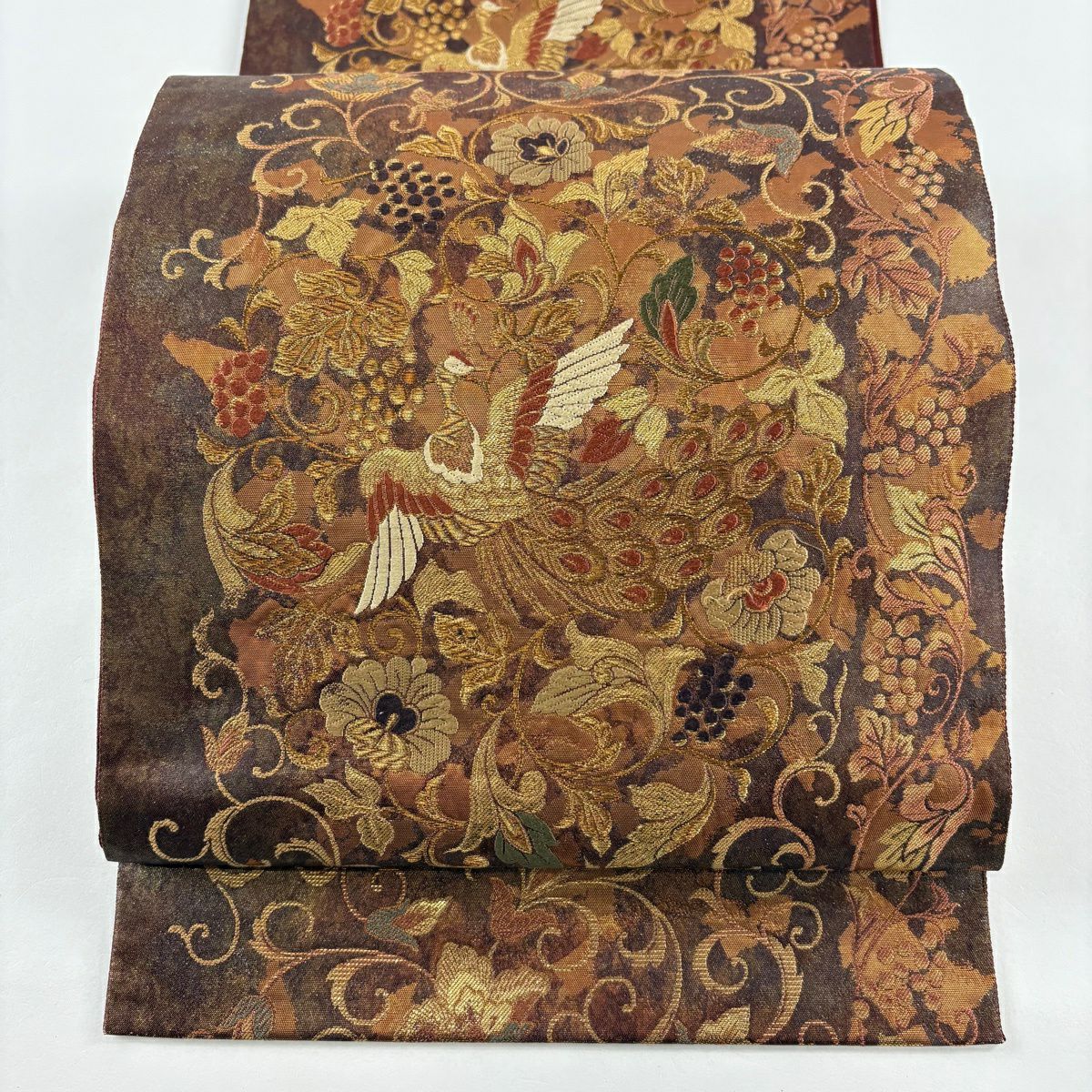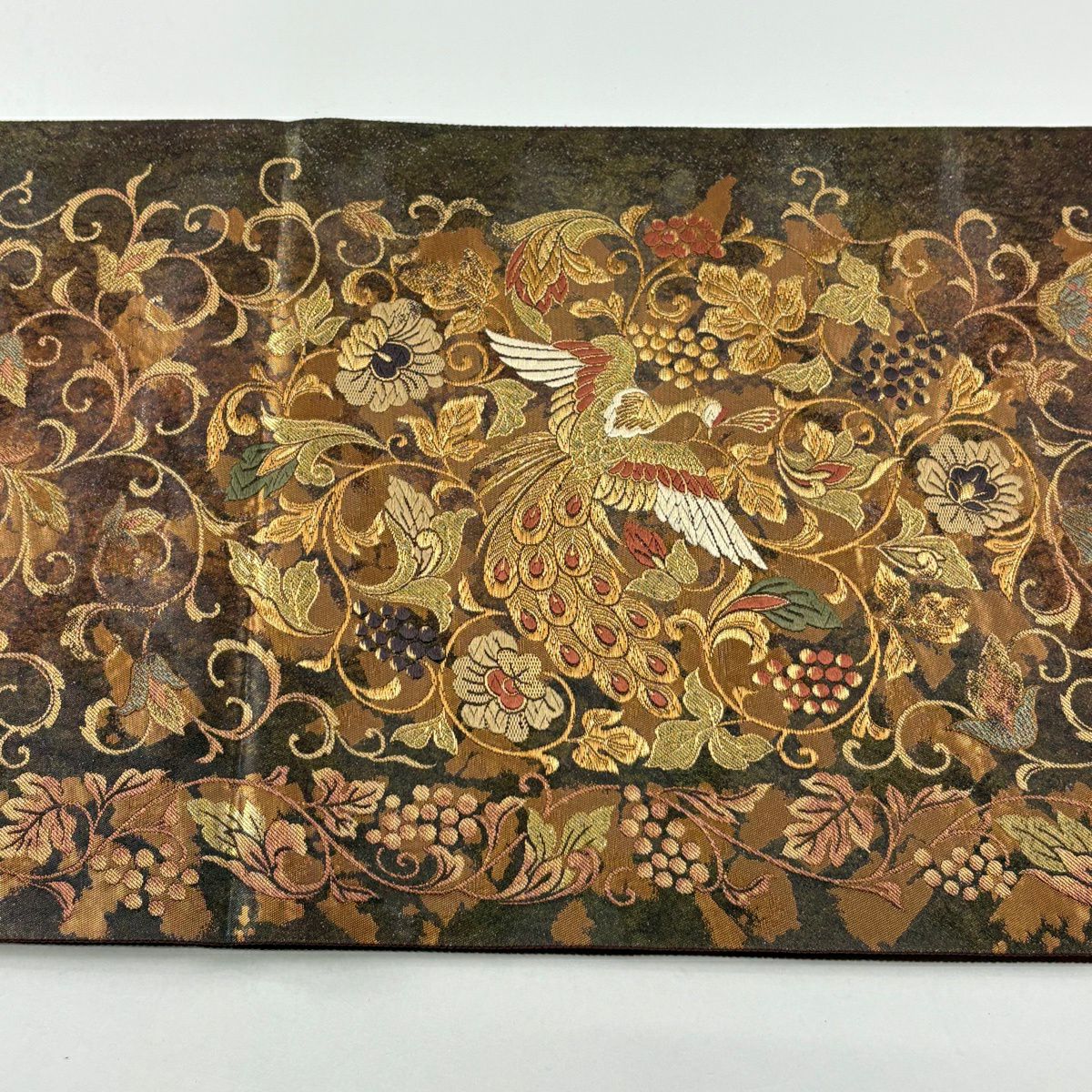 【美品】 袋帯 秀品 花鳥 葡萄 箔 金糸 茶色 六通 正絹