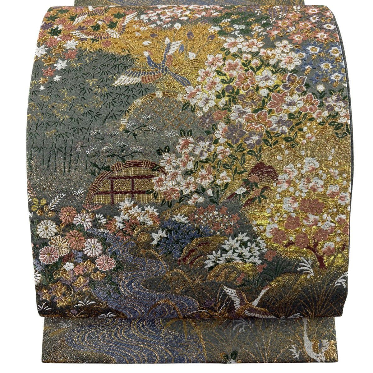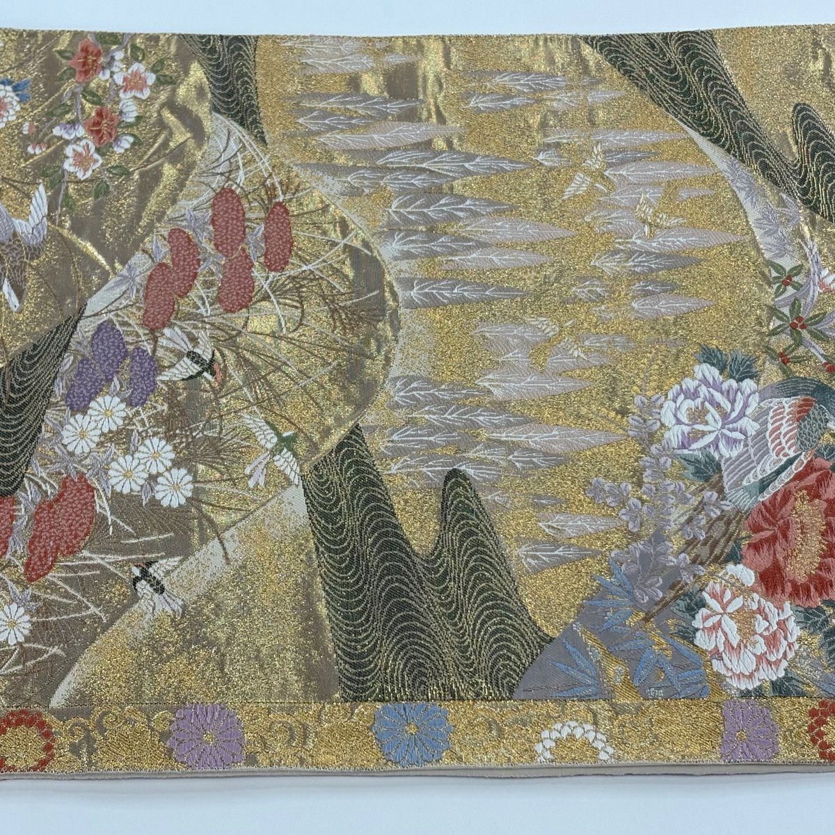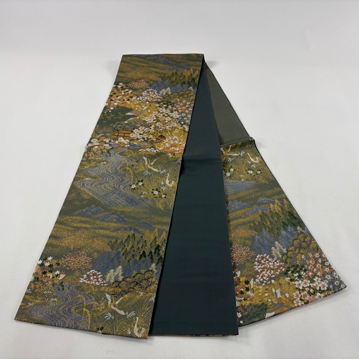 【美品】 袋帯 秀品 鶴 草花 刺繍 金糸 灰緑 六通 正絹