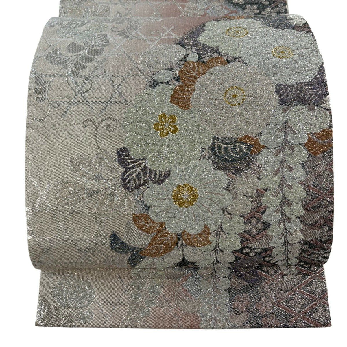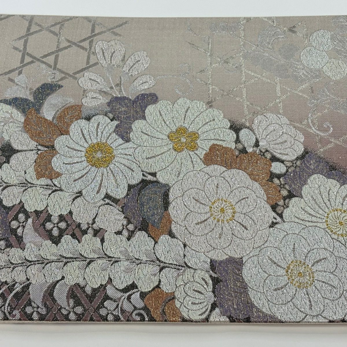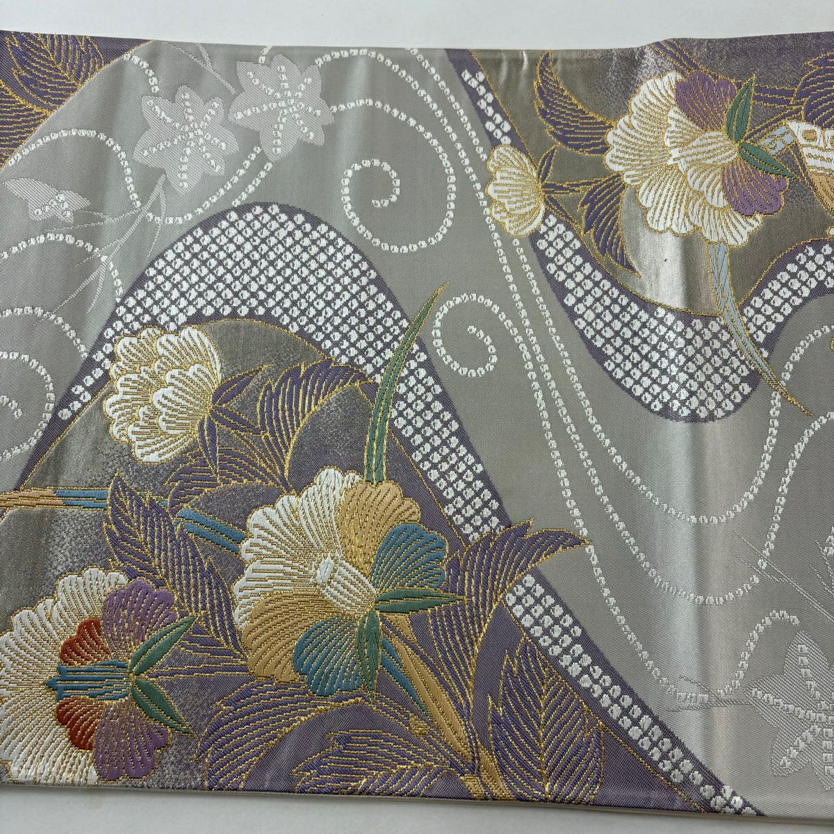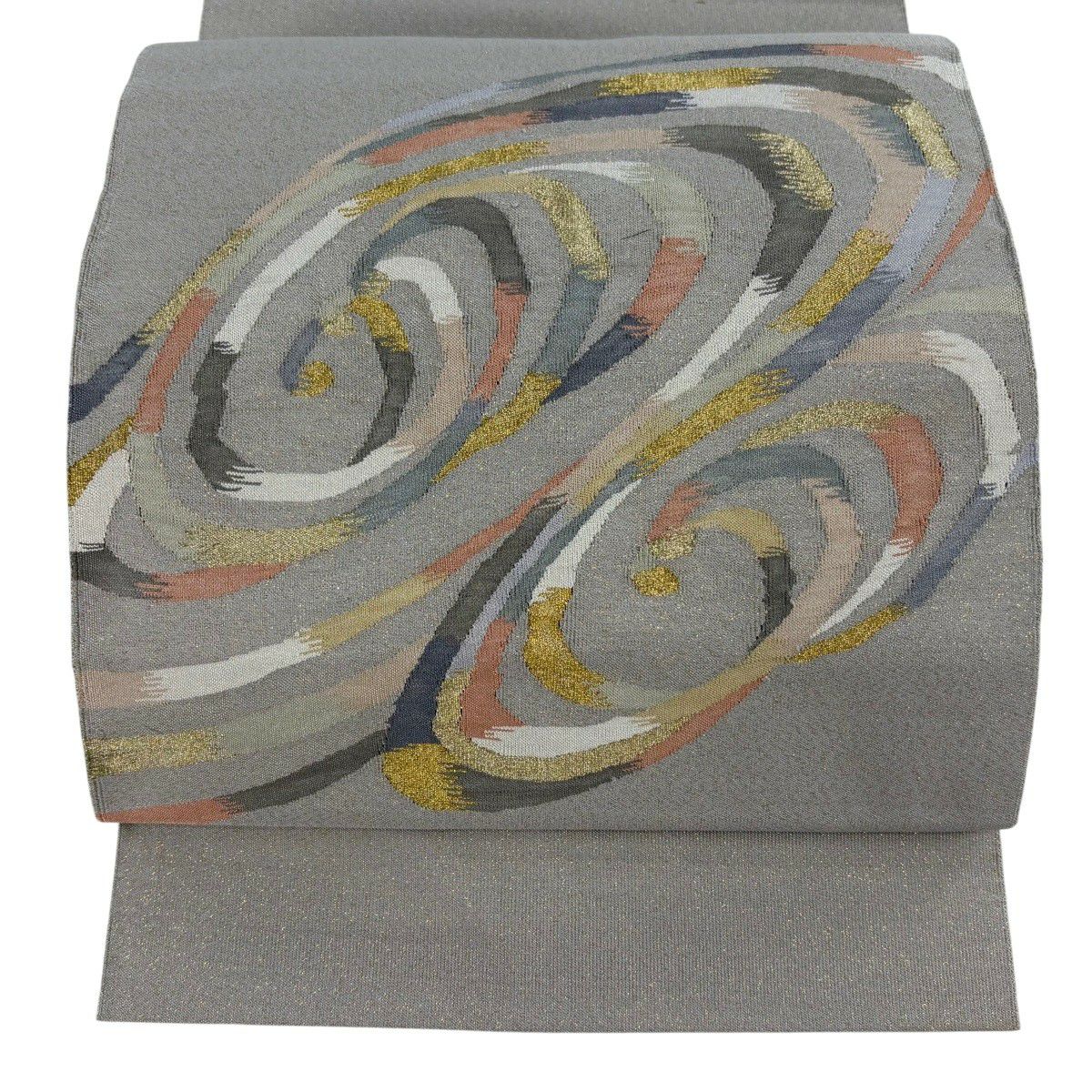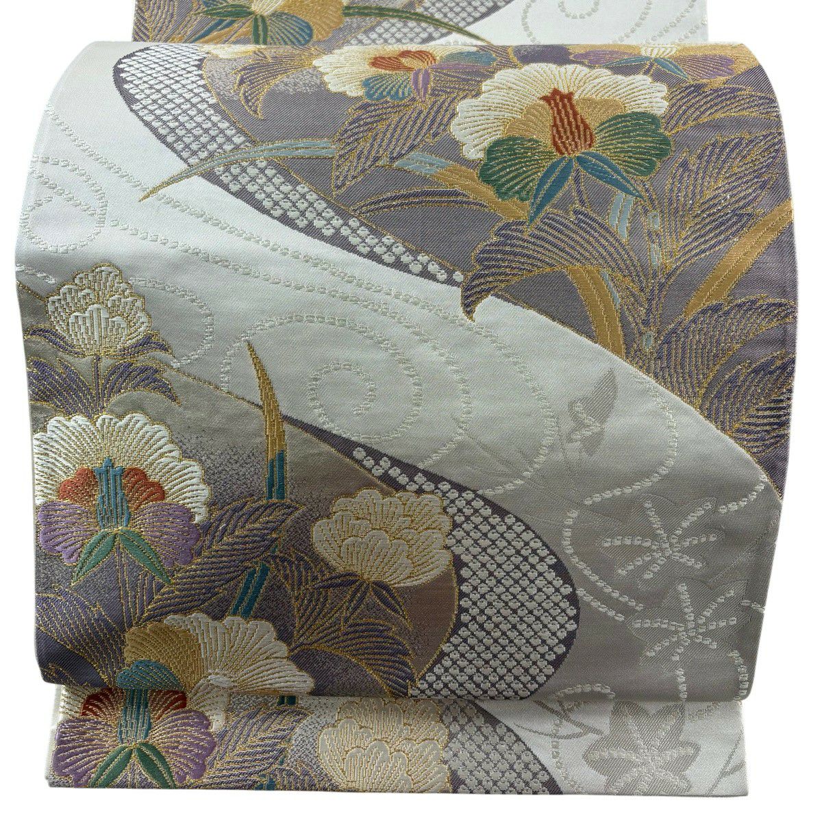 【美品】 袋帯 秀品 夏帯 幾何学 花 灰色 お太鼓柄 正絹