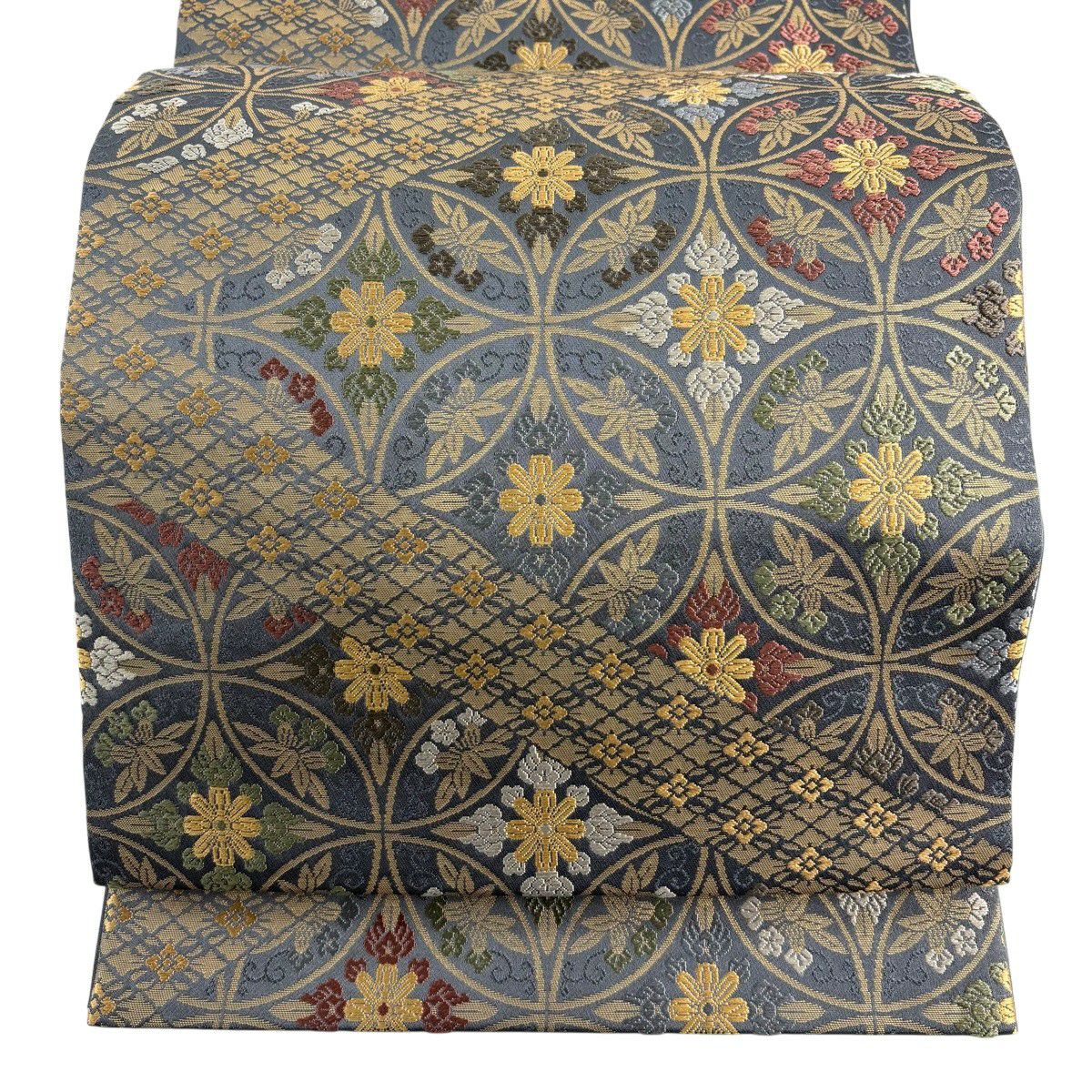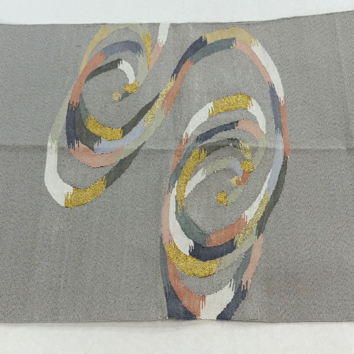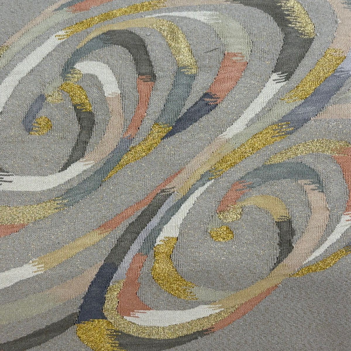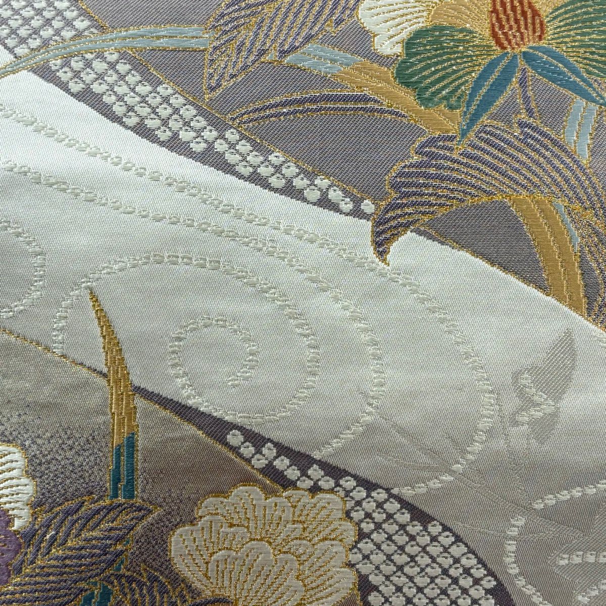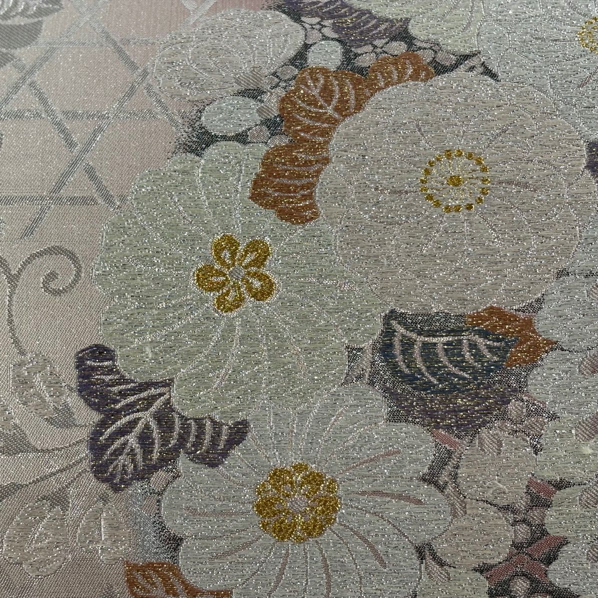 【美品】 袋帯 秀品 夏帯 幾何学 花 灰色 お太鼓柄 正絹