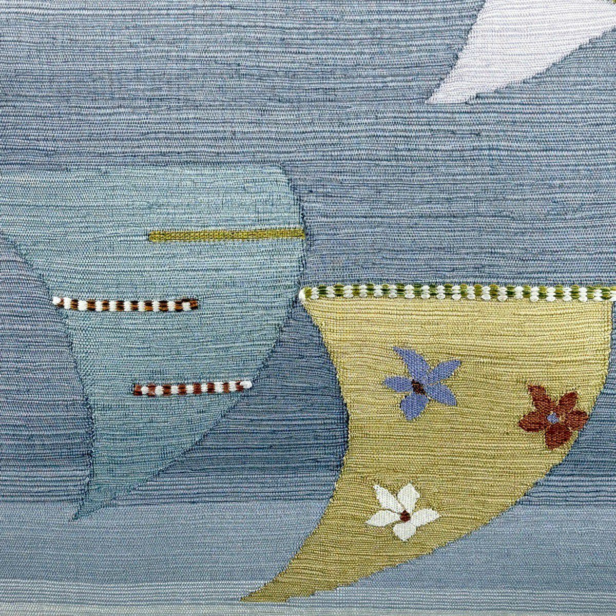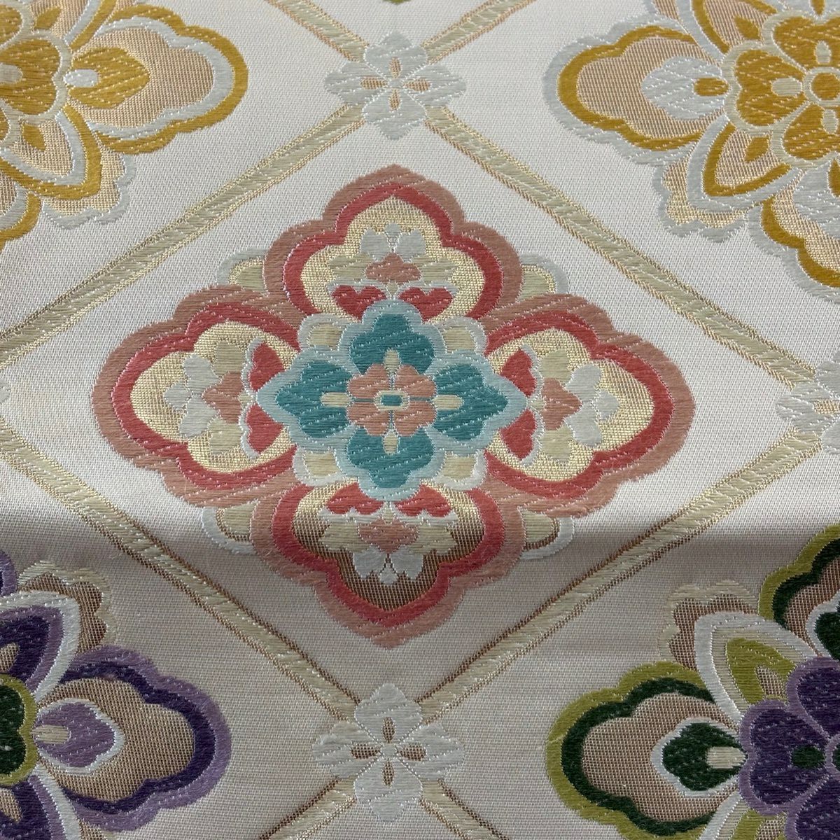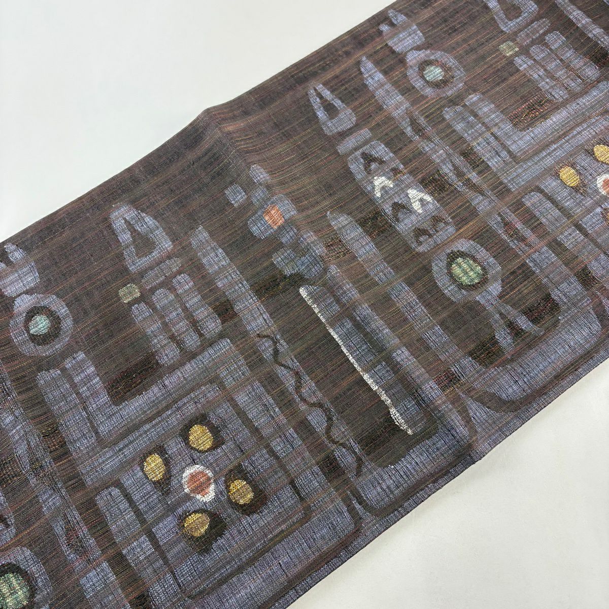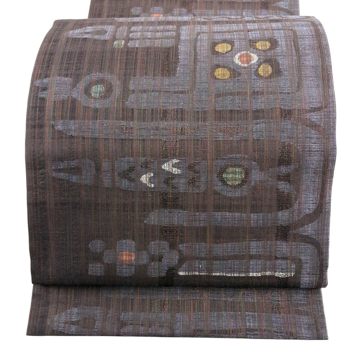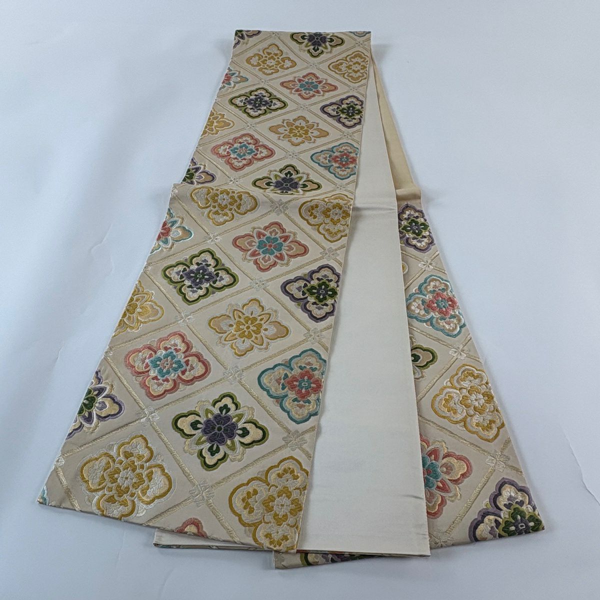【美品】 袋帯 秀品 夏帯 幾何学 花 灰色 お太鼓柄 正絹