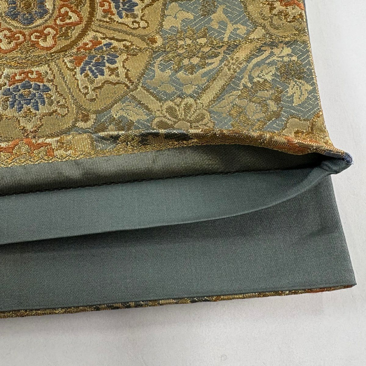 【美品】 袋帯 秀品 瑞祥聚宝文 七宝 箔 灰緑 六通 正絹