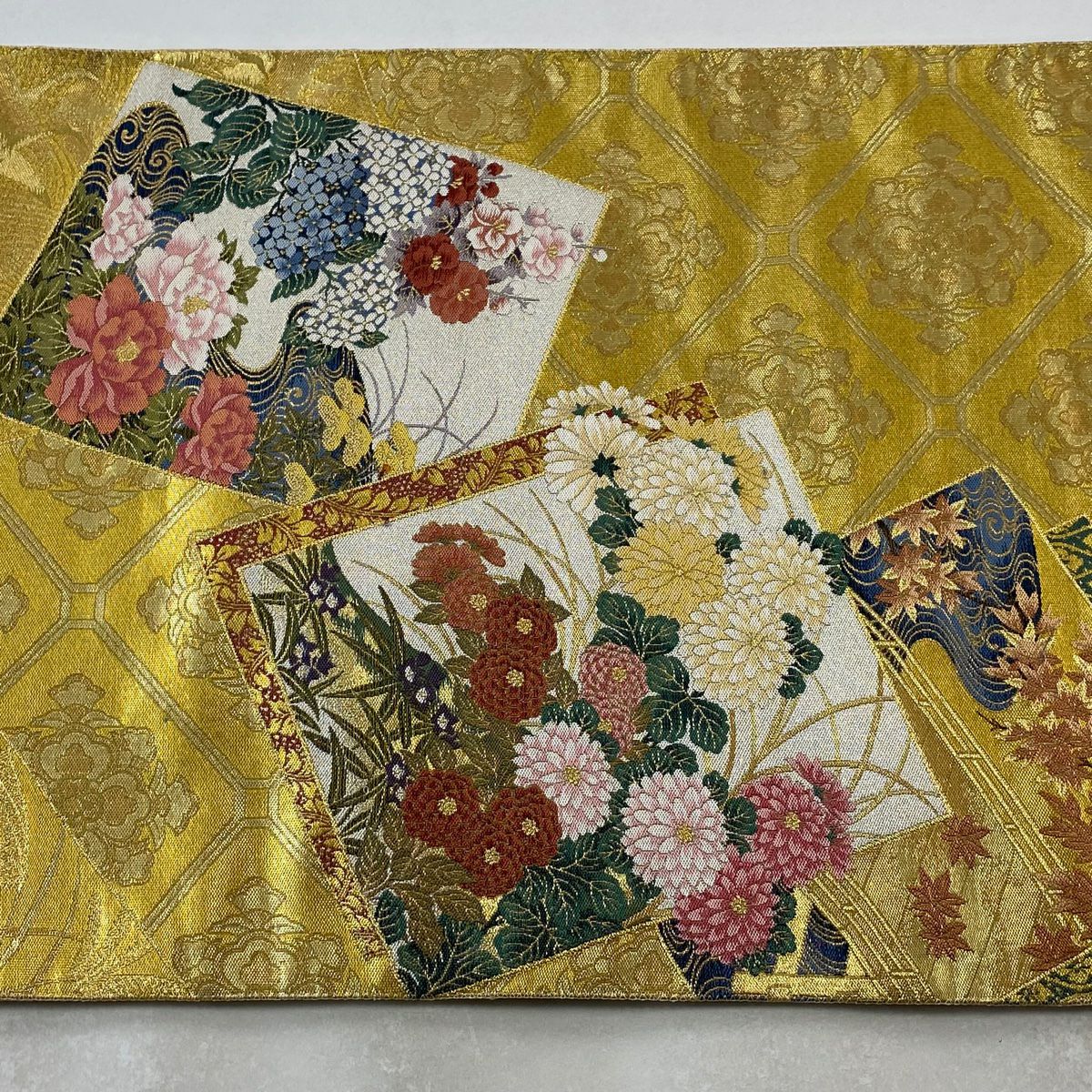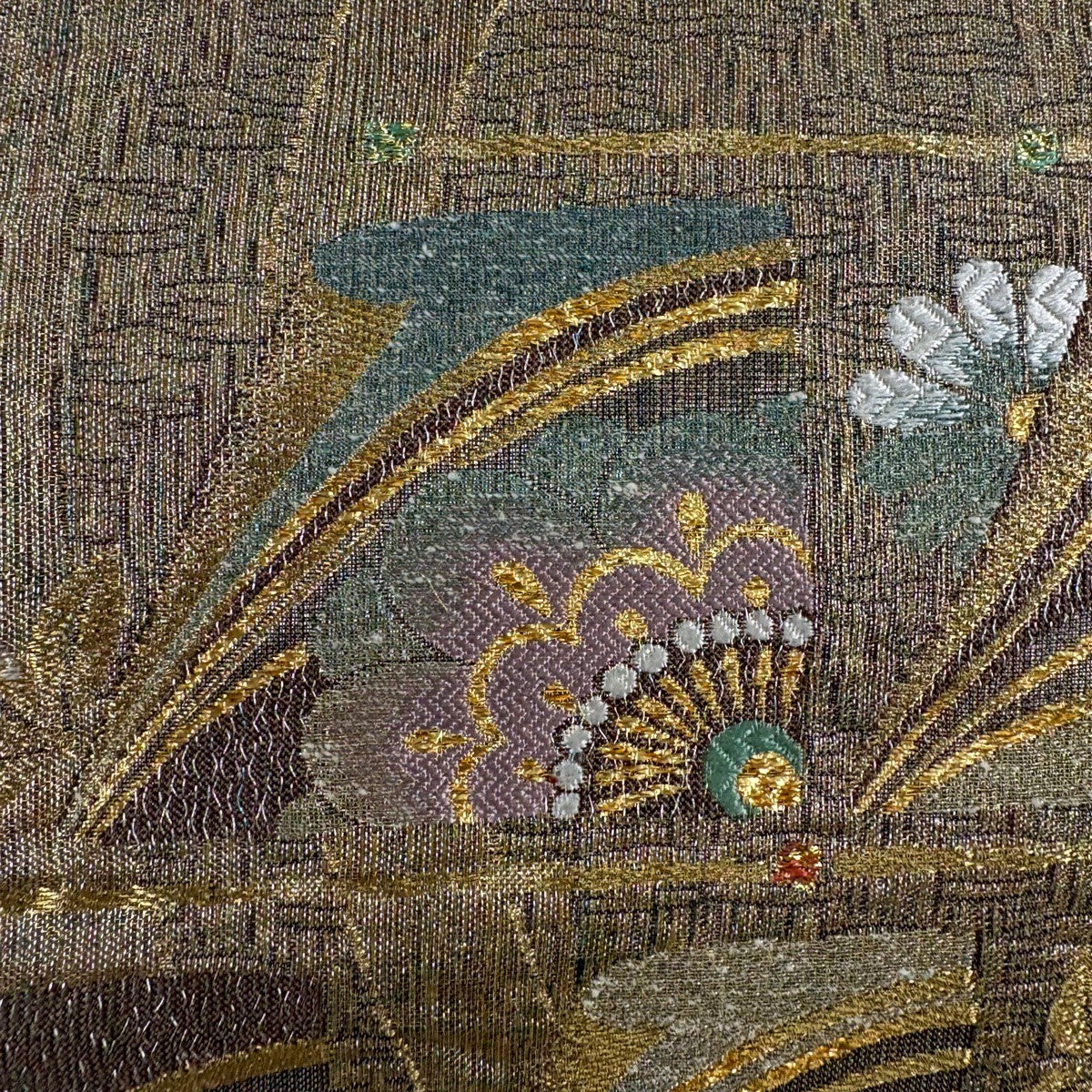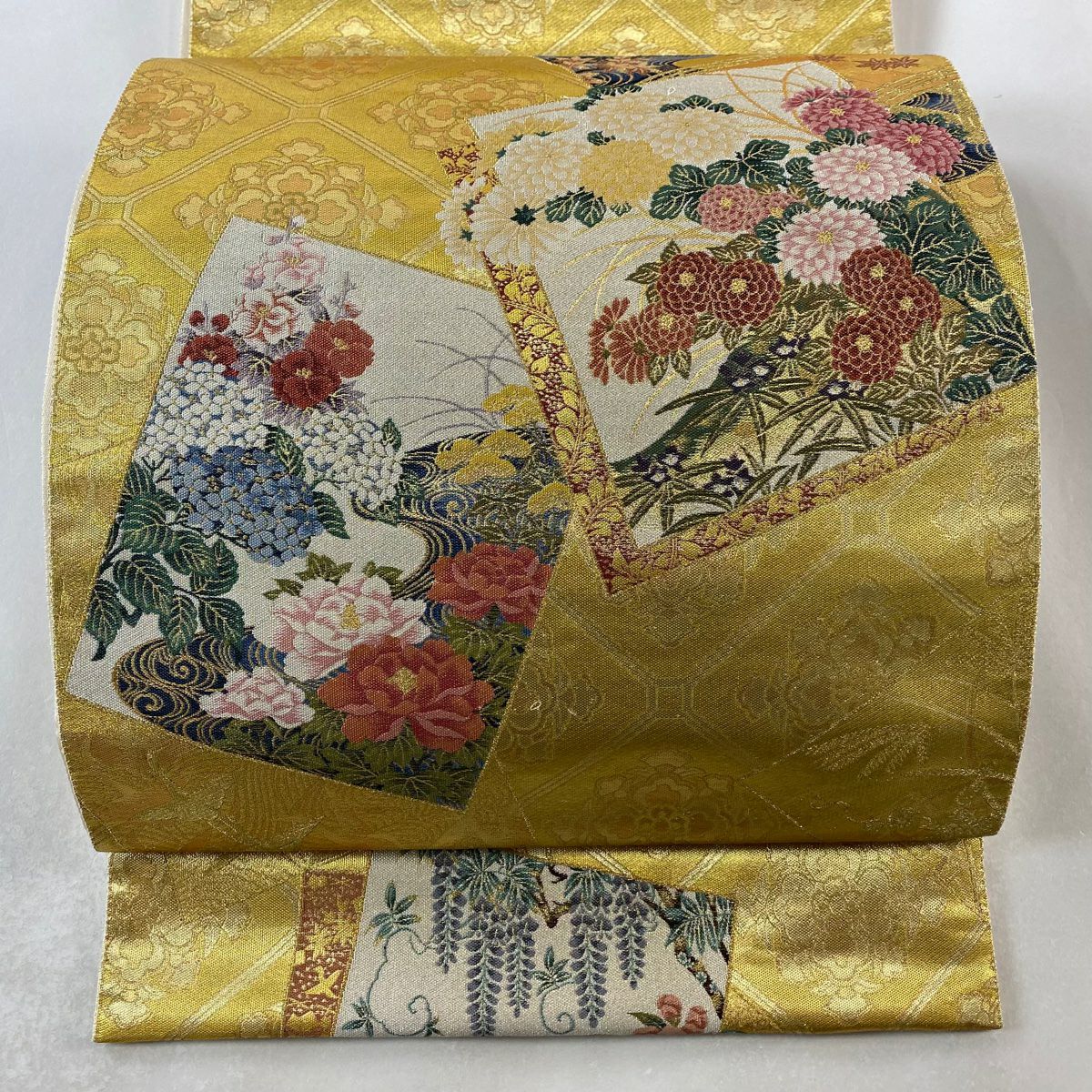 袋帯 美品 秀品 色紙 草花 金銀糸 箔 金色 お太鼓柄 正絹