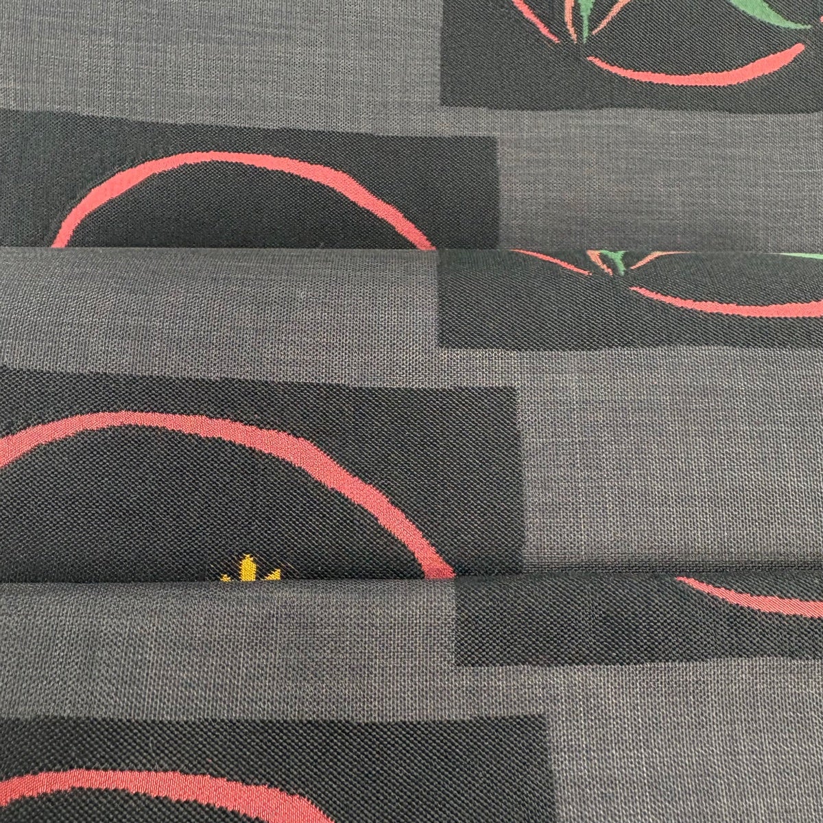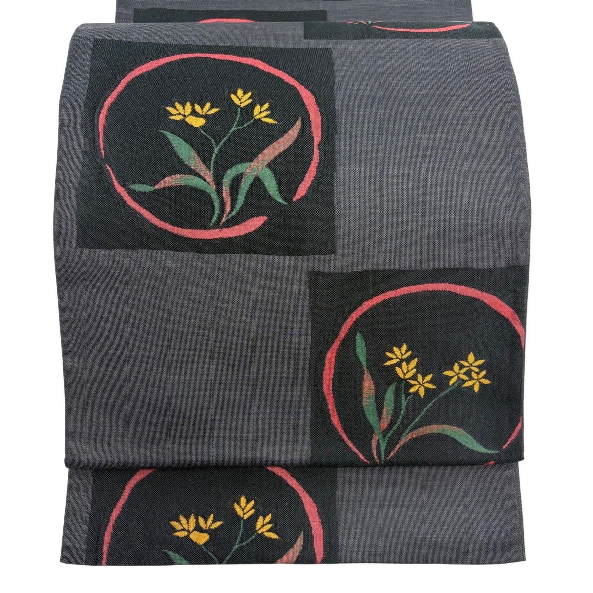 【美品】 袋帯 秀品 本袋 草花 幾何学模様 黒灰 六通 正絹