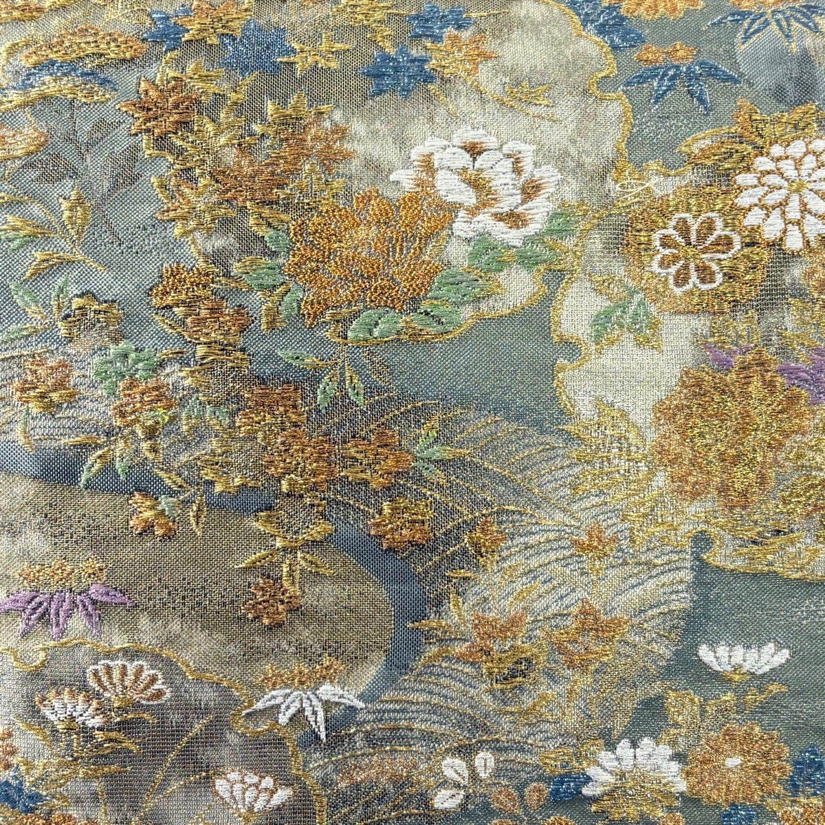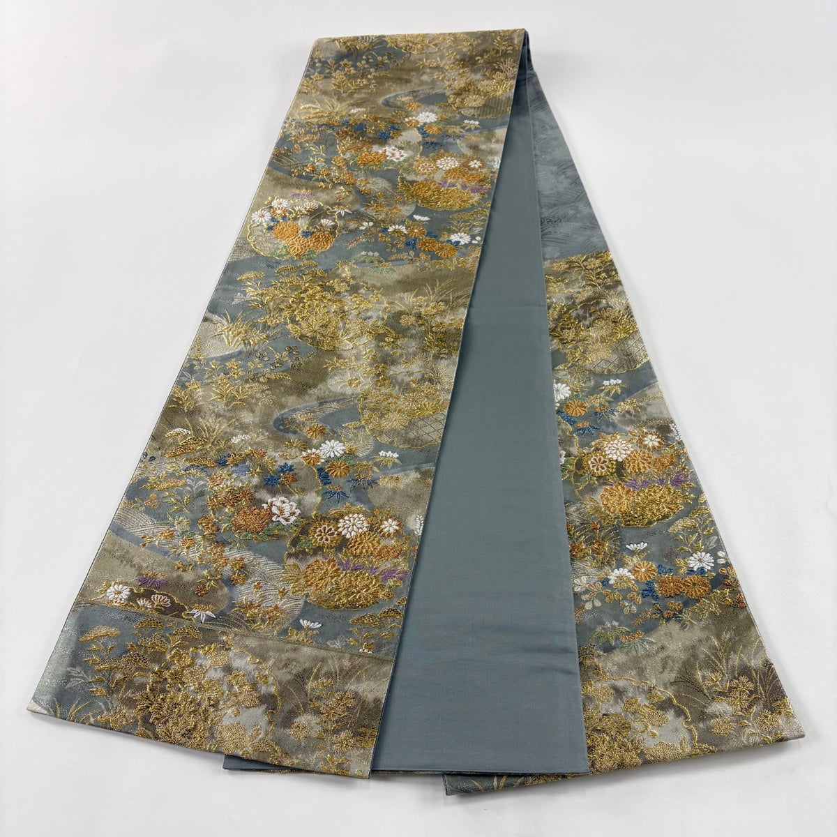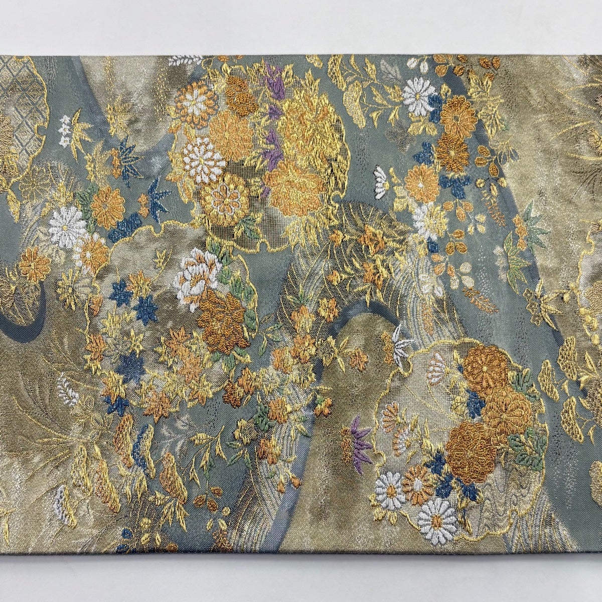 【美品】 袋帯 秀品 草花 流水 箔 唐織 青灰色 六通 正絹