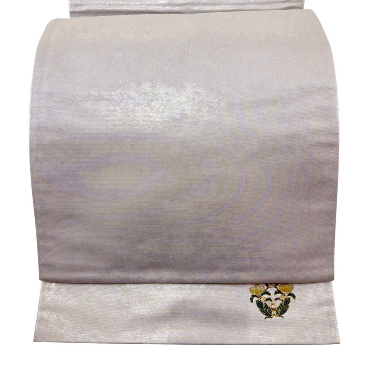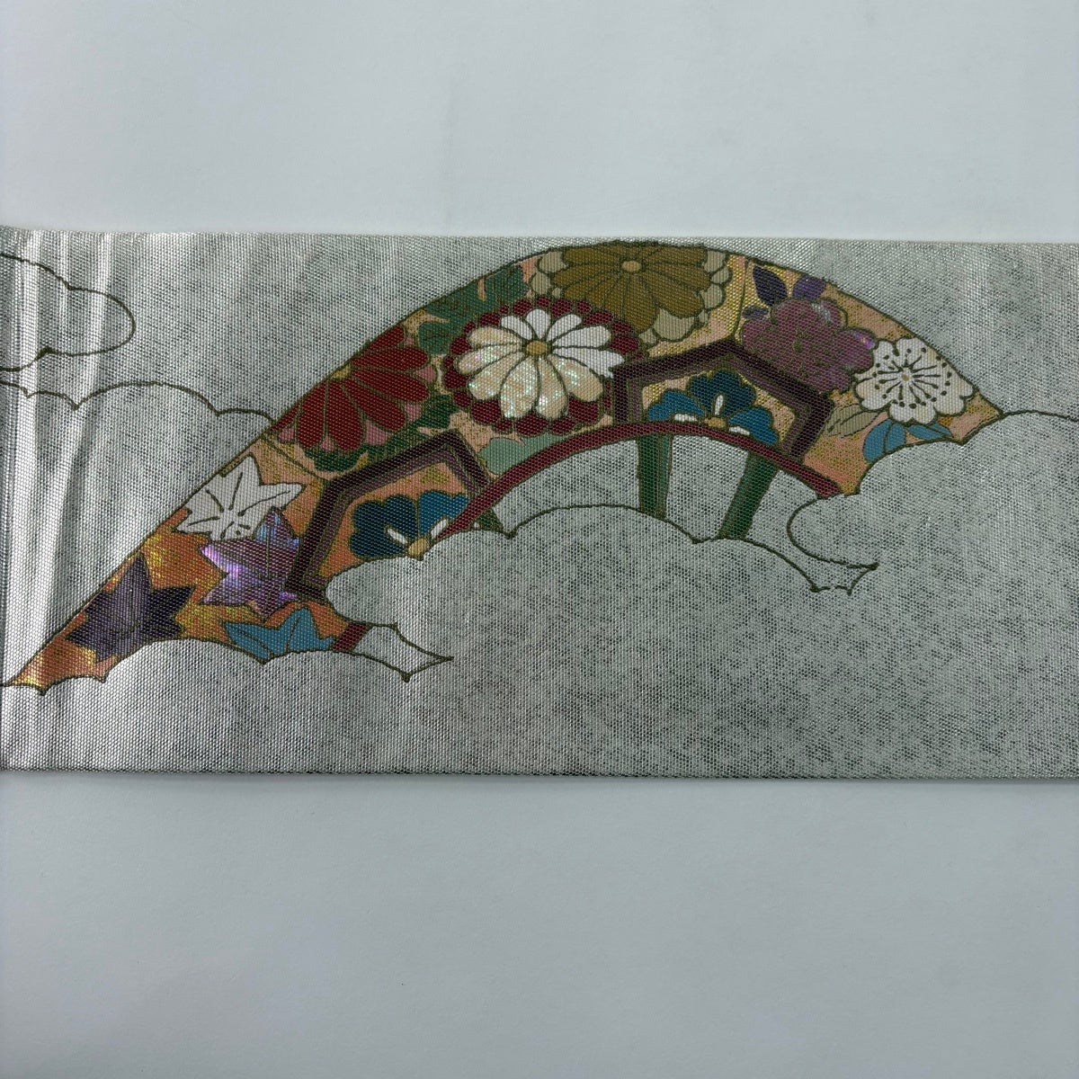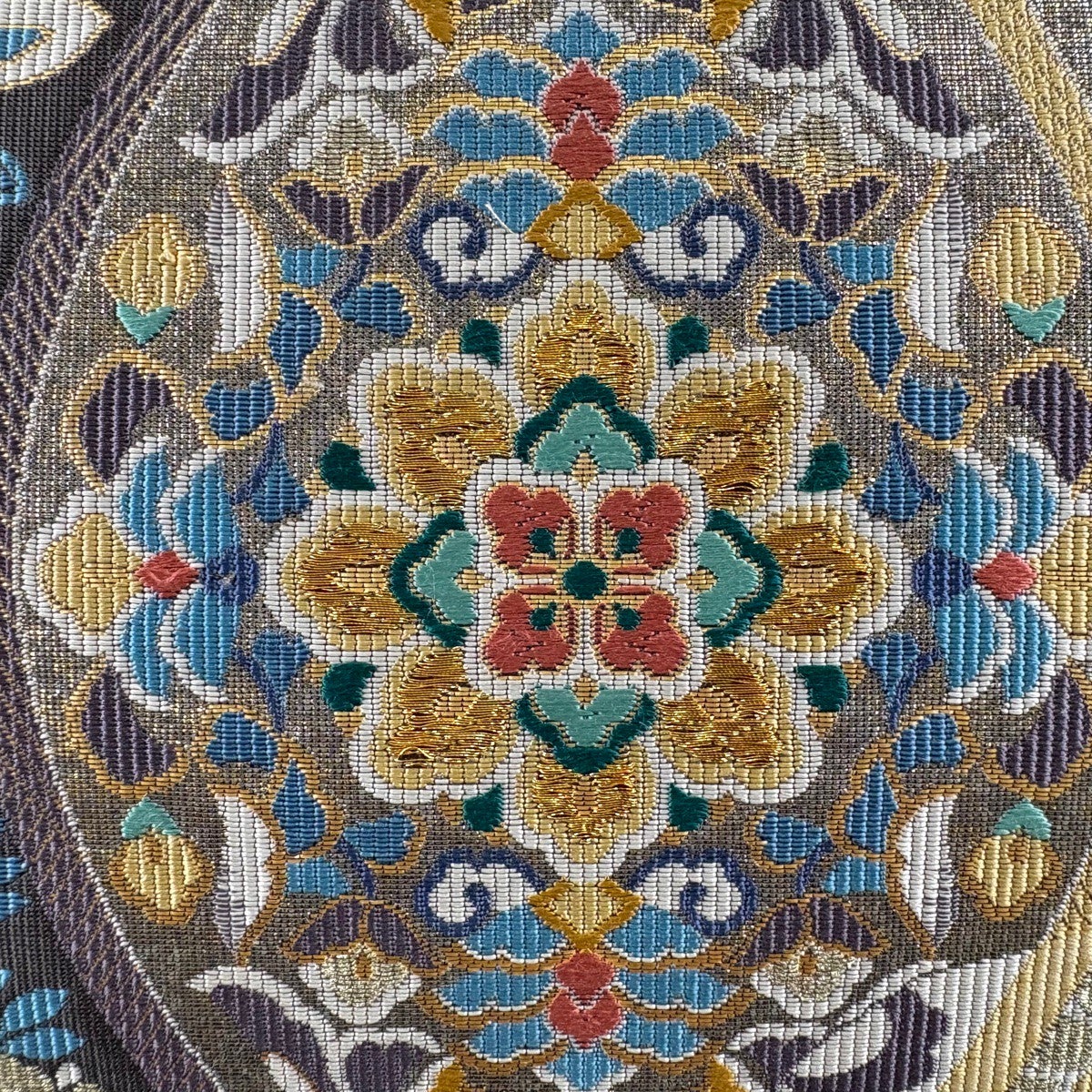 袋帯 秀品 ワンポイント柄 草花 螺鈿 箔 灰色 六通 正絹