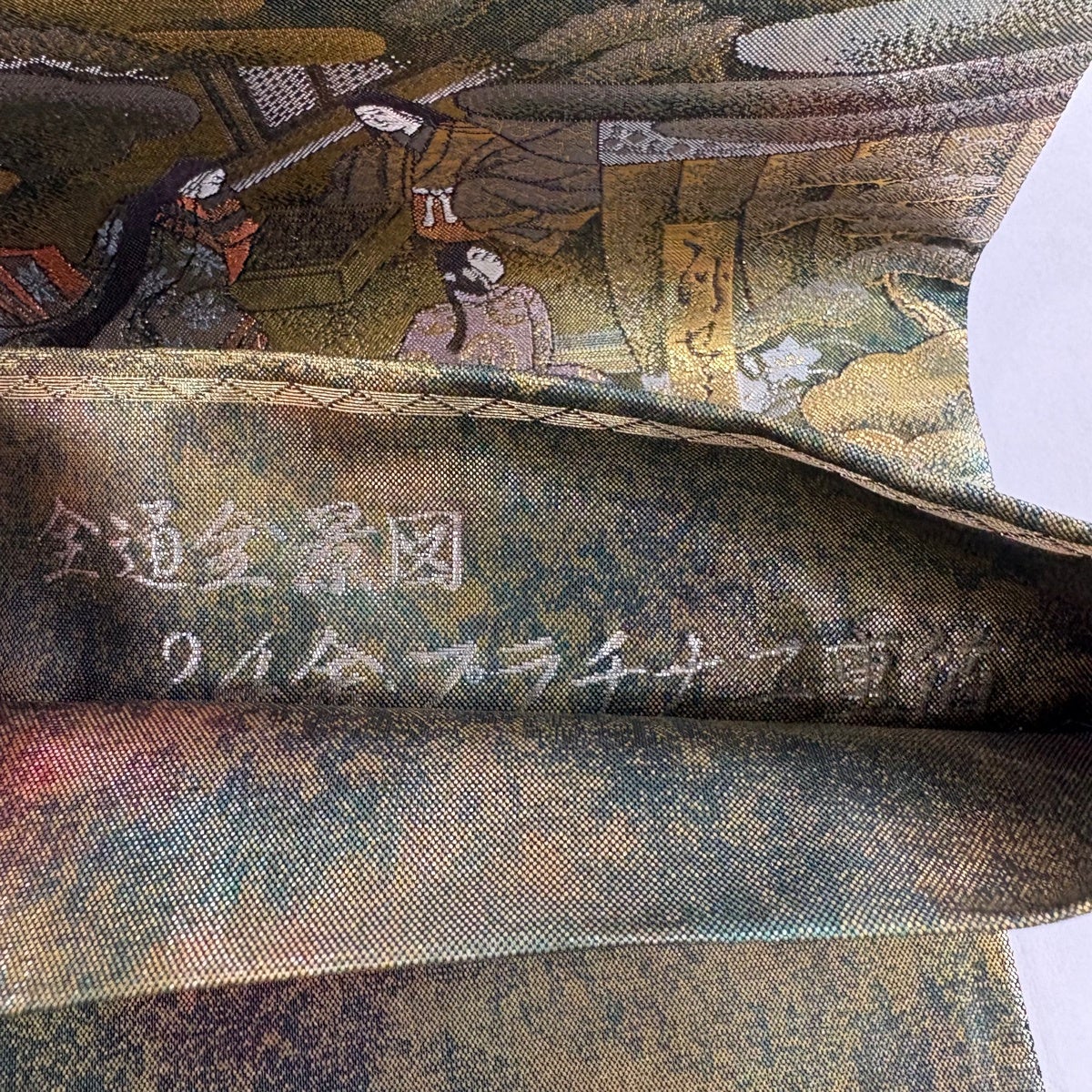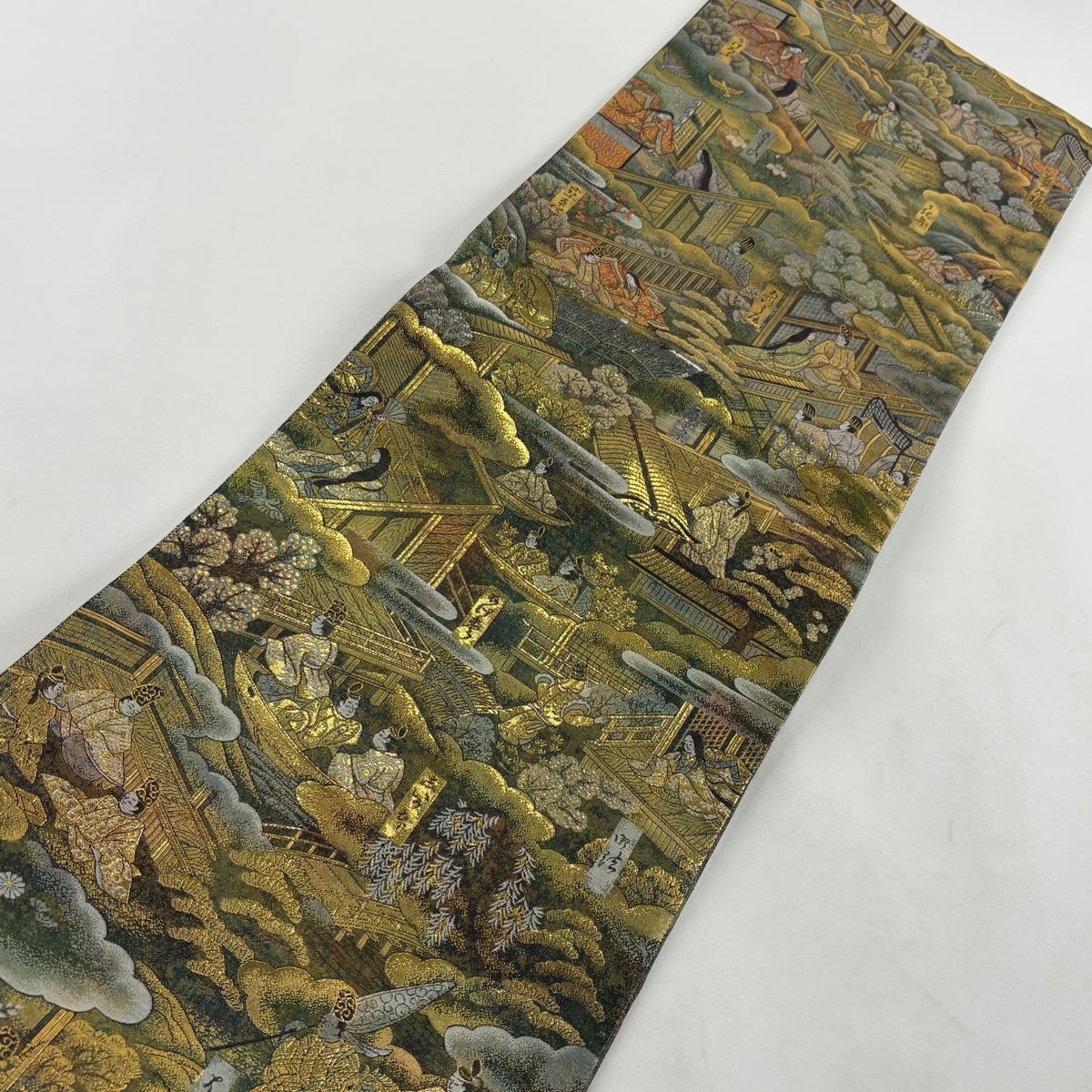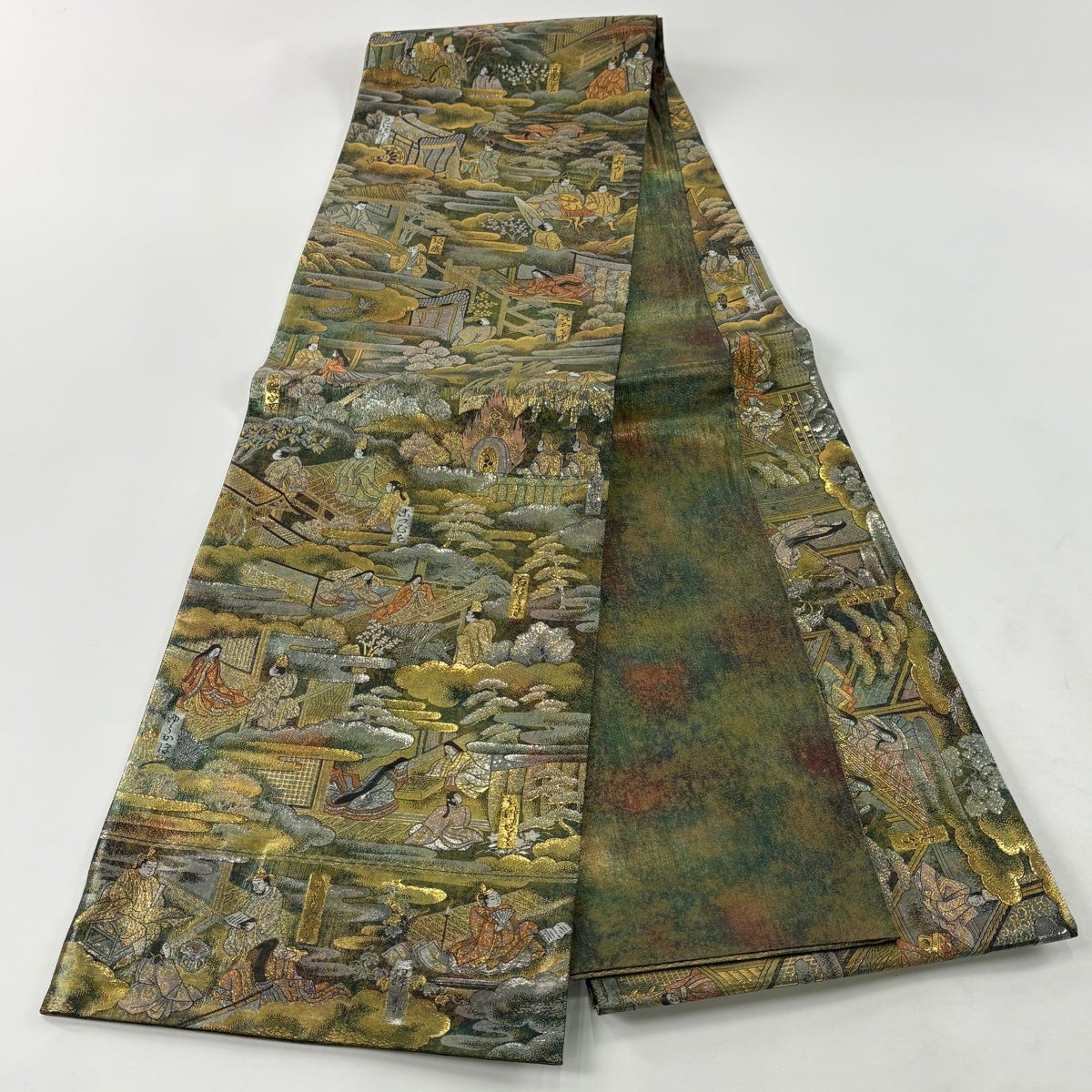 【美品】 袋帯 秀品 源氏物語絵巻 箔 茶緑色 お太鼓柄 正絹