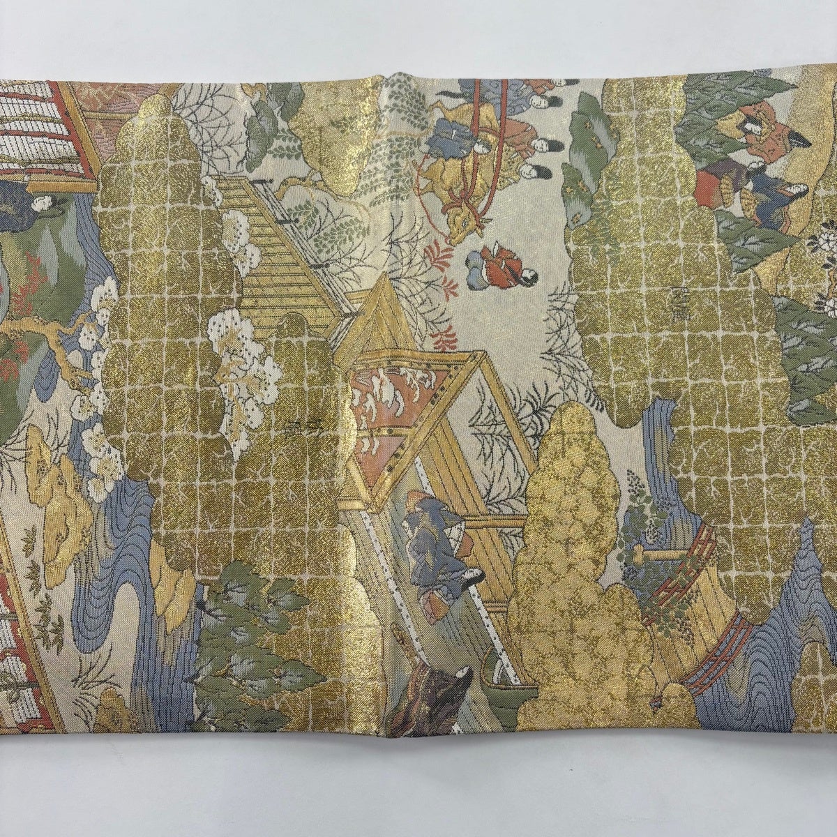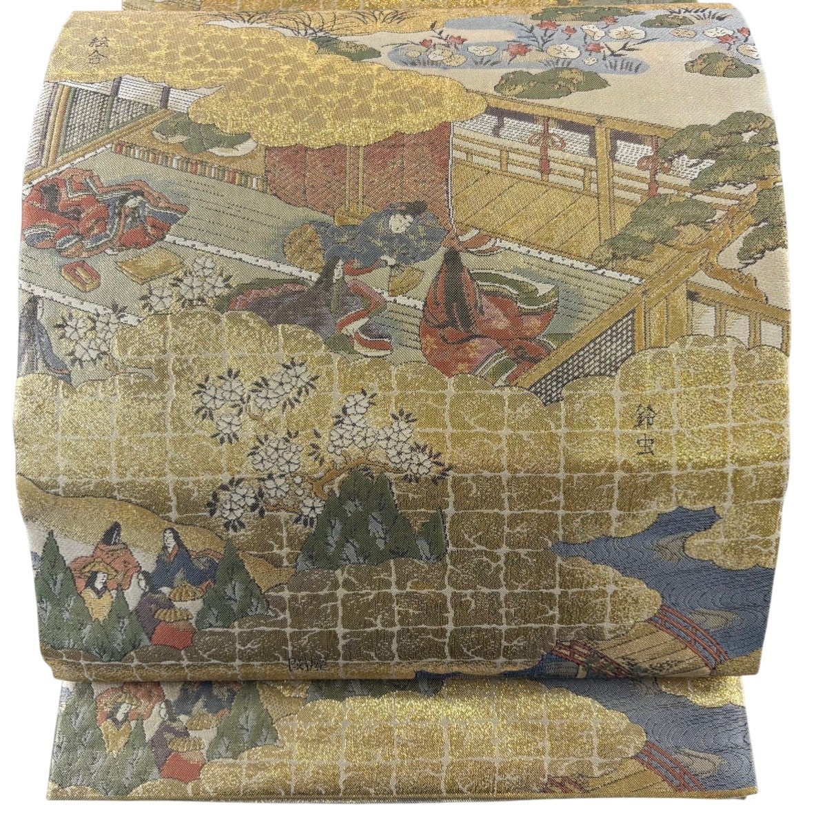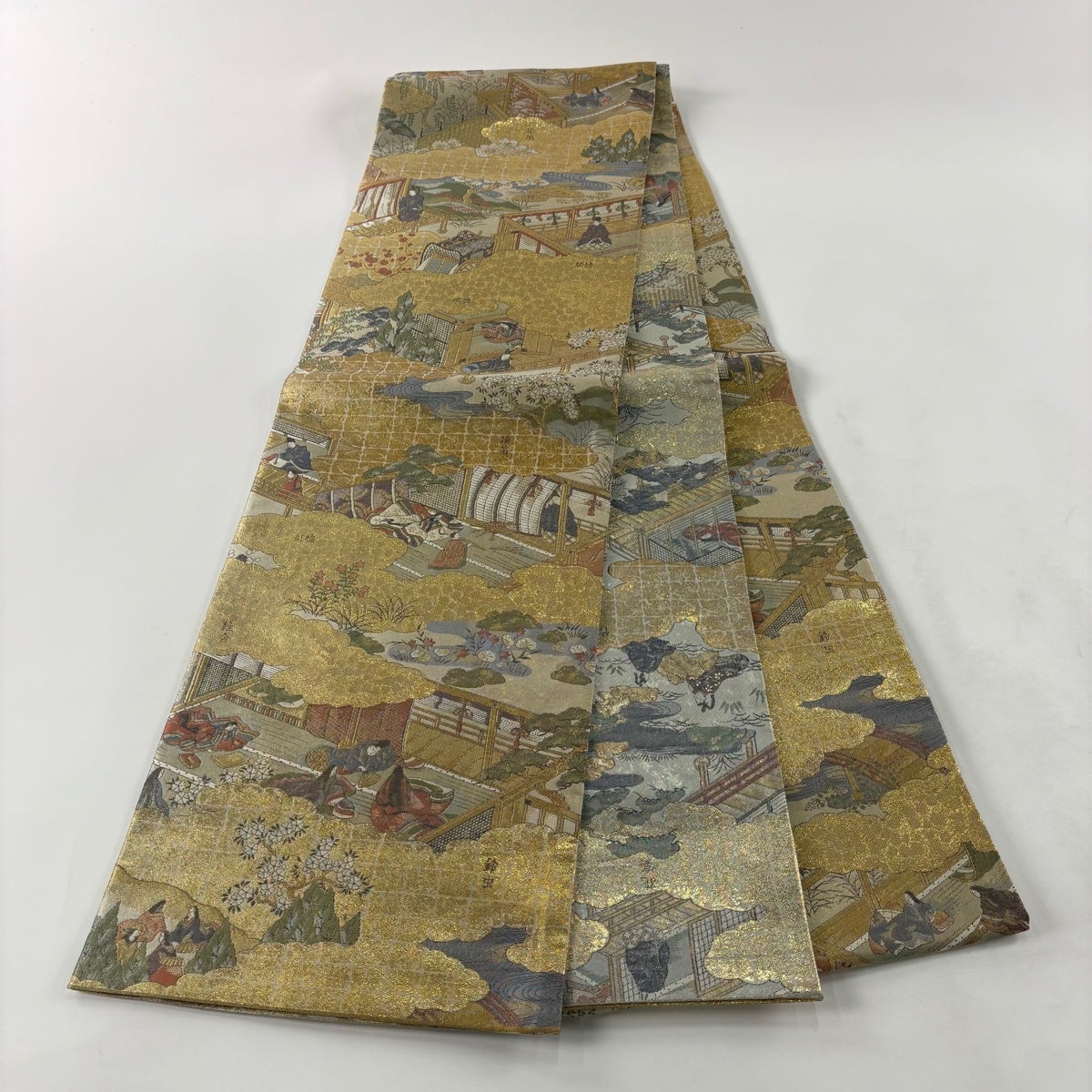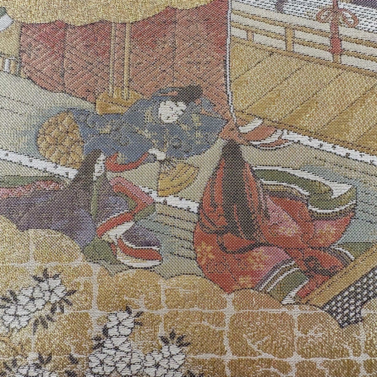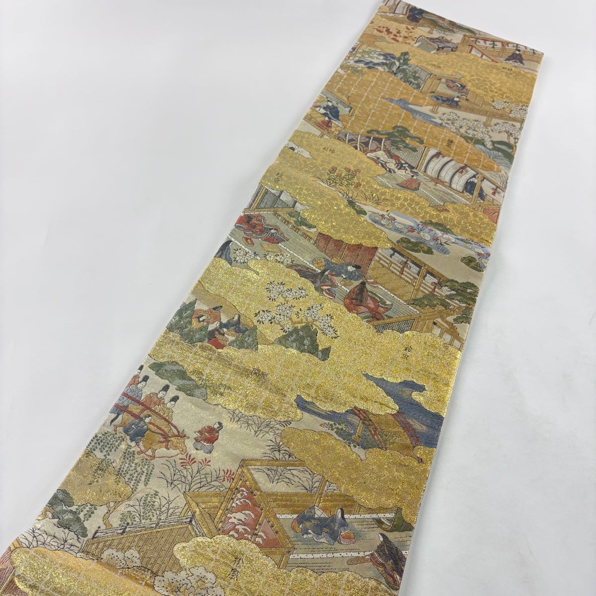 丸帯 秀品 人物 雲文 金糸 箔 ベージュ お太鼓柄 正絹