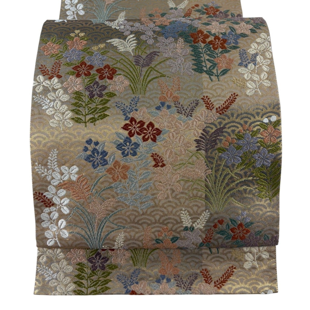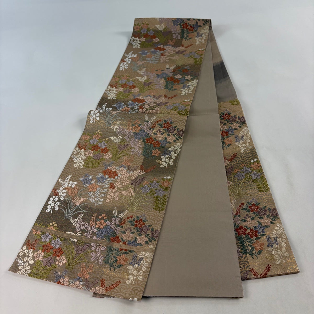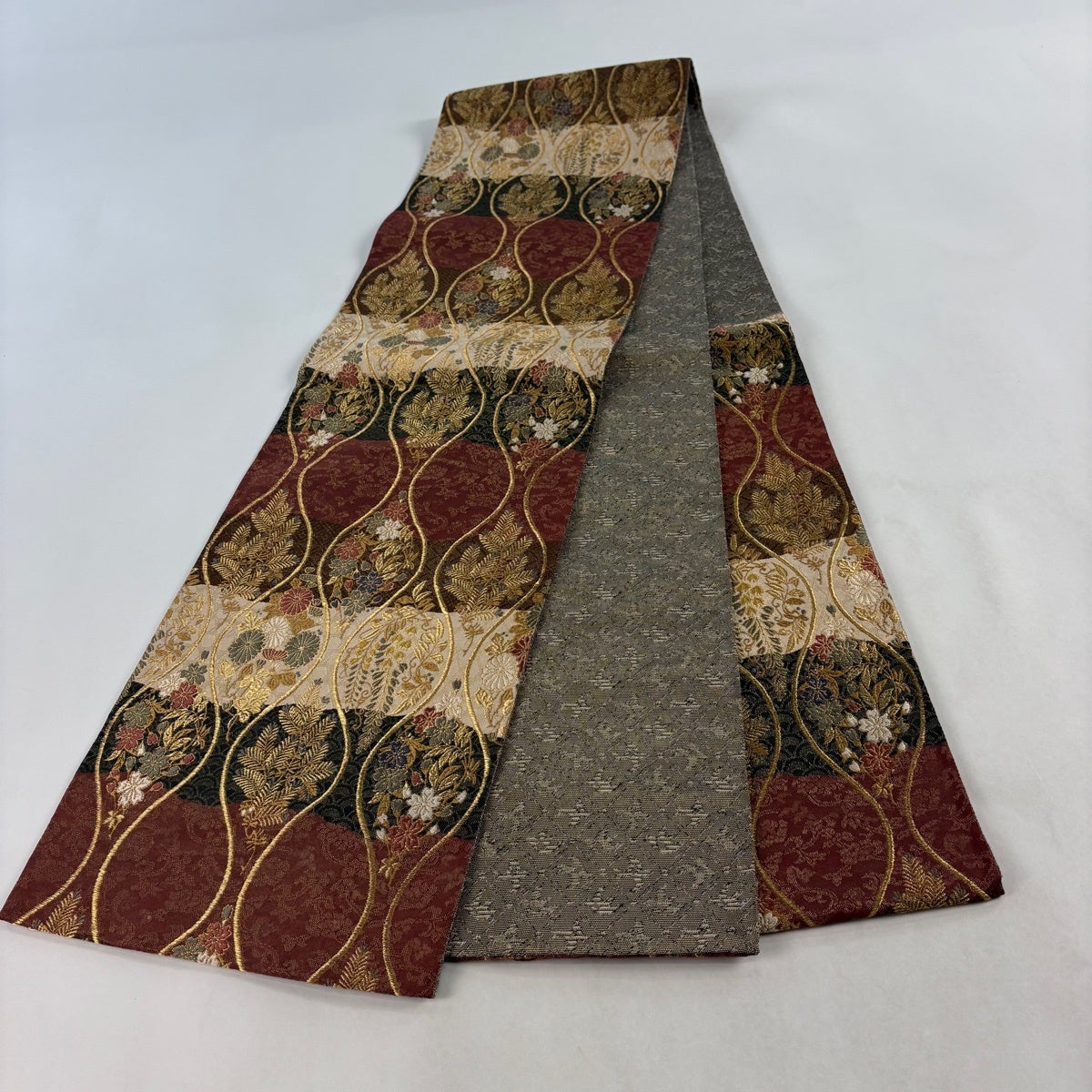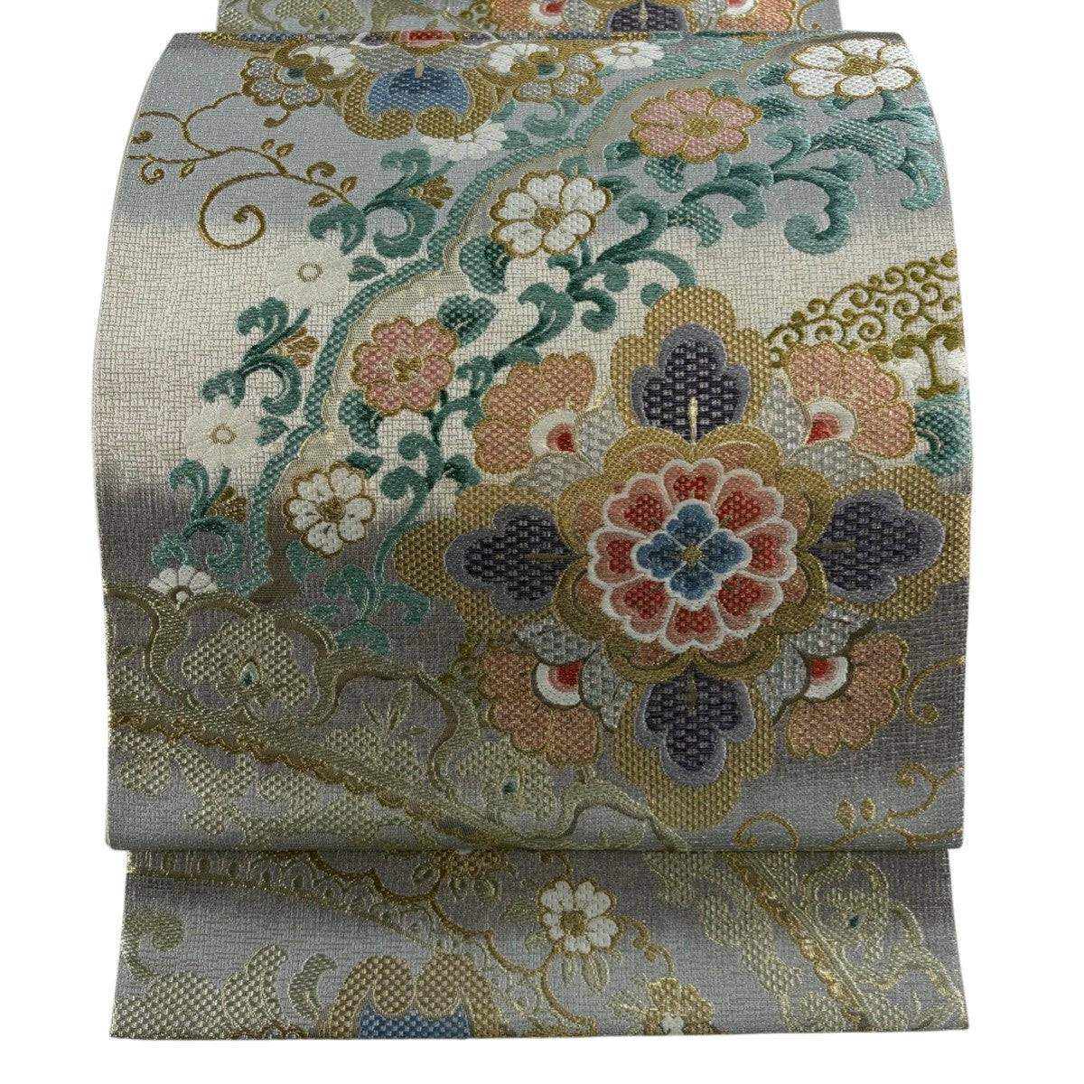 【美品】 袋帯 秀品 華文 花唐草 金糸 箔 灰色 六通 正絹