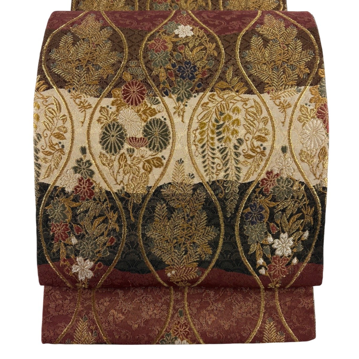 【美品】 袋帯 秀品 振袖向き 草花 箔 えんじ色 六通 正絹