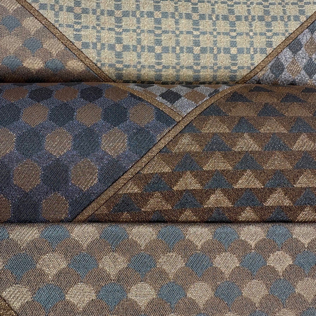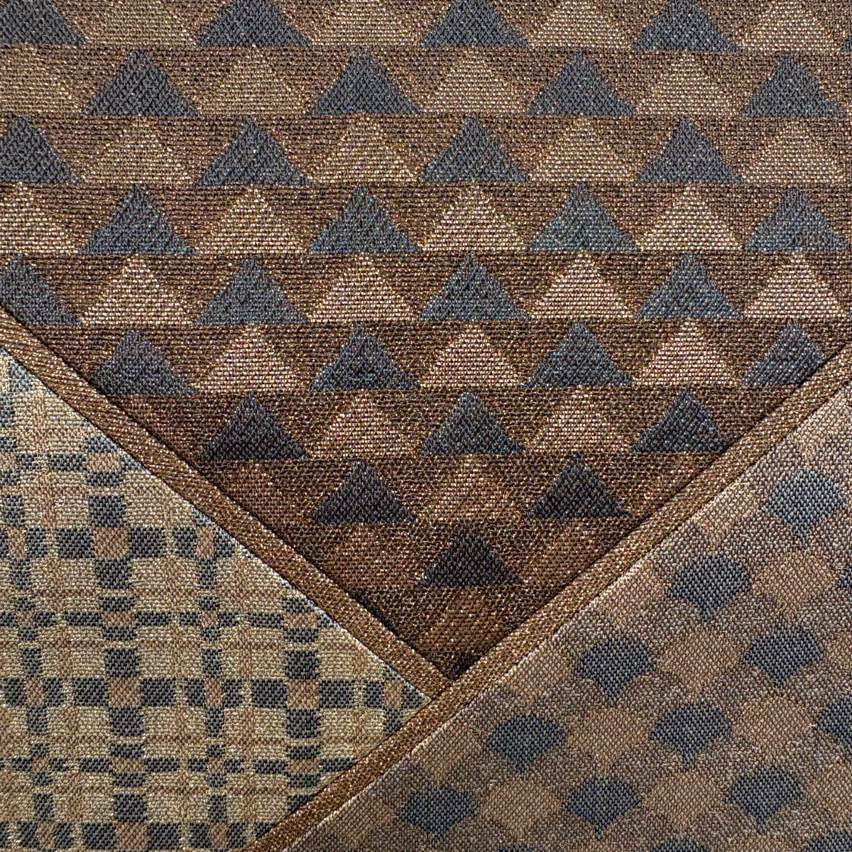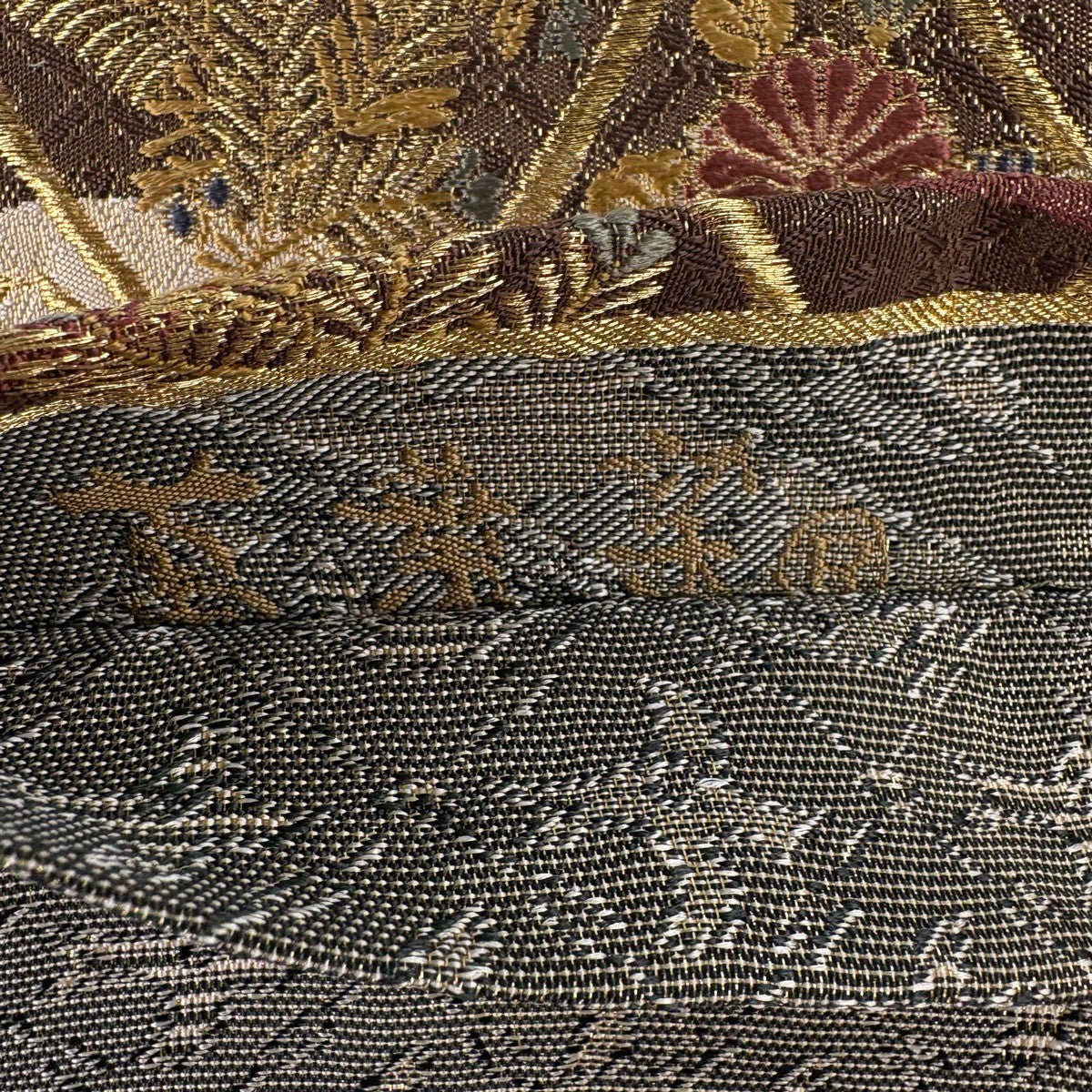 【美品】 袋帯 秀品 変わり市松 竹 金彩 焦茶色 全通 正絹
