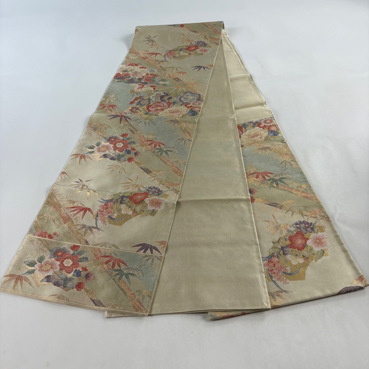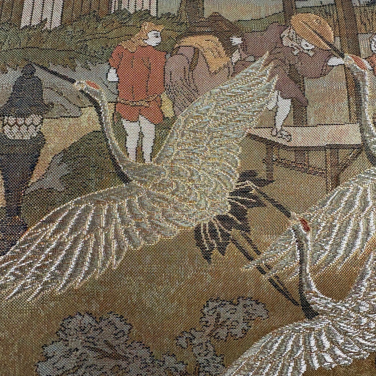 【美品】 袋帯 秀品 草花 鶴 金糸 箔 クリーム 六通 正絹