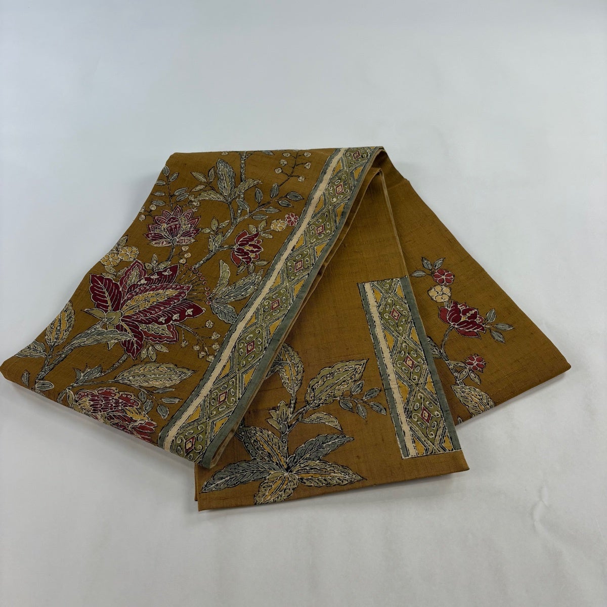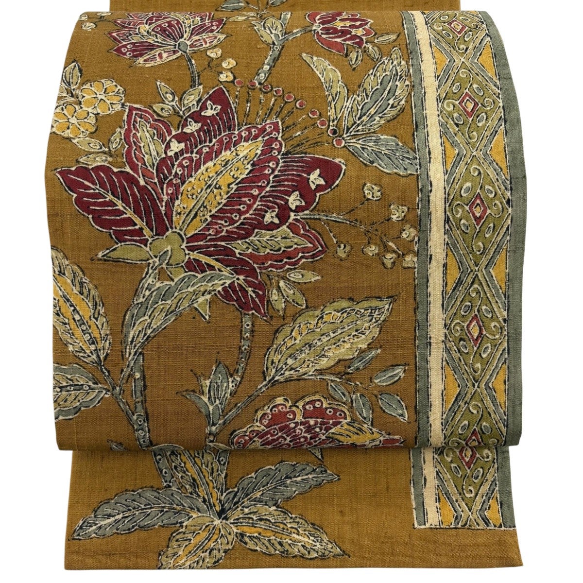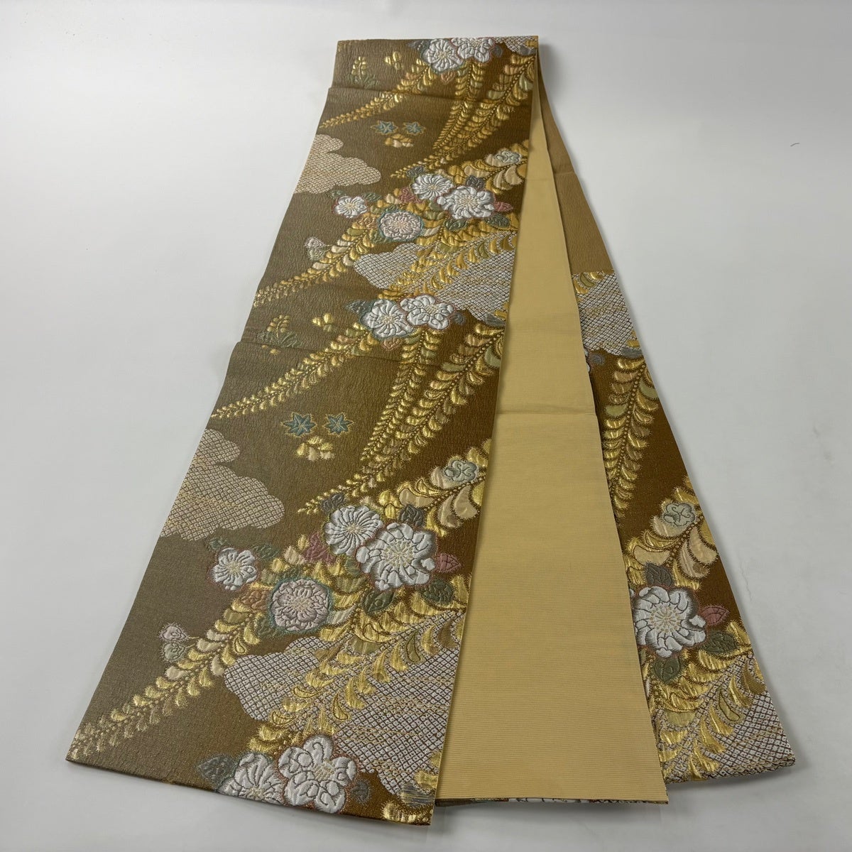 【美品】 袋帯 秀品 花唐草 菱 金糸 抹茶色 お太鼓柄 正絹