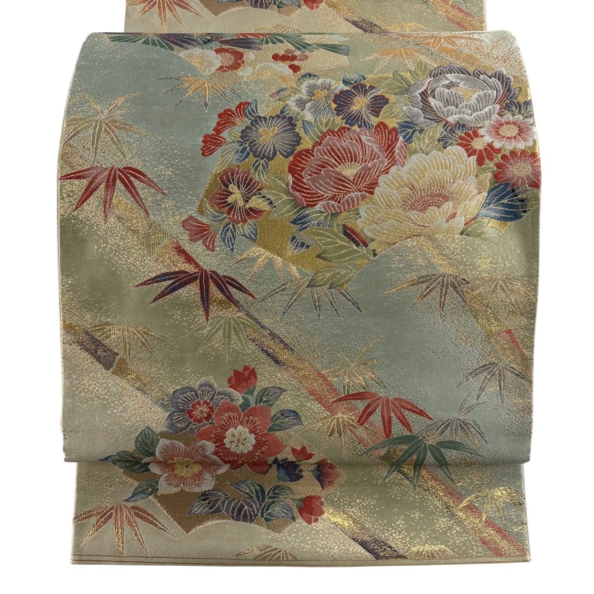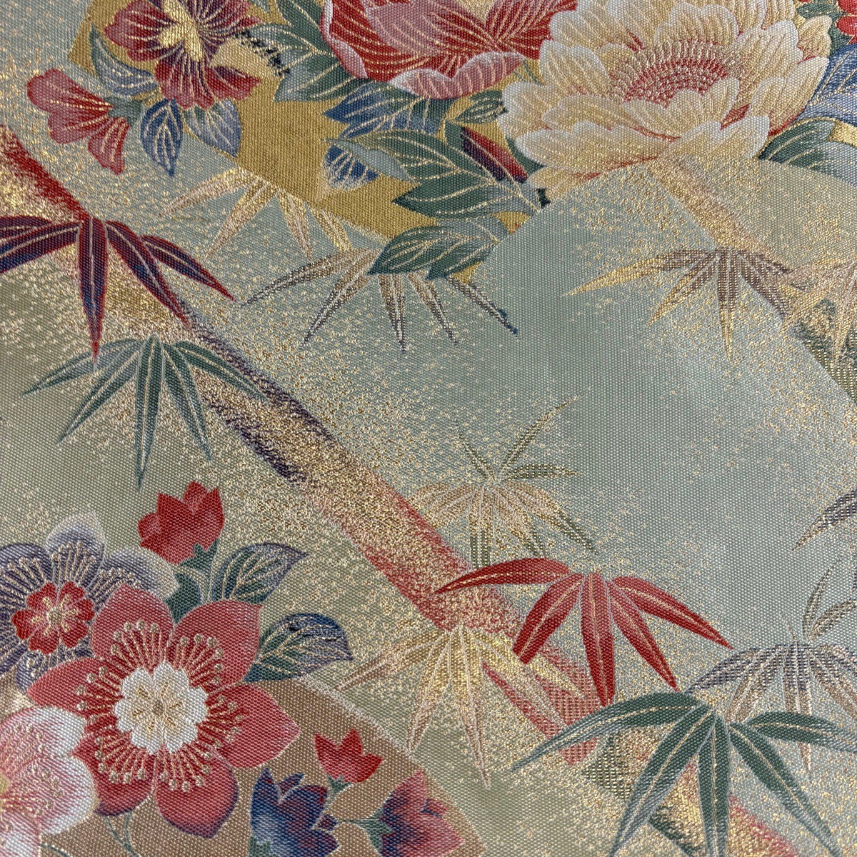 【美品】 袋帯 秀品 菱格子 草花 箔 刺繍 灰緑 六通 正絹