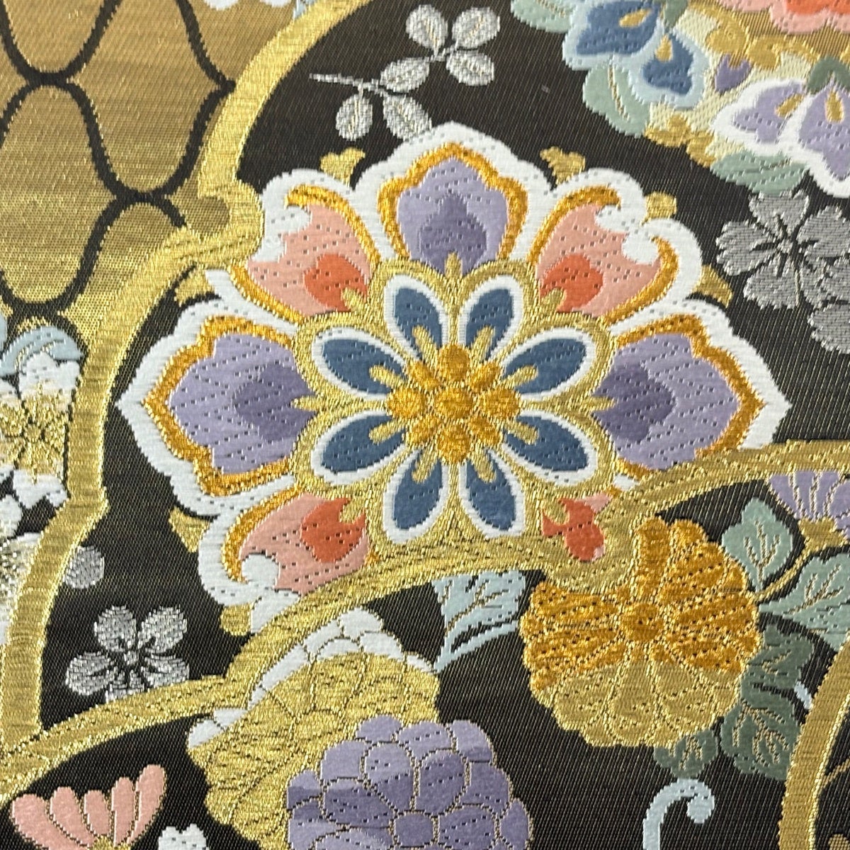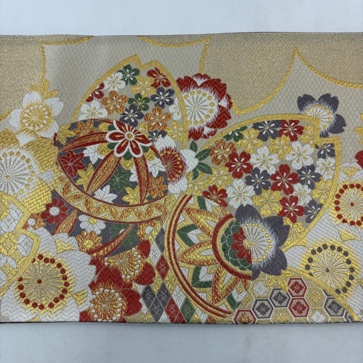 【美品】 袋帯 秀品 花丸文 市松 金糸 箔 銀色 六通 正絹