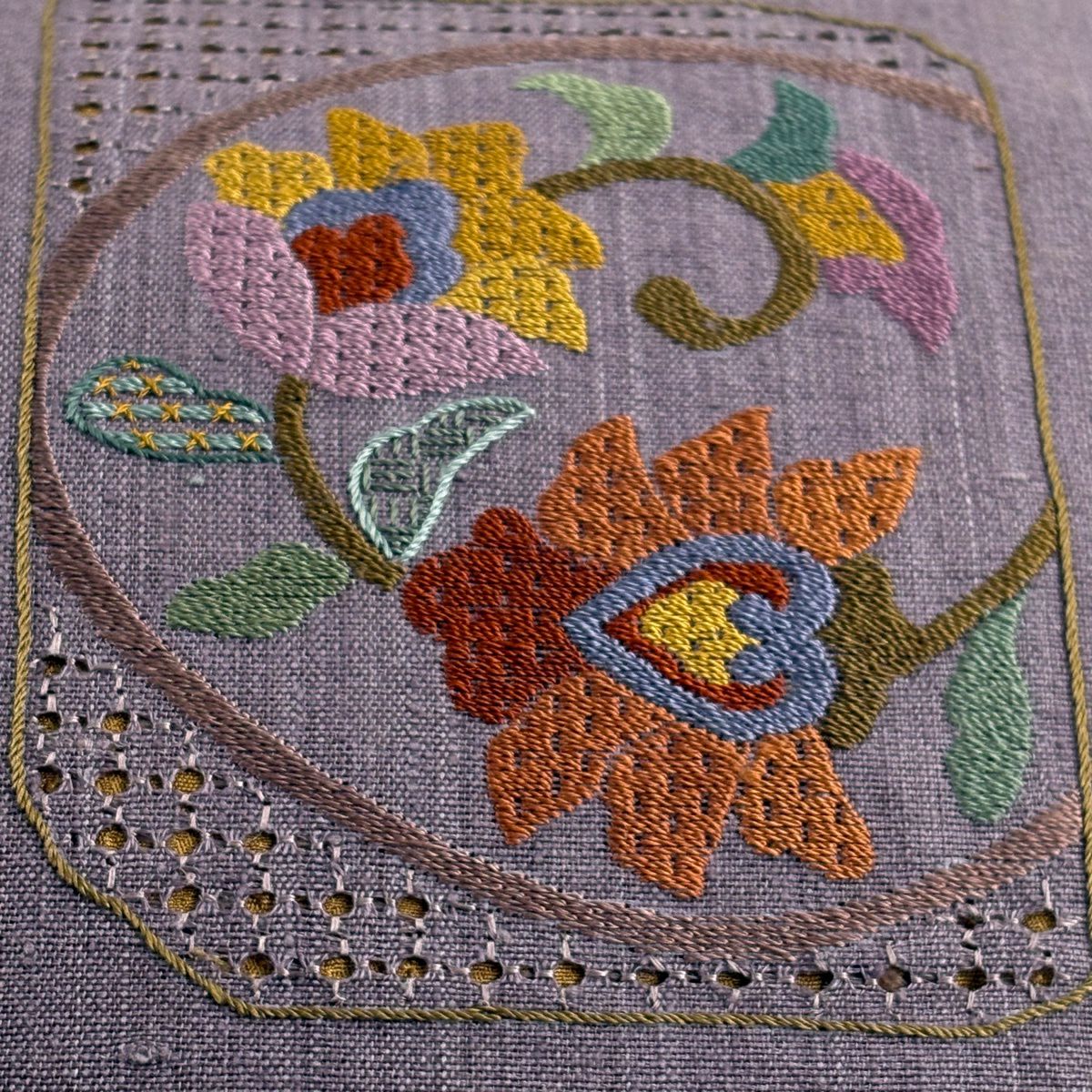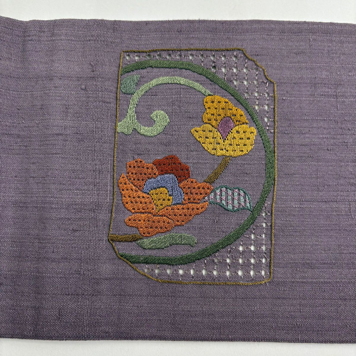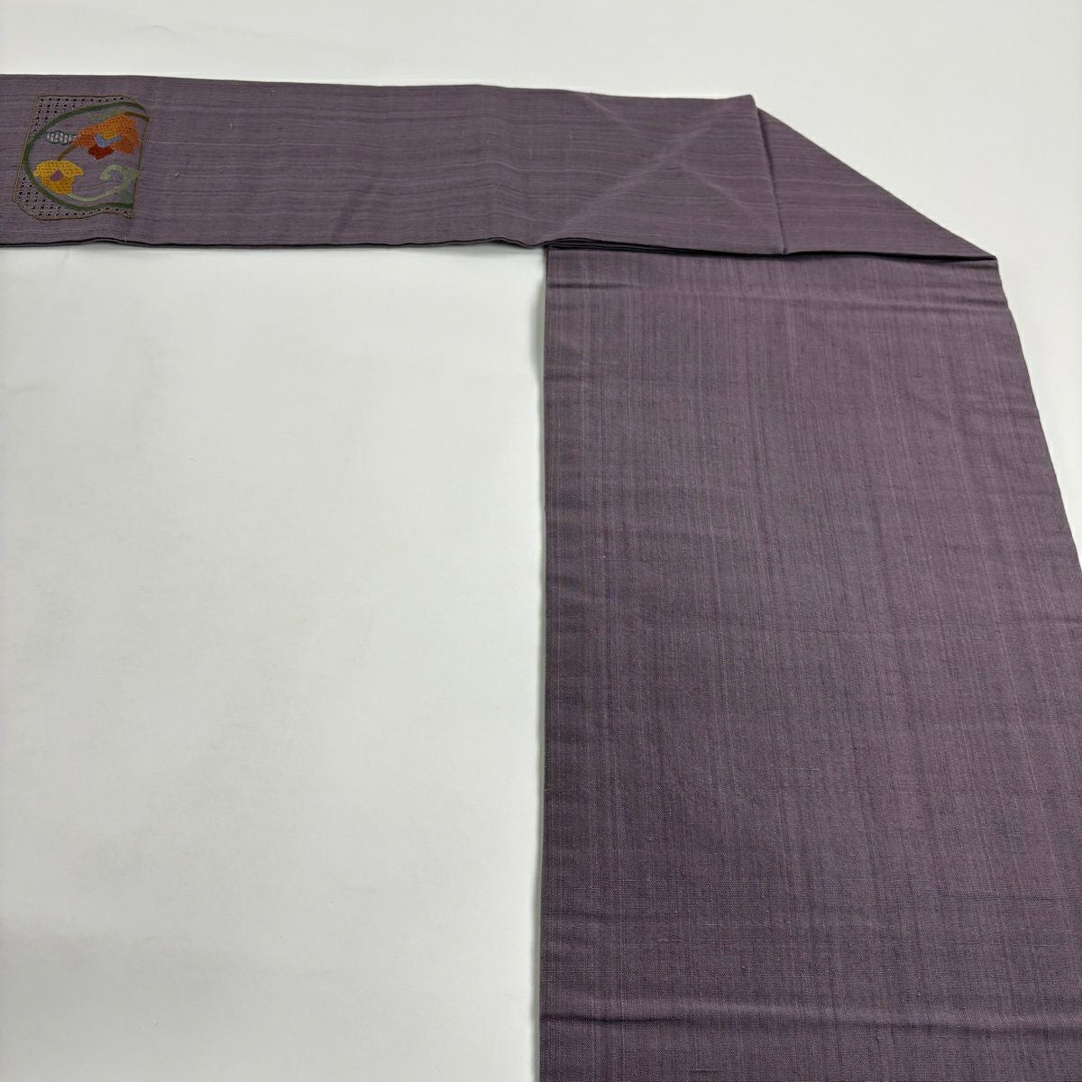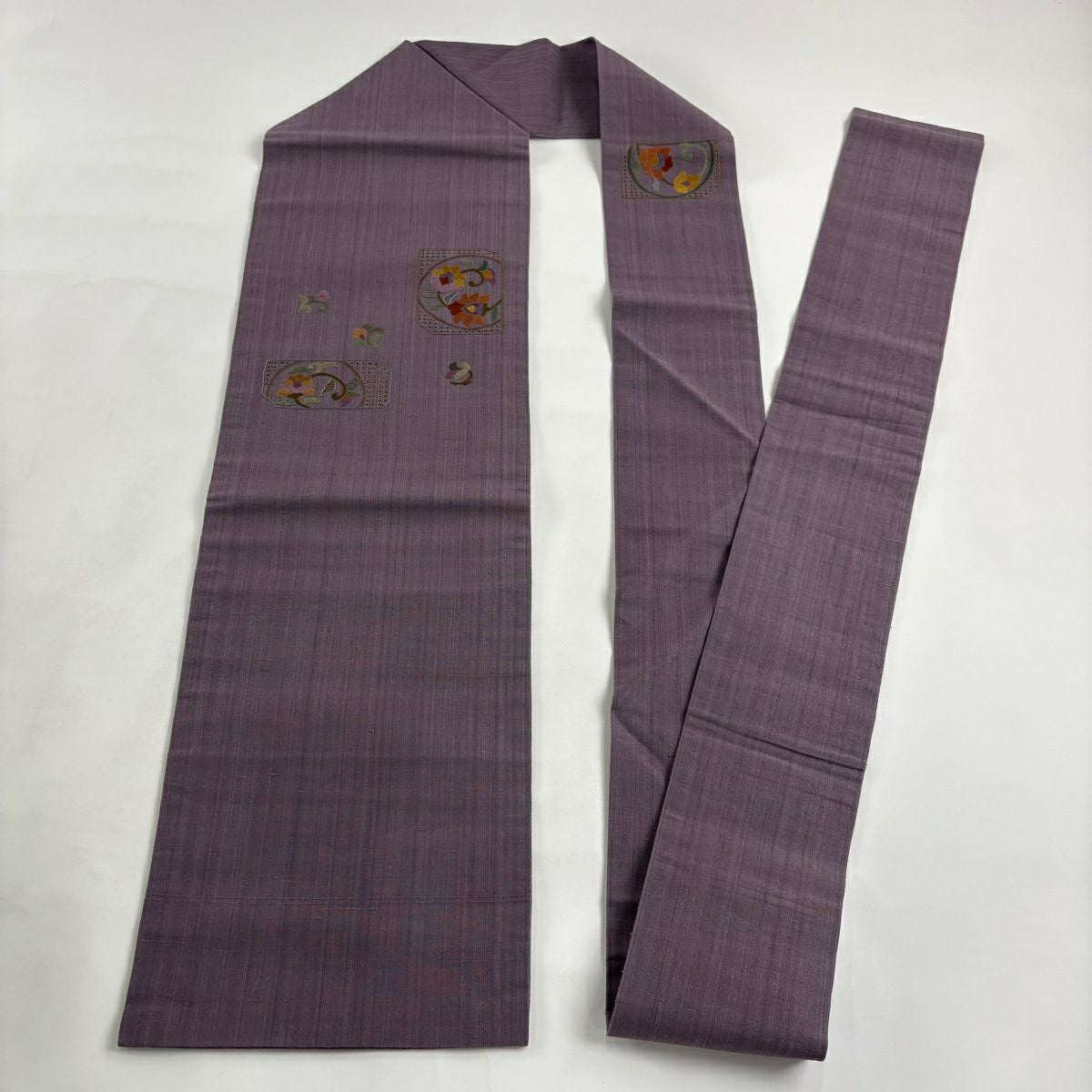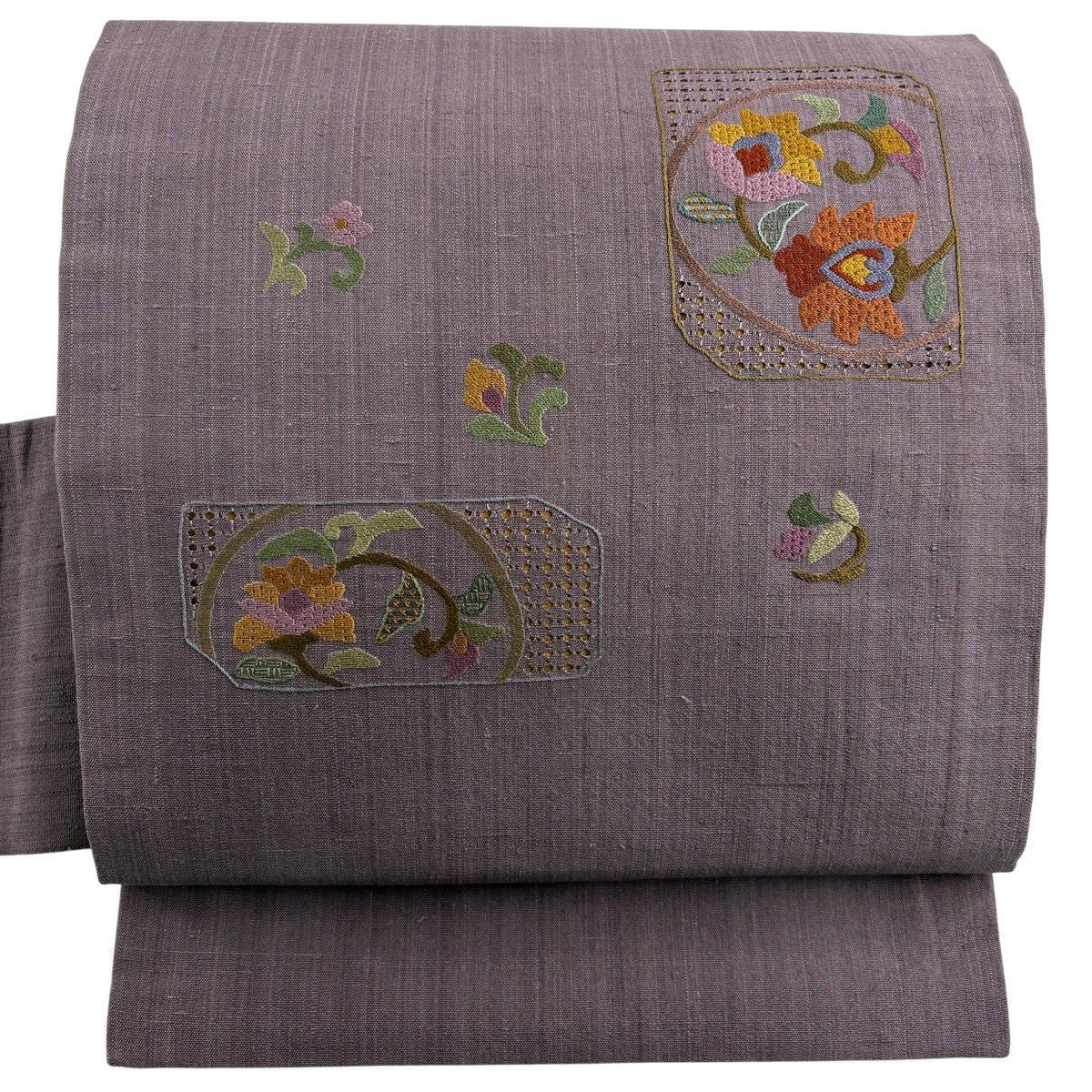 名古屋帯 秀品 紬地 草花 刺繍 薄紫 正絹