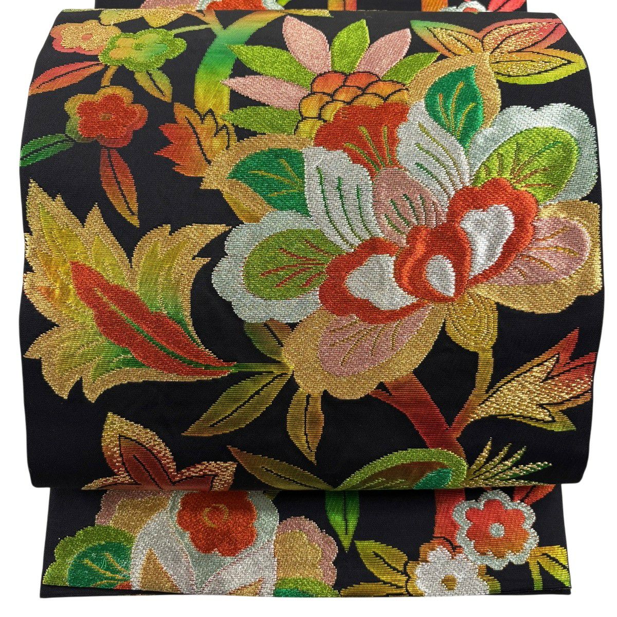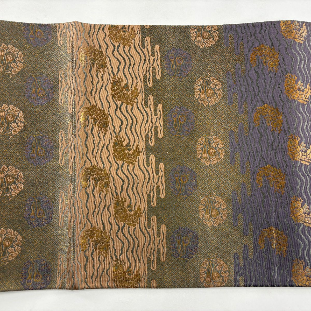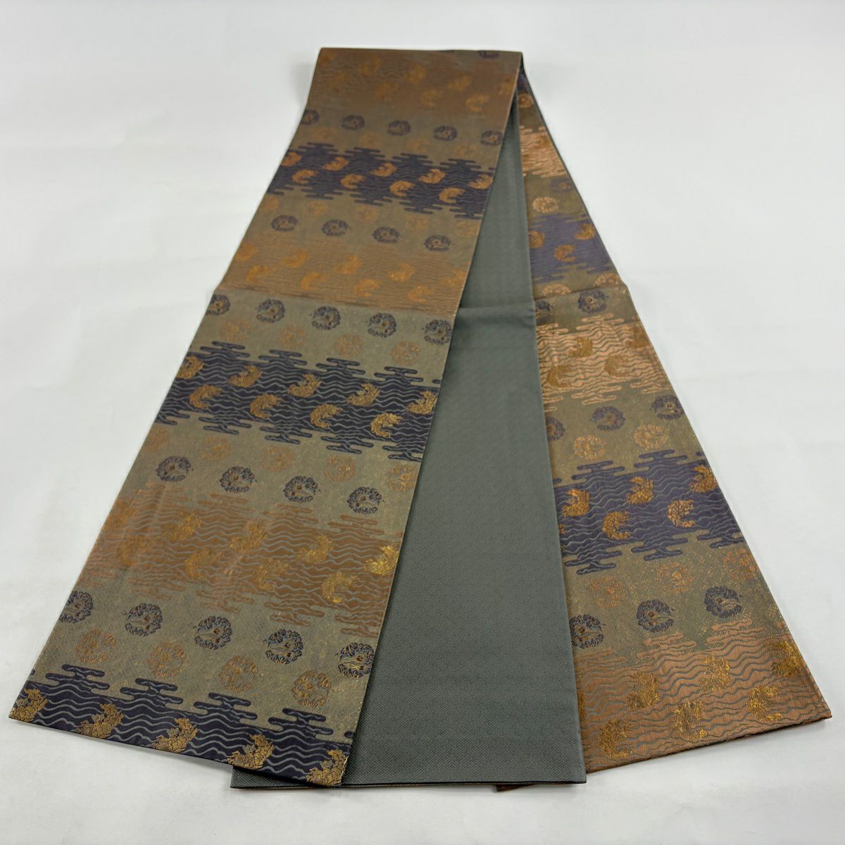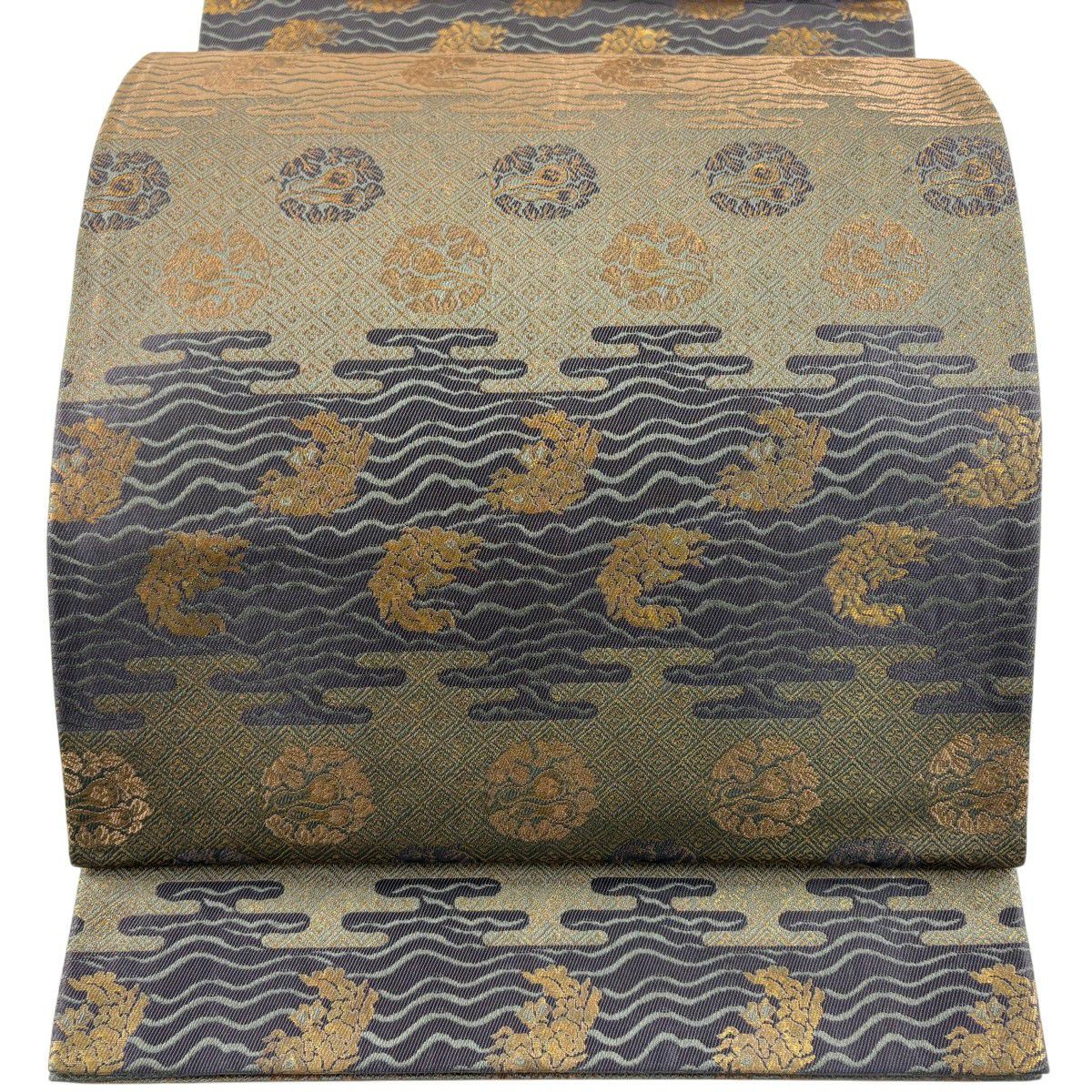 袋帯 秀品 草花 波 金糸 深緑 全通 正絹