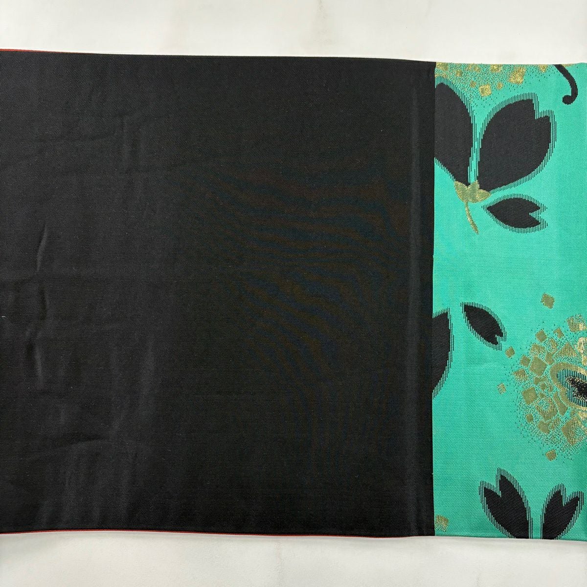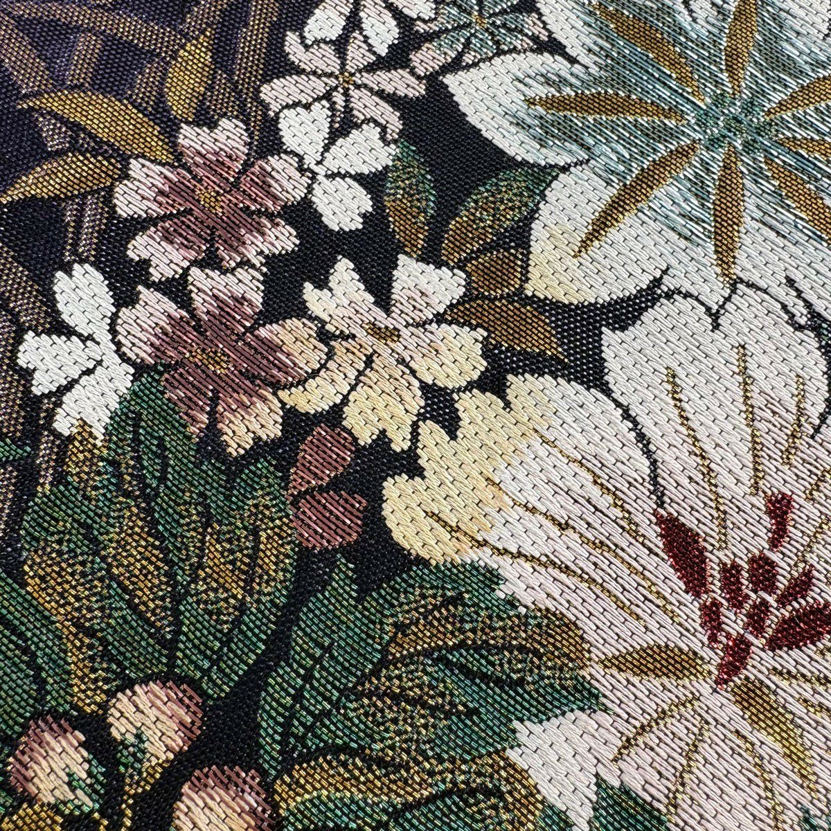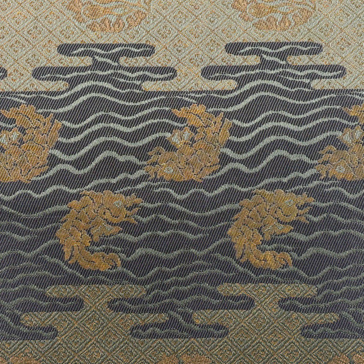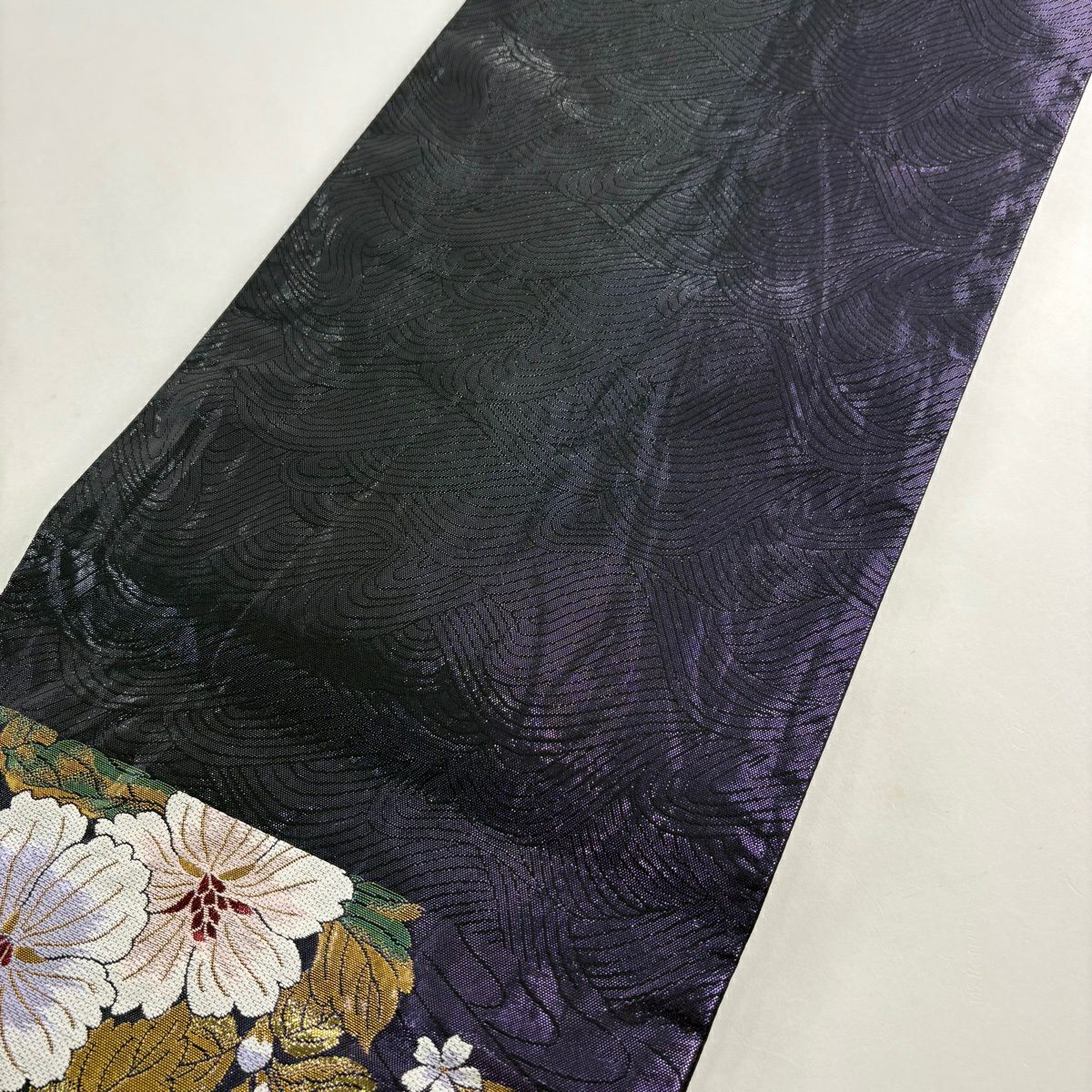 袋帯 秀品 草花 波 金糸 深緑 全通 正絹