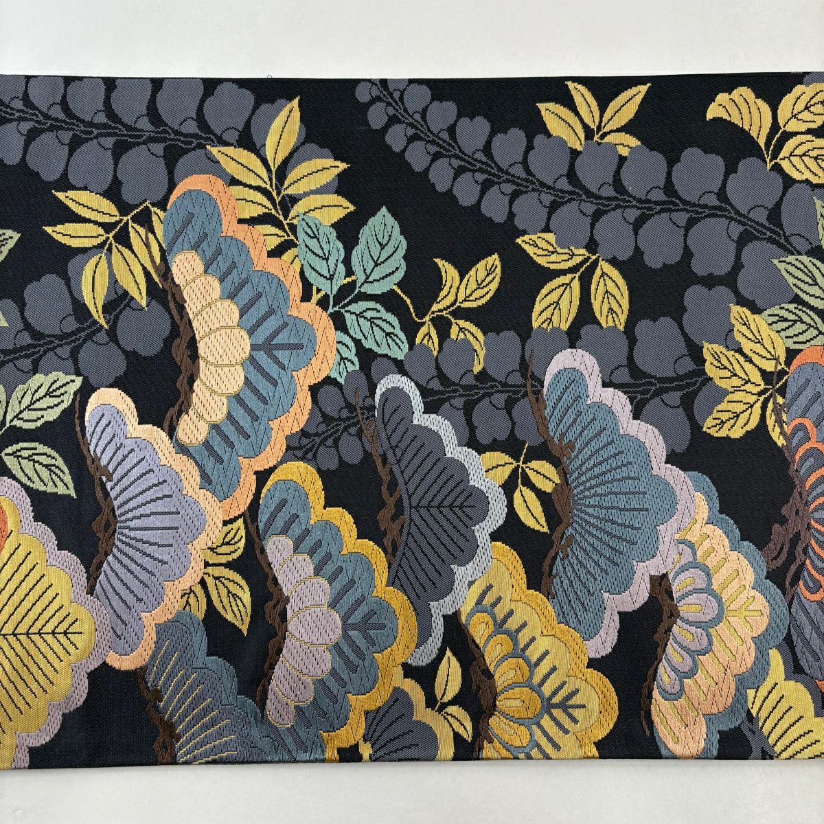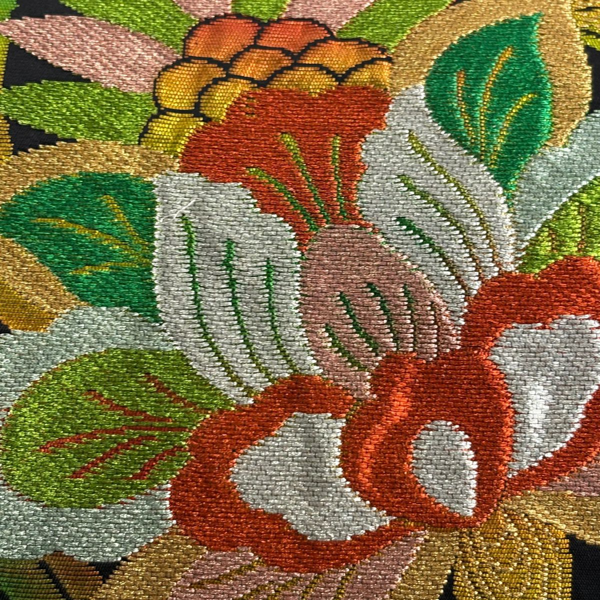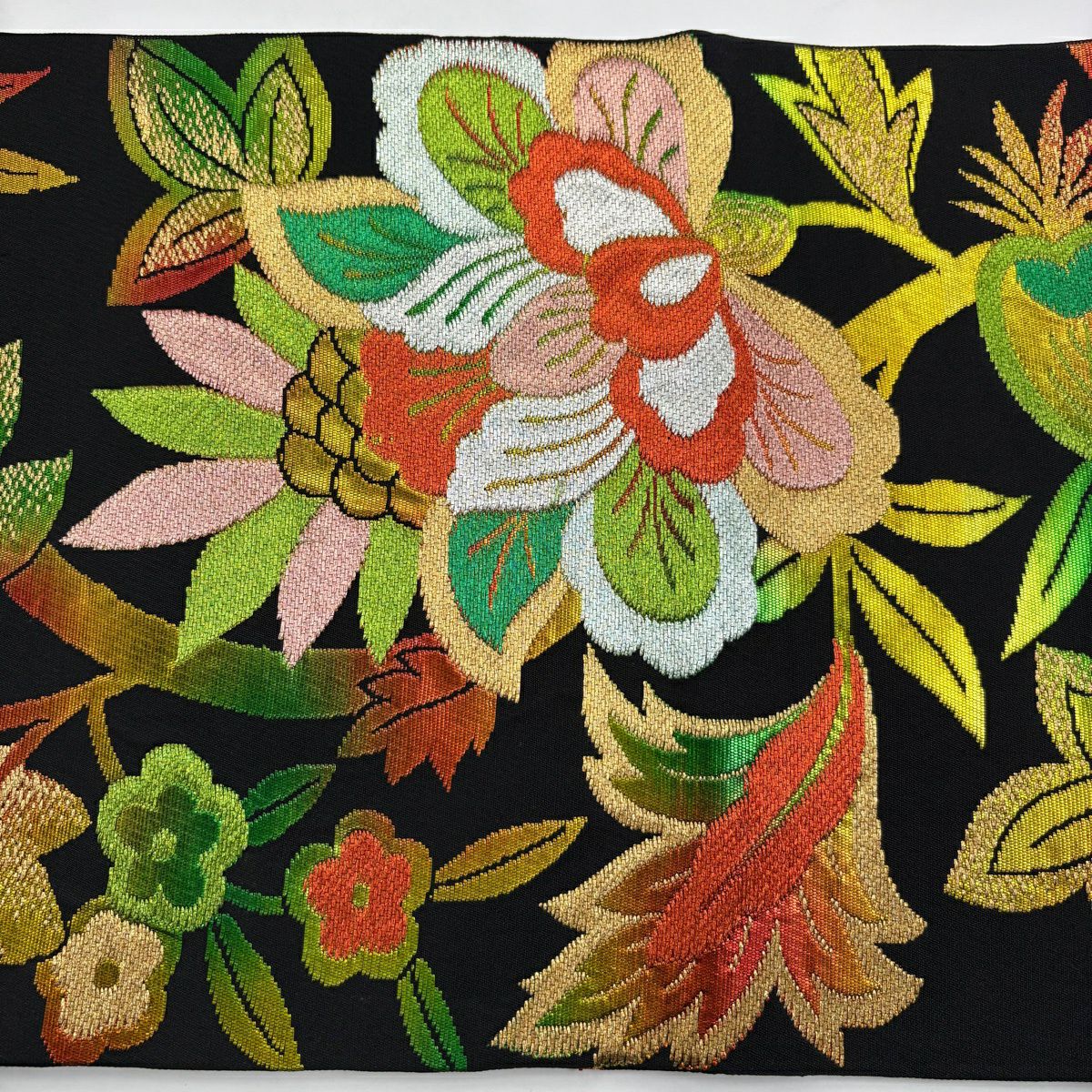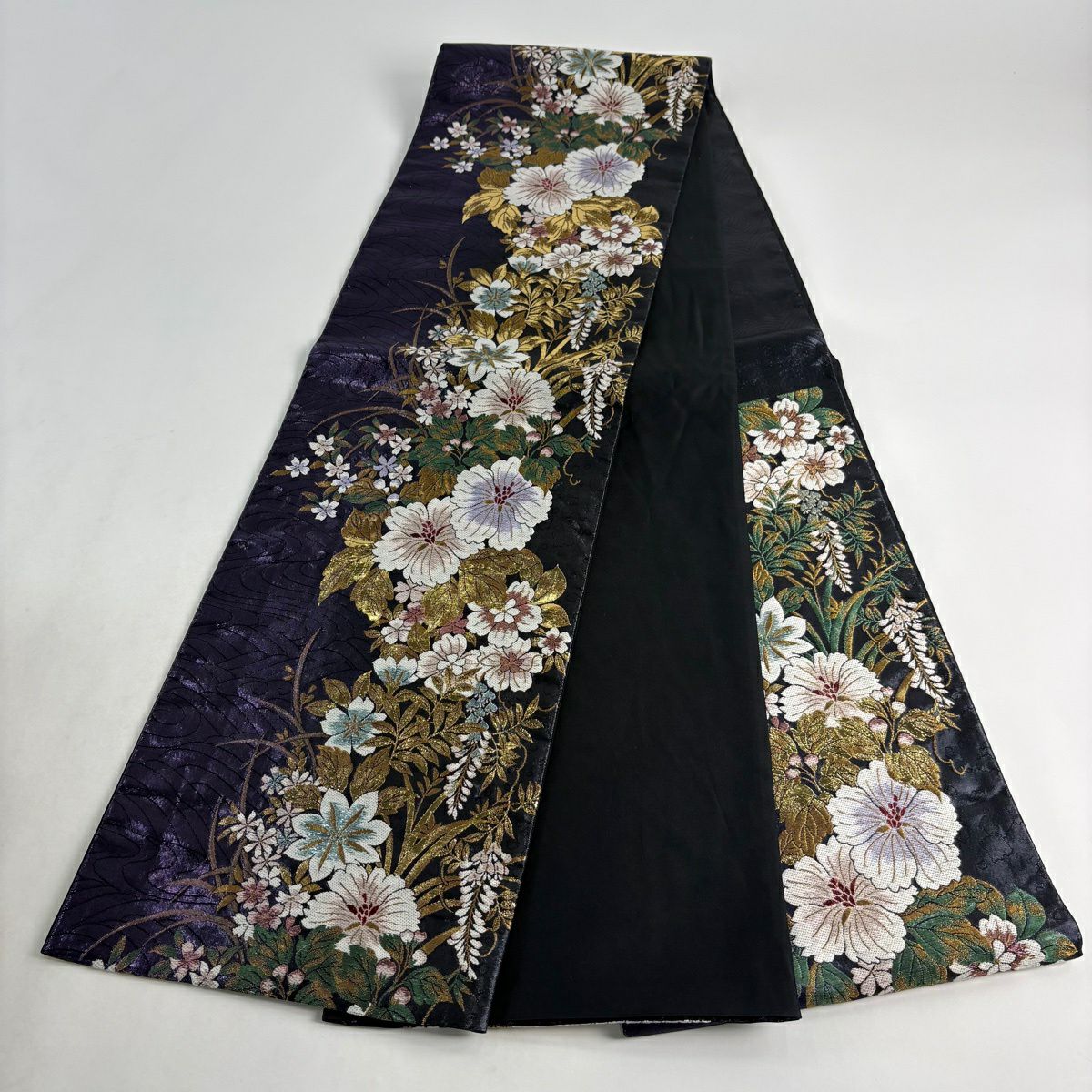 袋帯 秀品 草花 波 金糸 深緑 全通 正絹