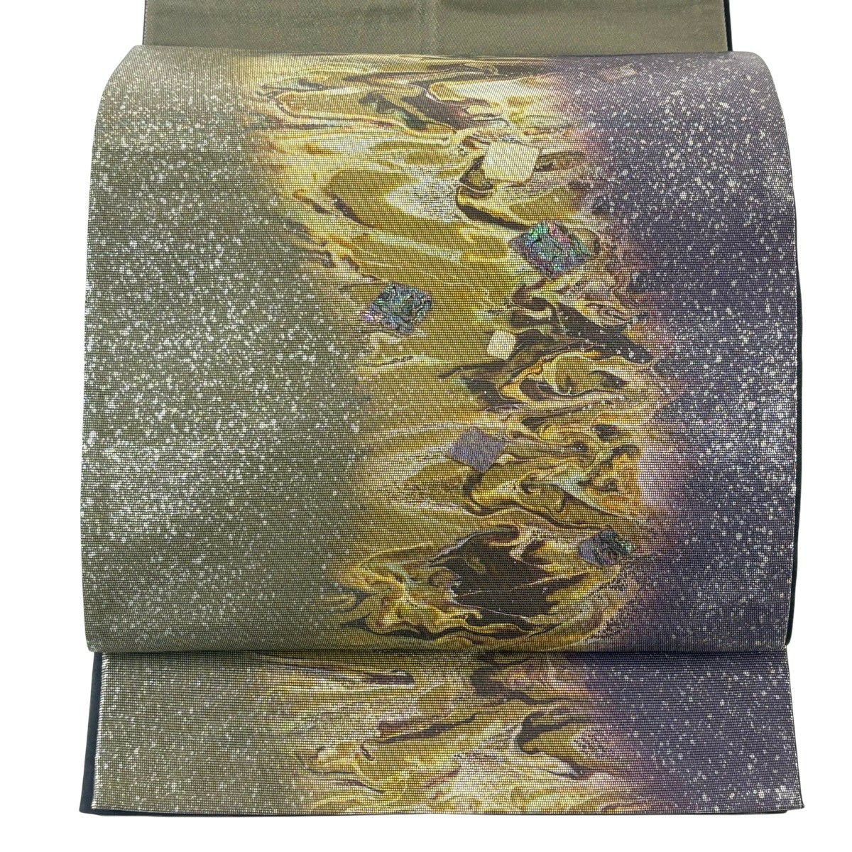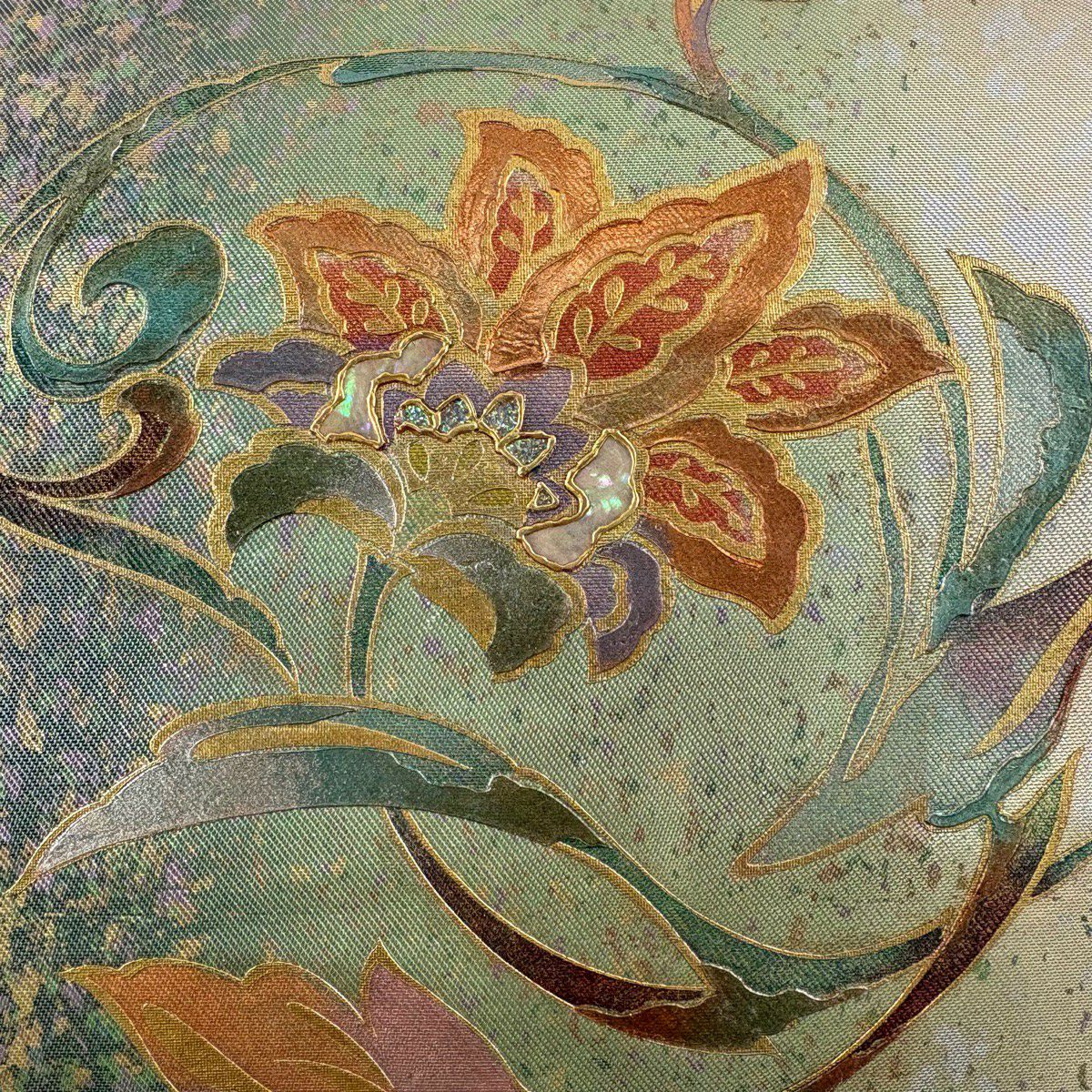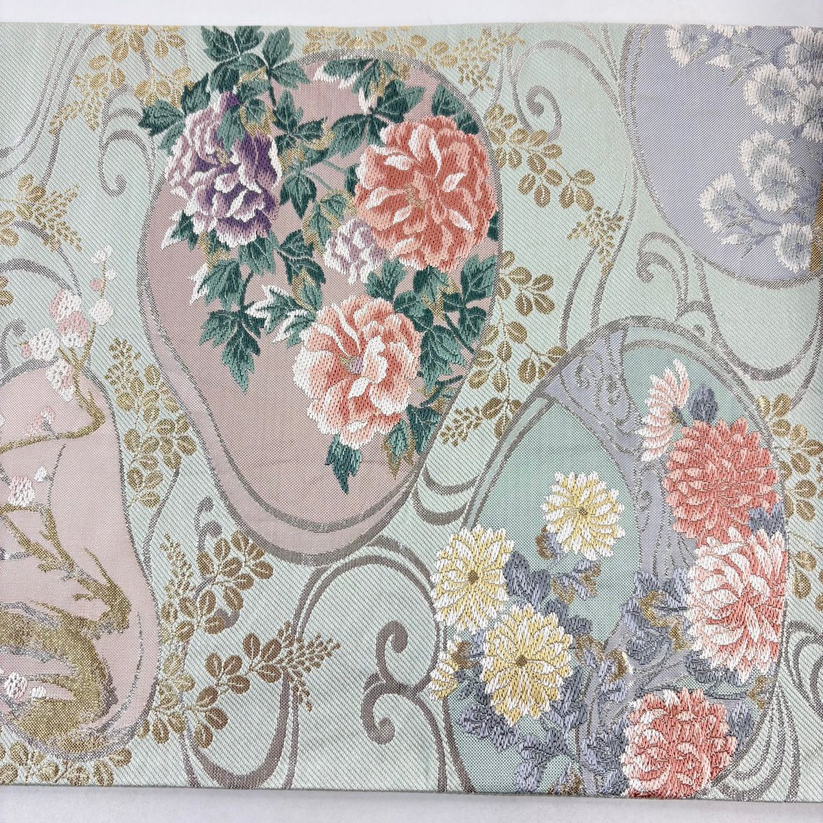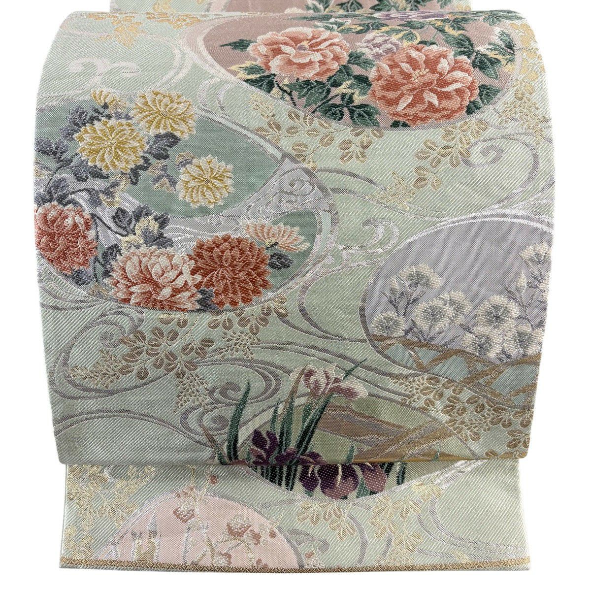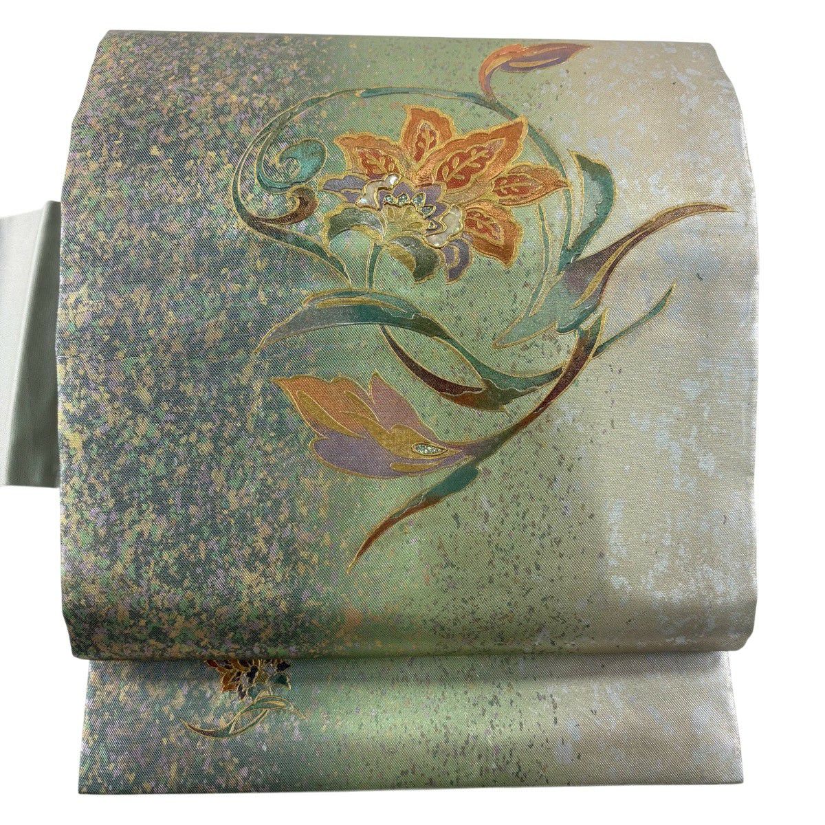 名古屋帯 秀品 草花 螺鈿 金彩 薄緑 正絹