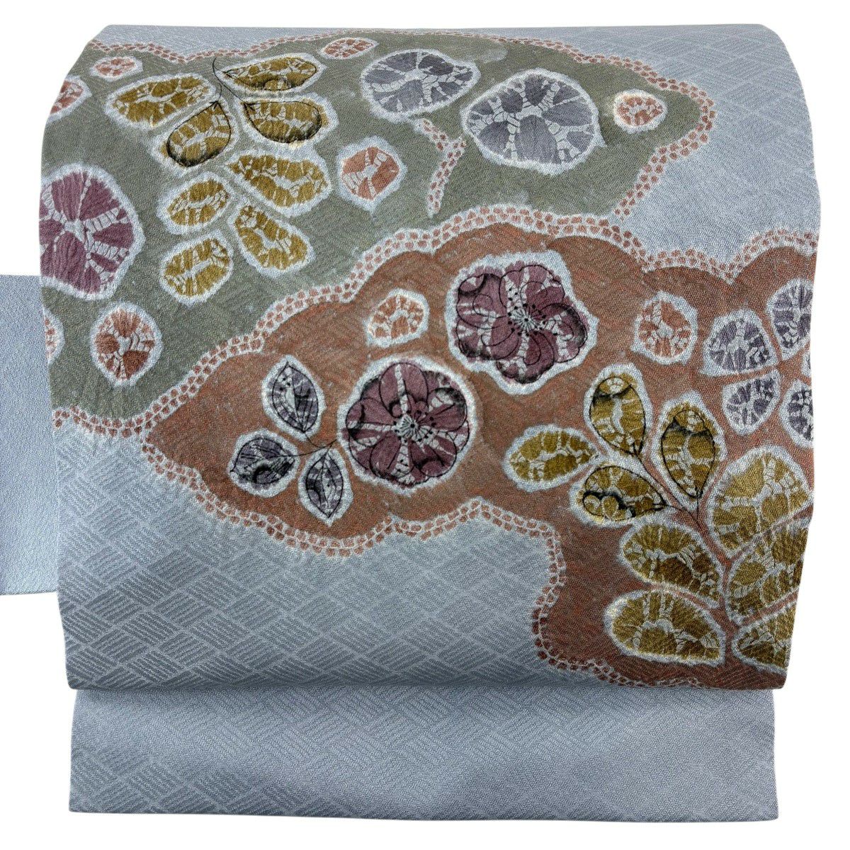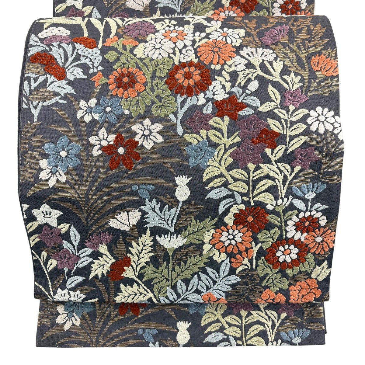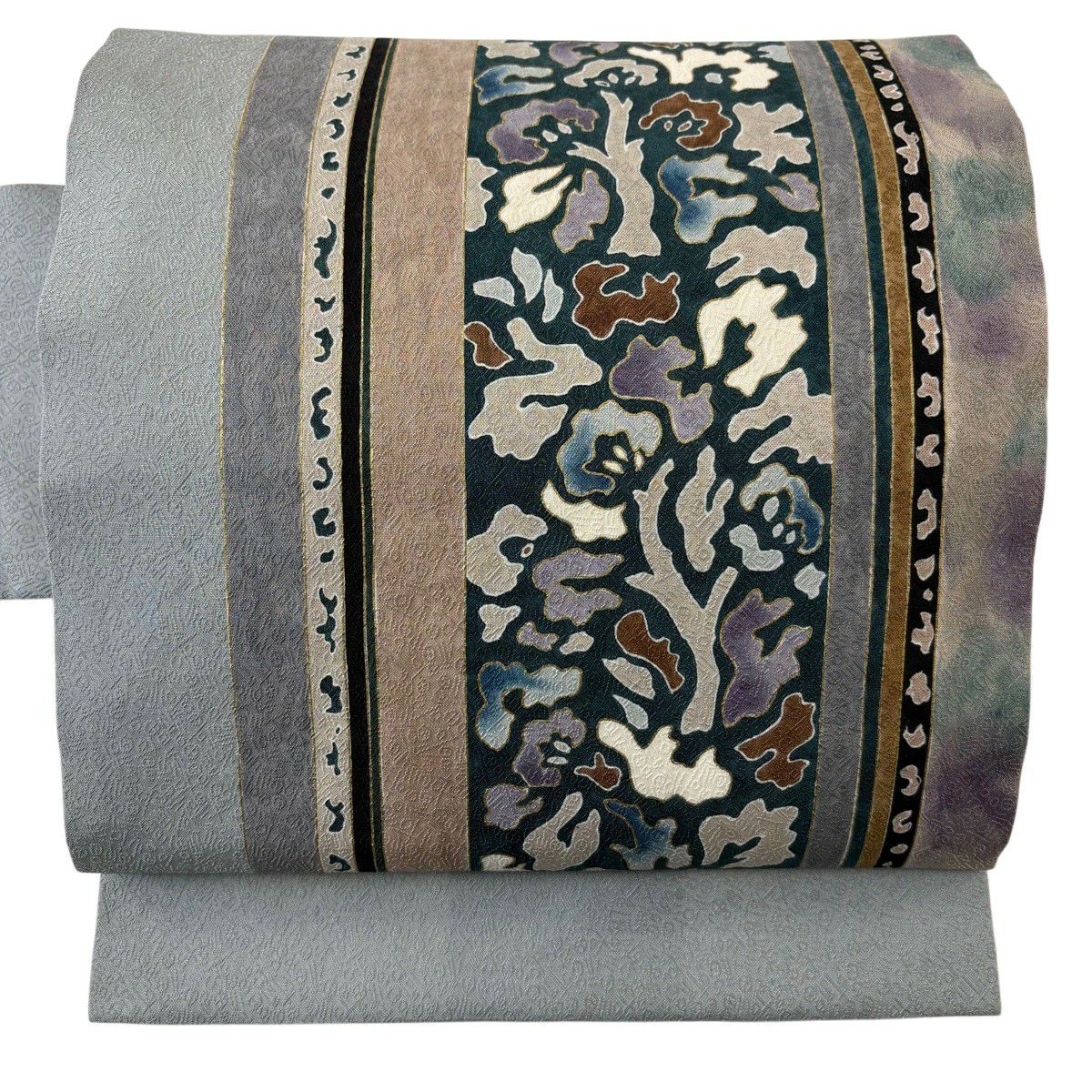 【美品】 名古屋帯 秀品 草花 青灰色 正絹