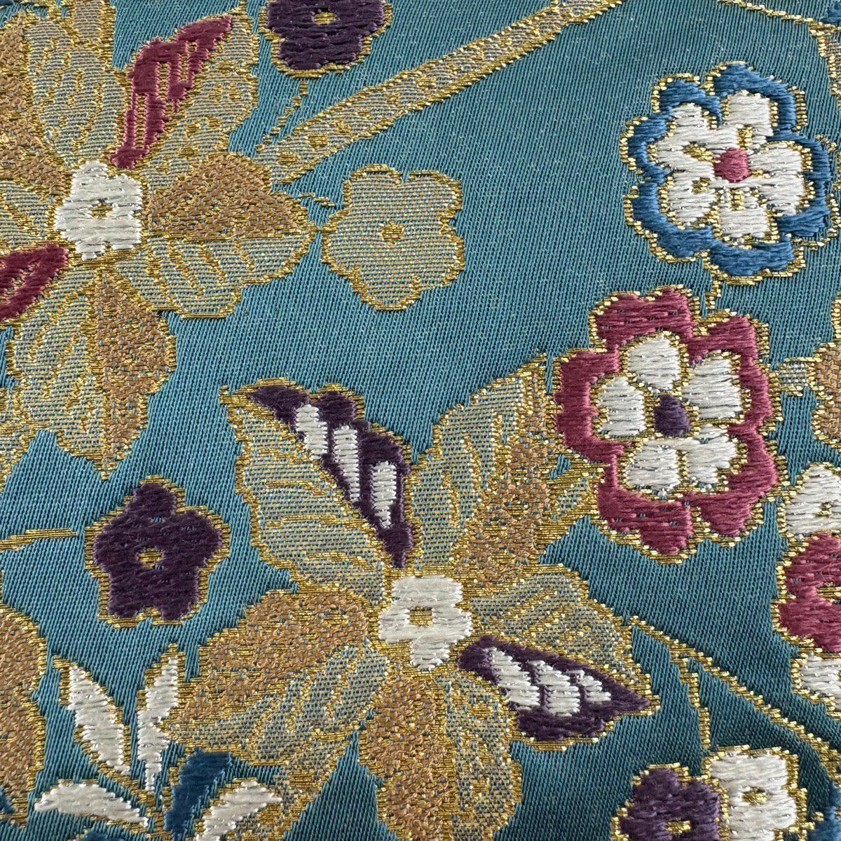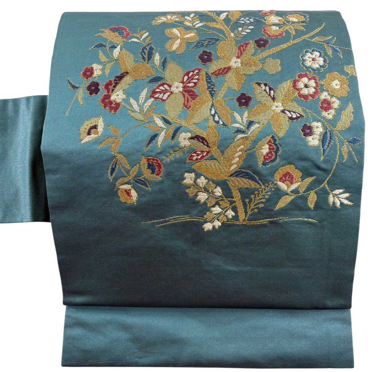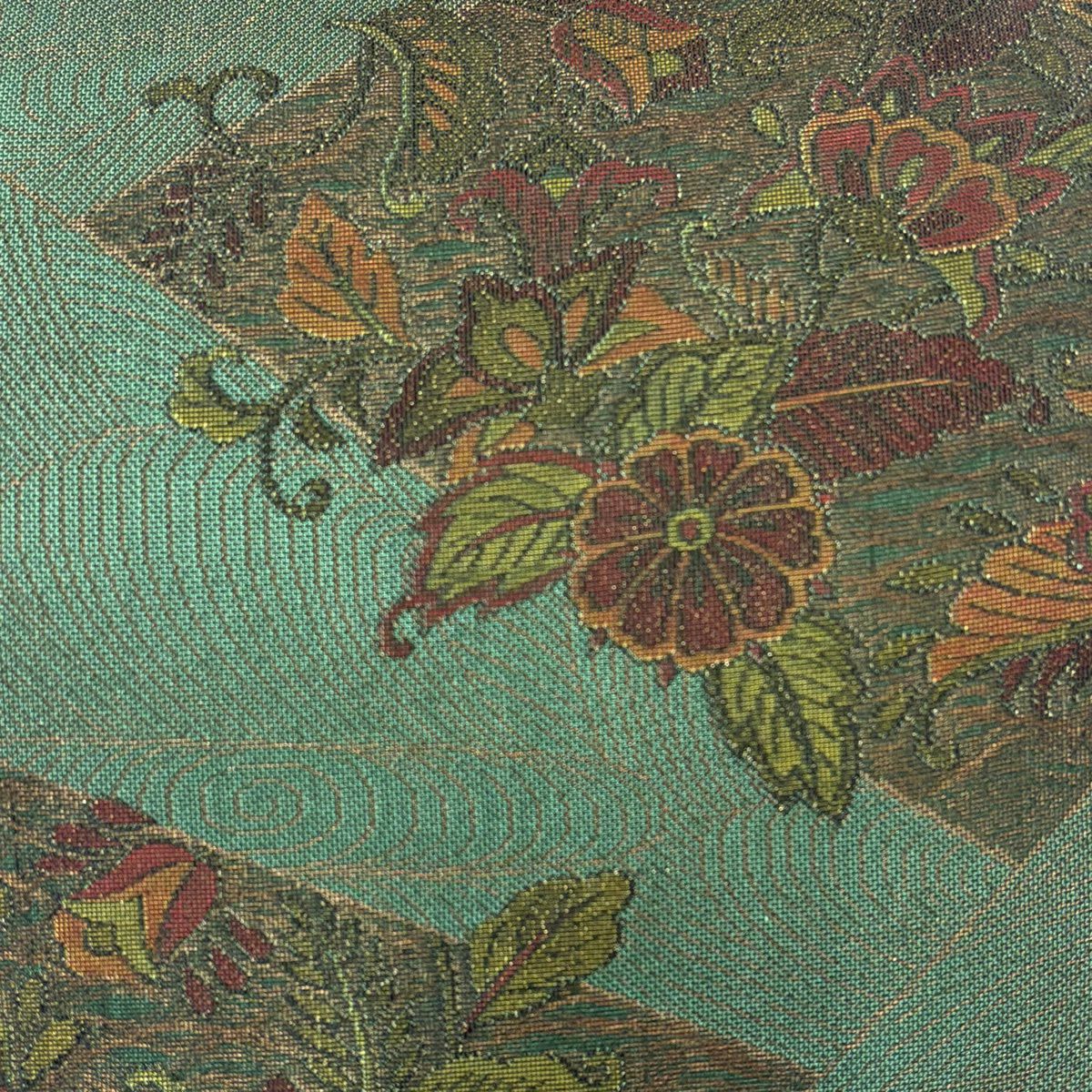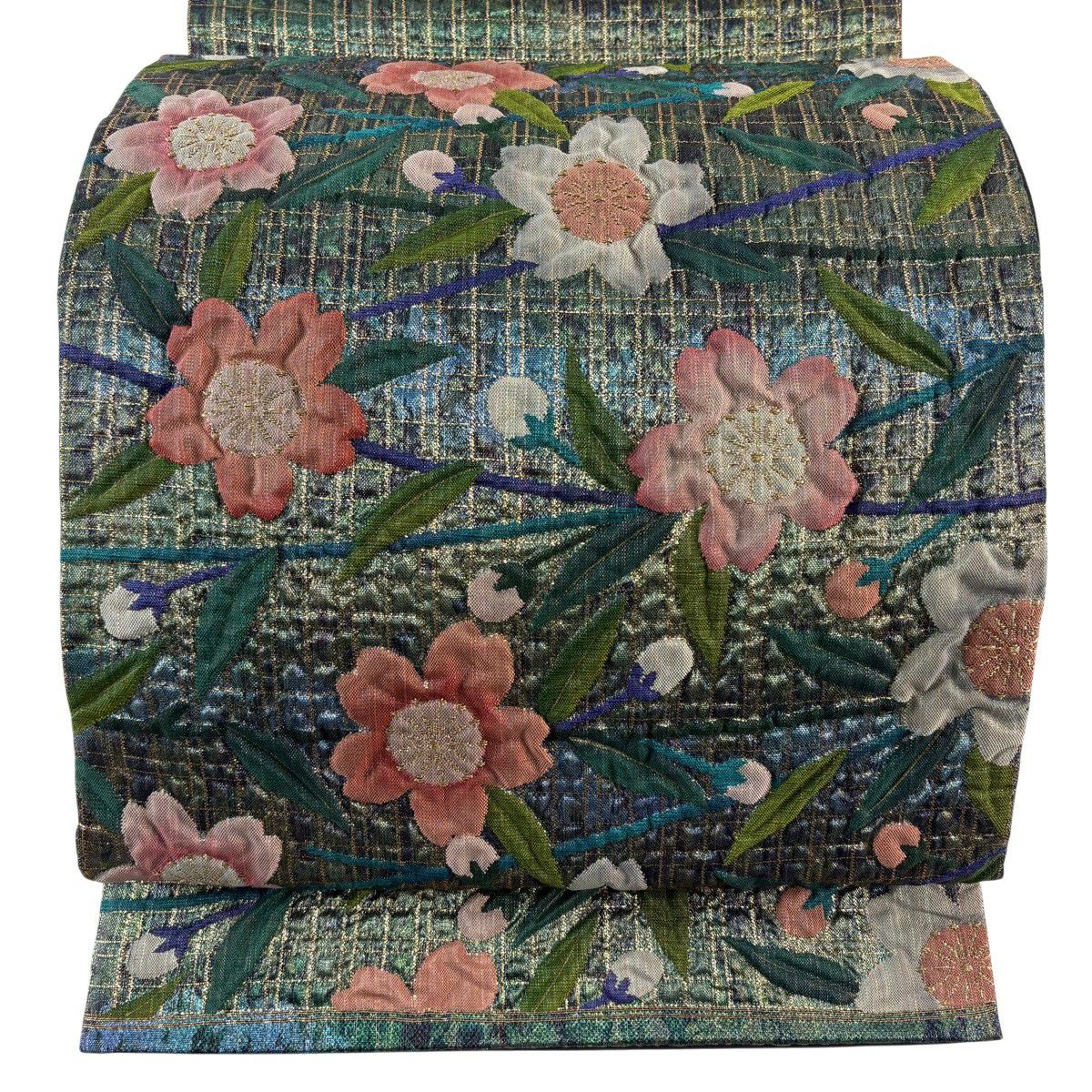 名古屋帯 秀品 草花 金銀糸 箔 青緑 正絹
