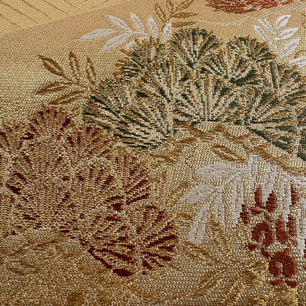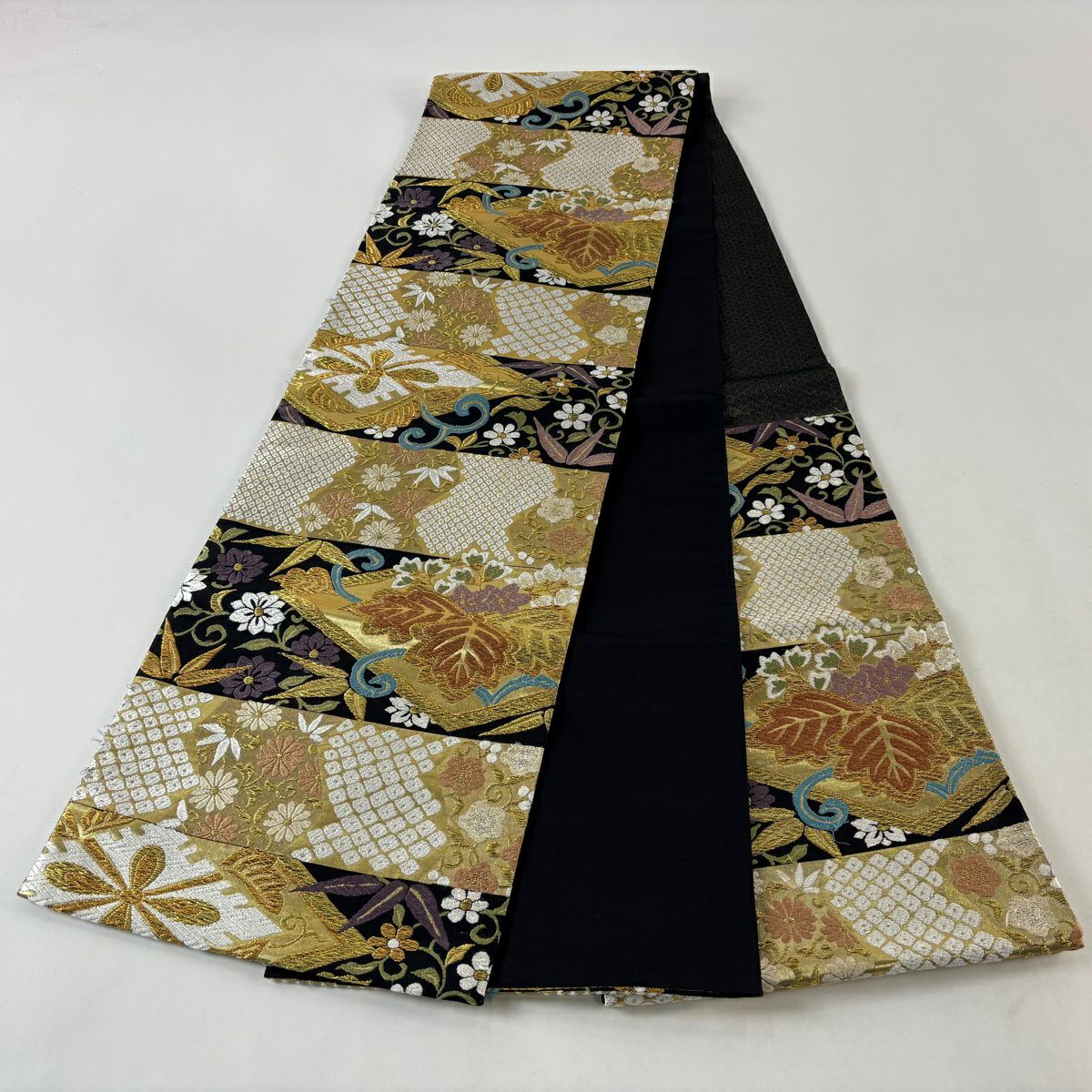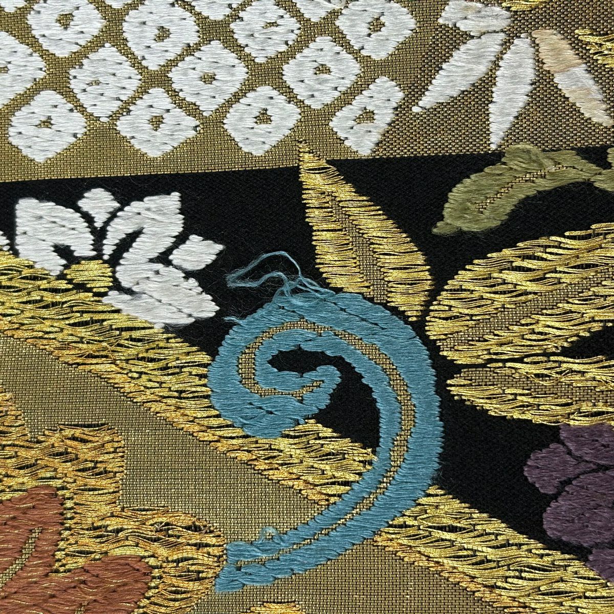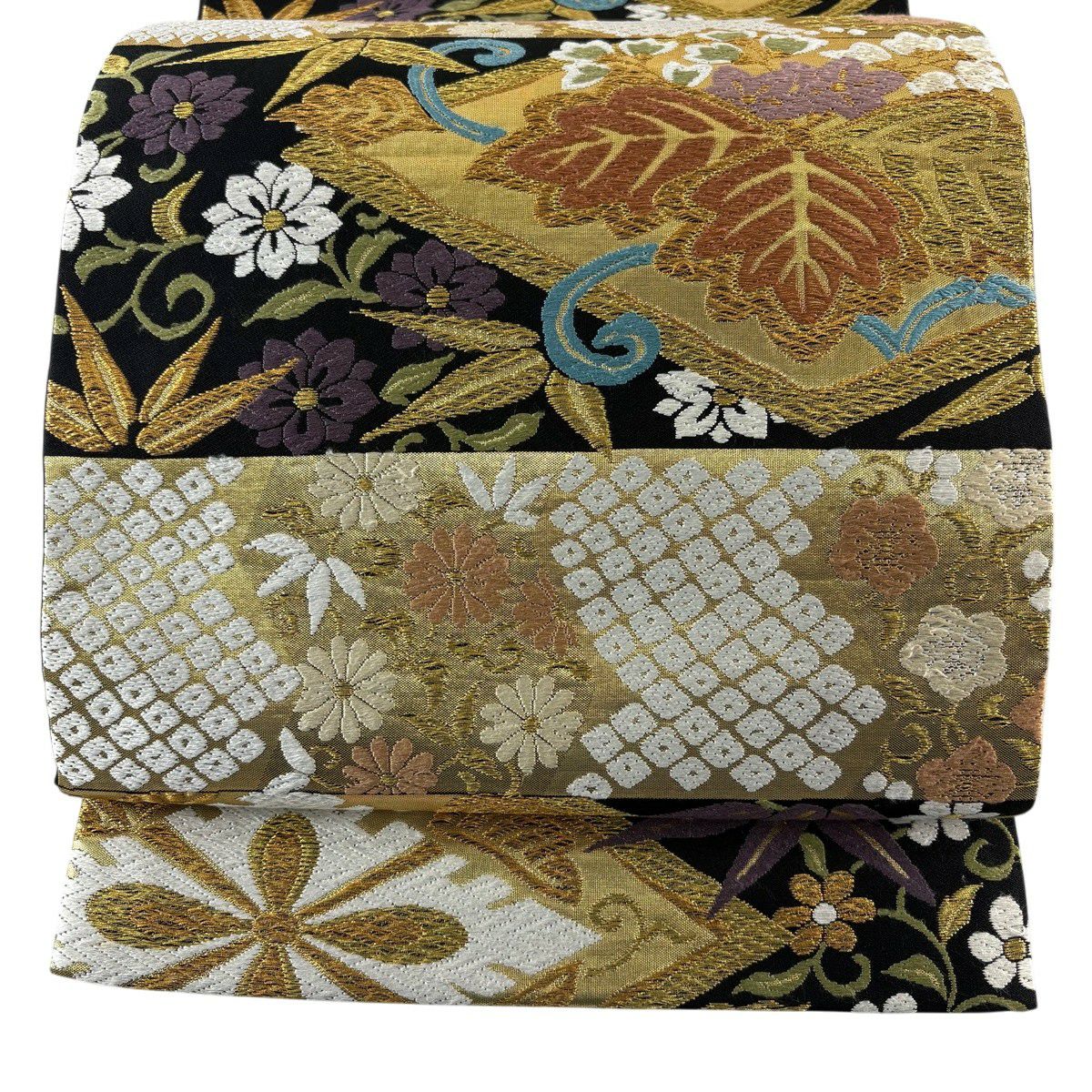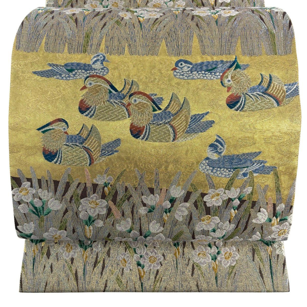 袋帯 秀品 鴛鴦 草花 箔 金色 六通 正絹