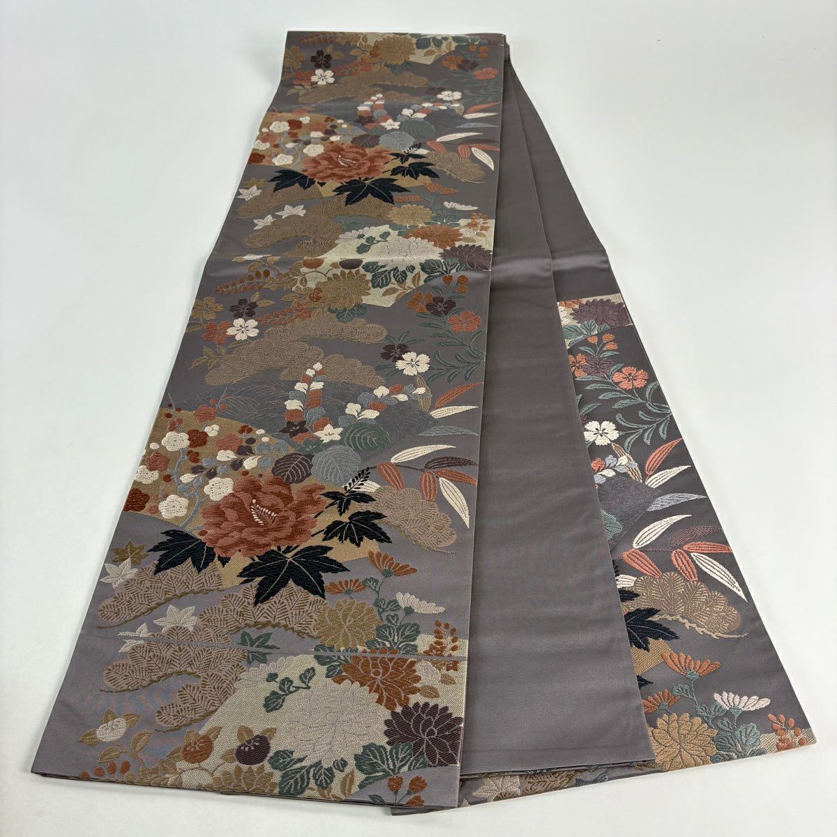袋帯 秀品 松梅 草花 箔 灰紫 六通 正絹