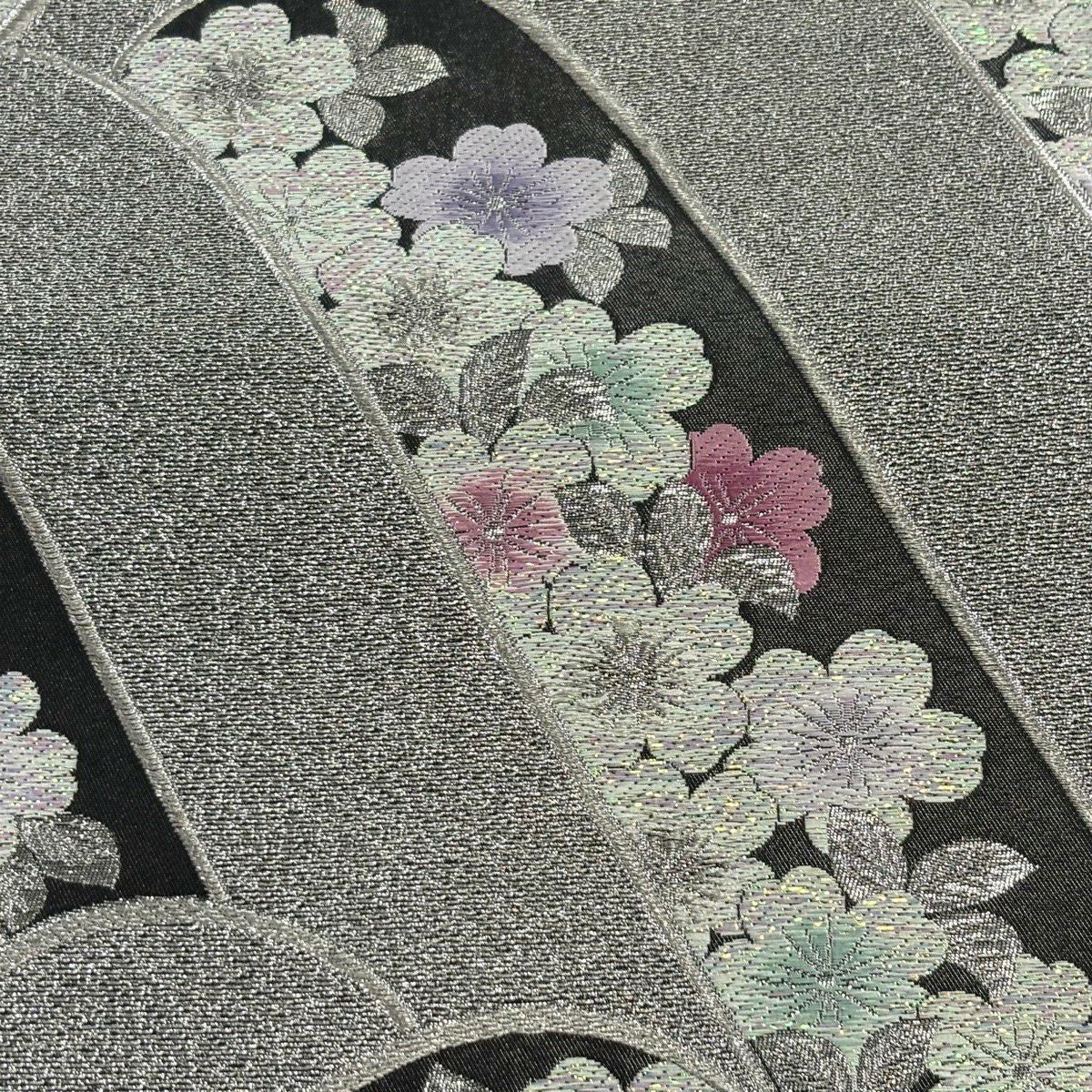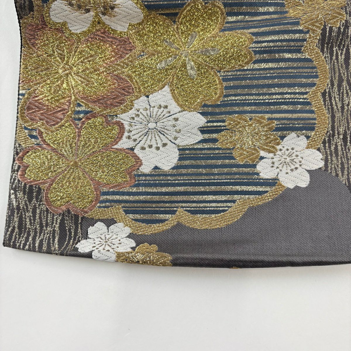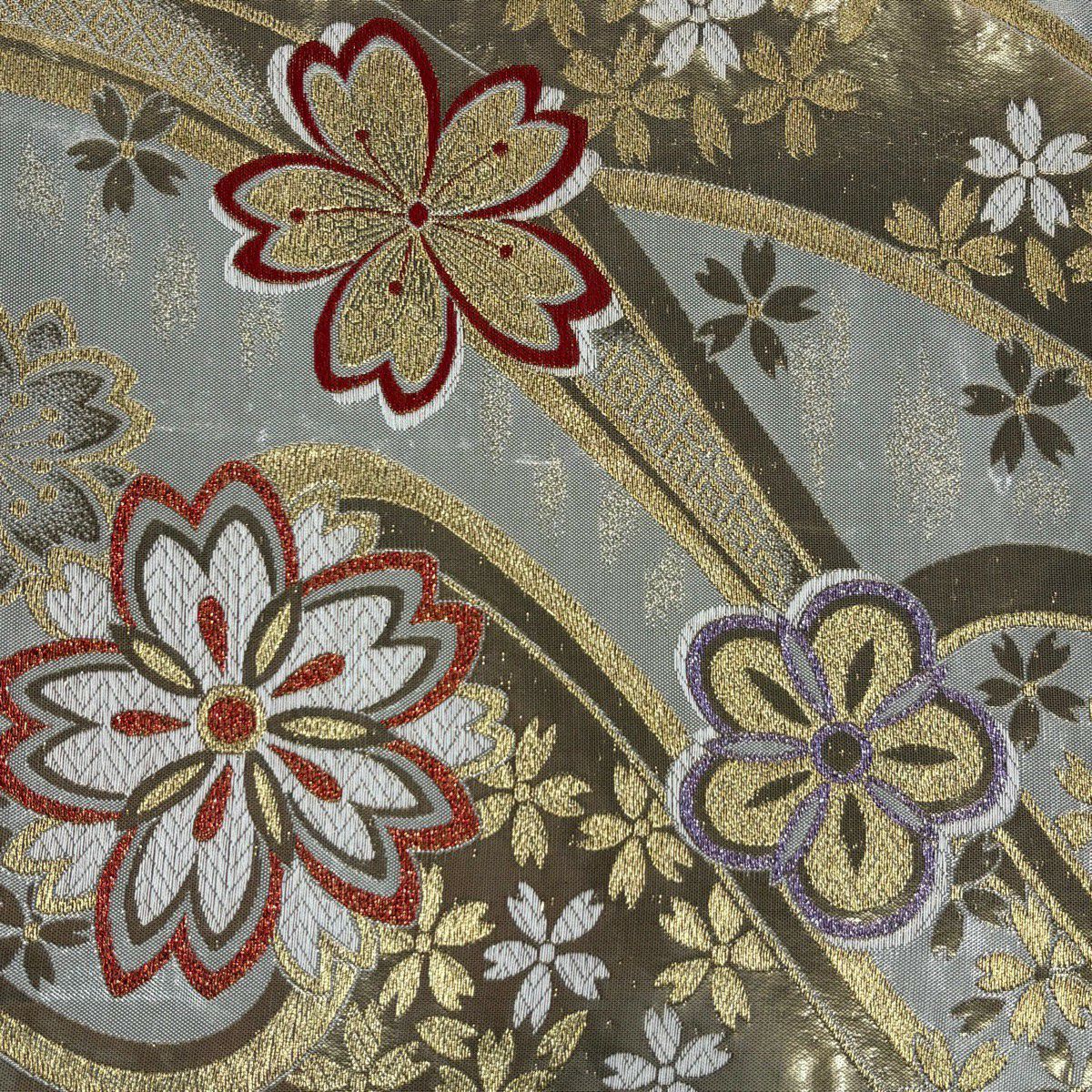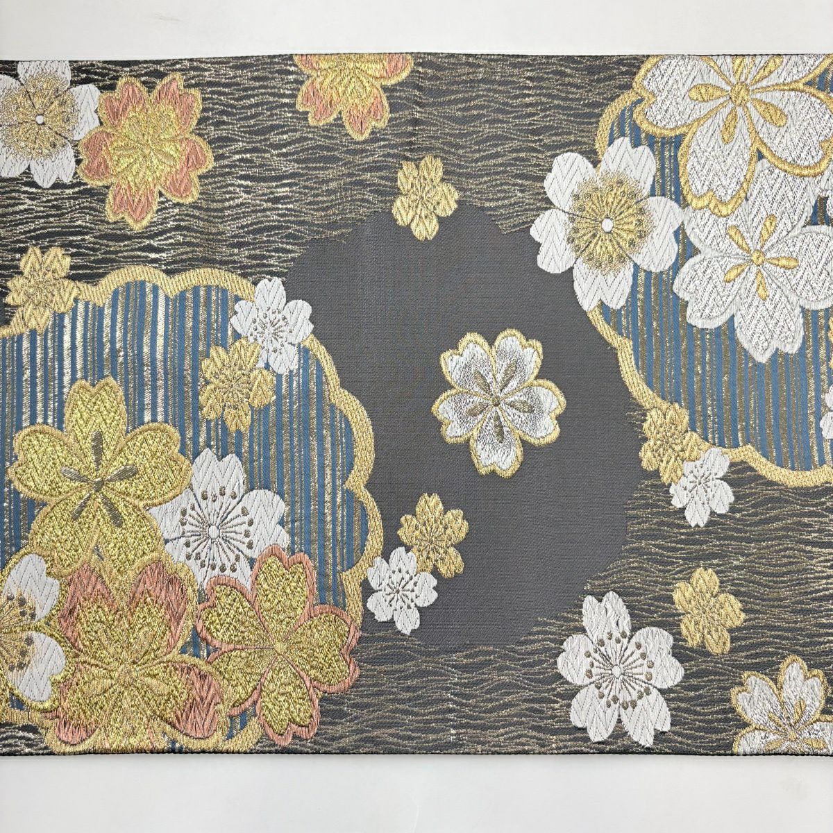 袋帯 秀品 桜 刺繍 金糸 灰色 六通 正絹