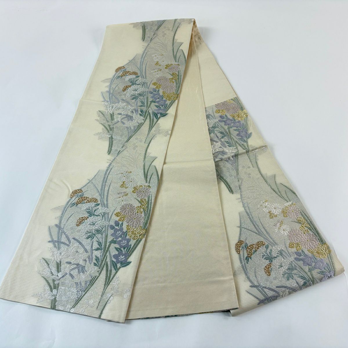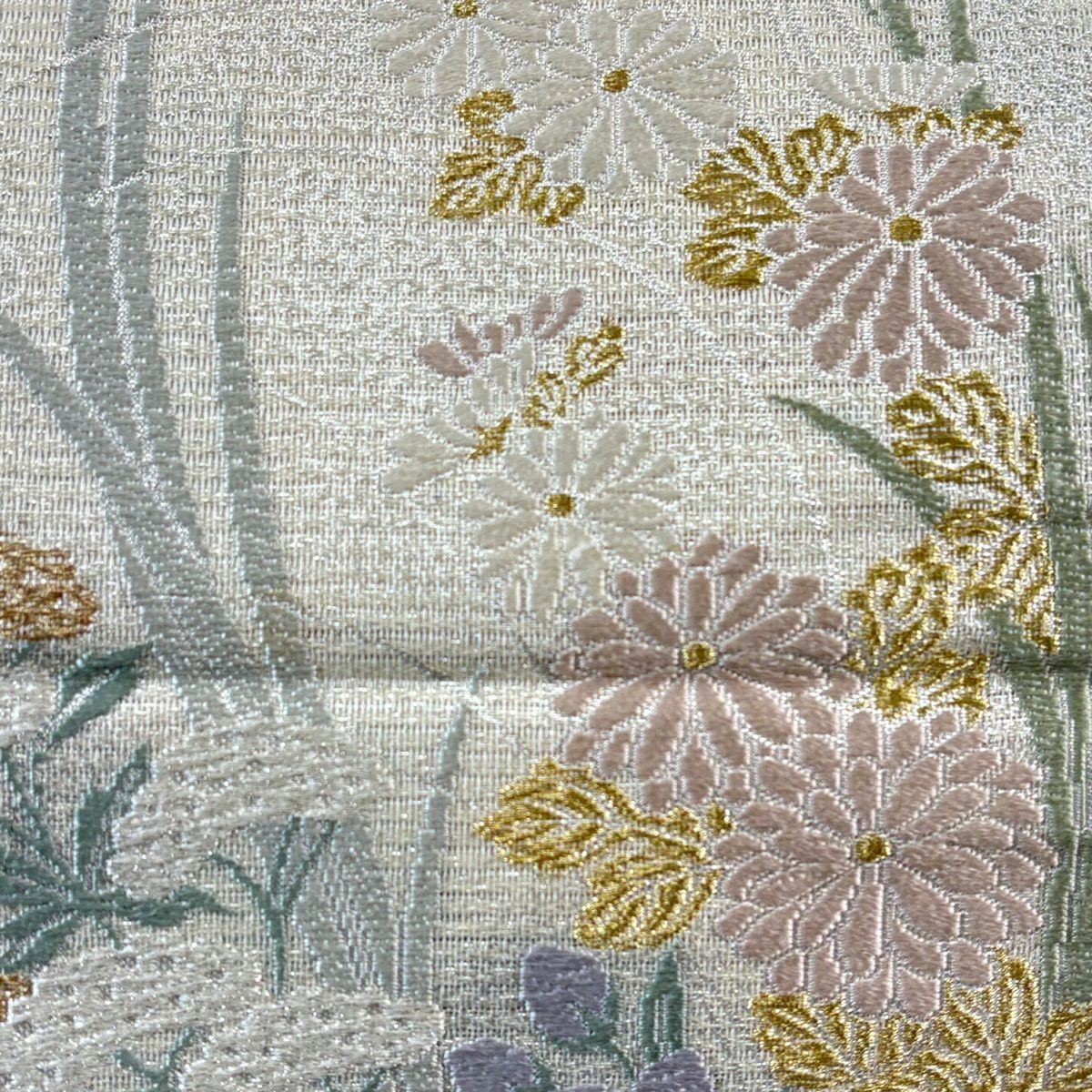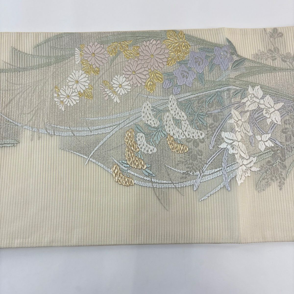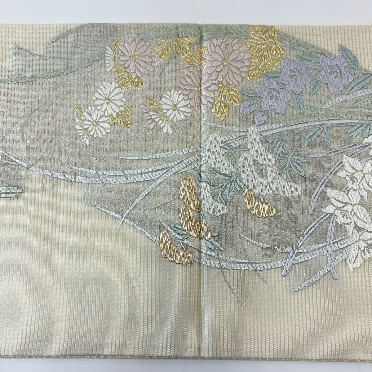 【美品】 袋帯 秀品 菊 桔梗 金糸 箔 クリーム 六通 正絹