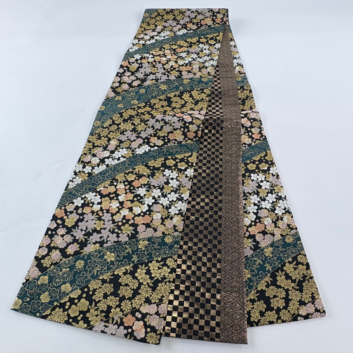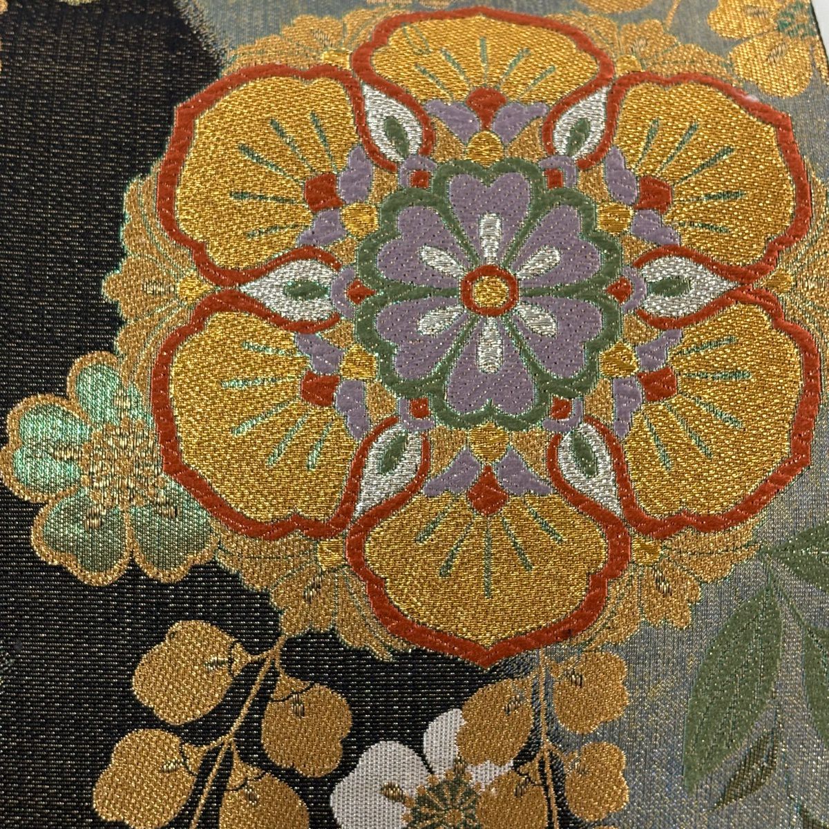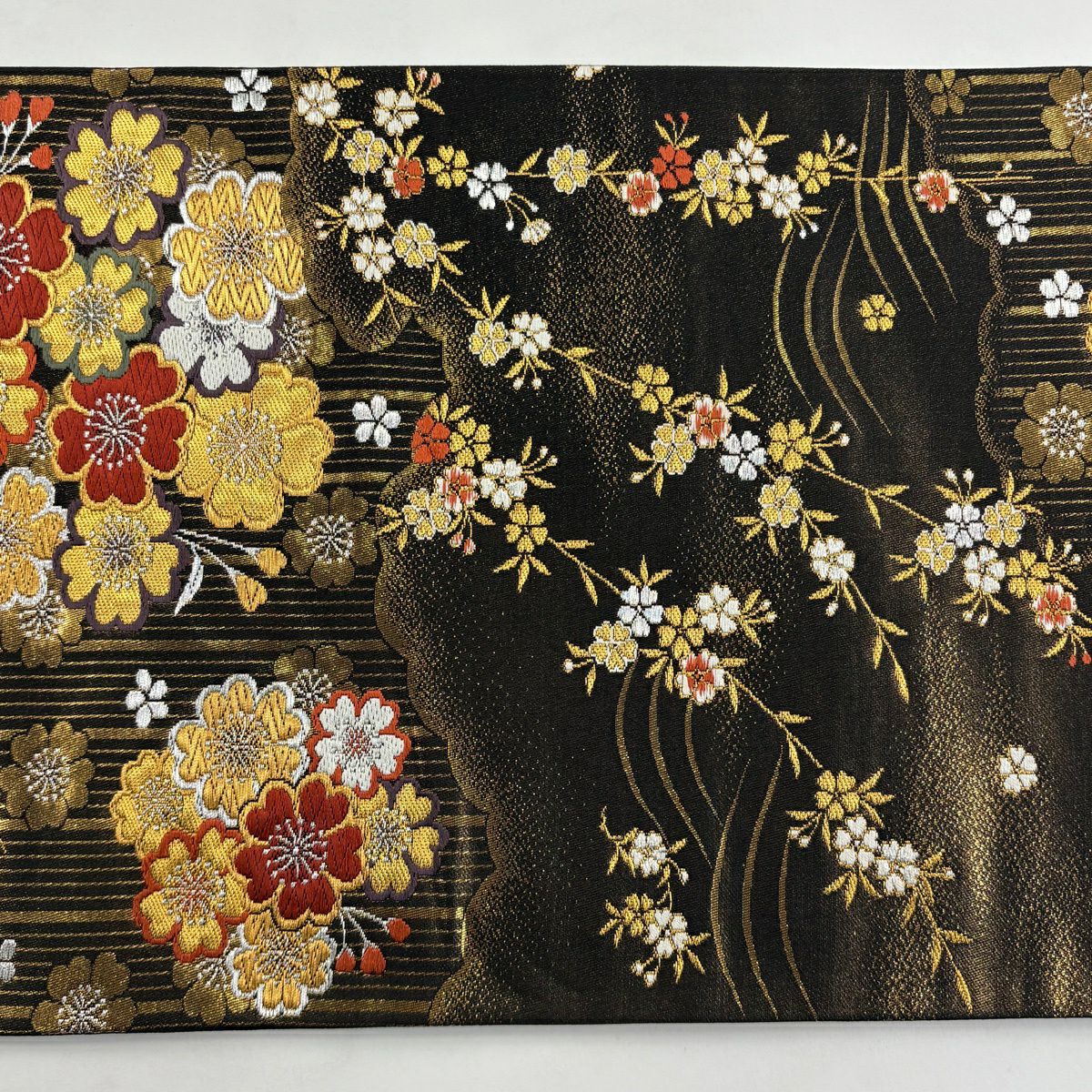 【美品】 袋帯 秀品 色物語 梅 桜 箔 唐織 黒 全通 正絹