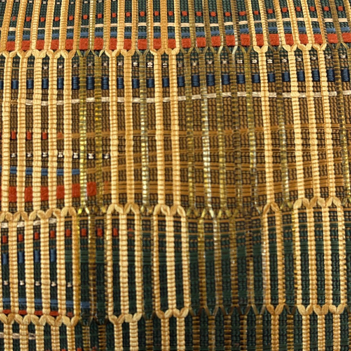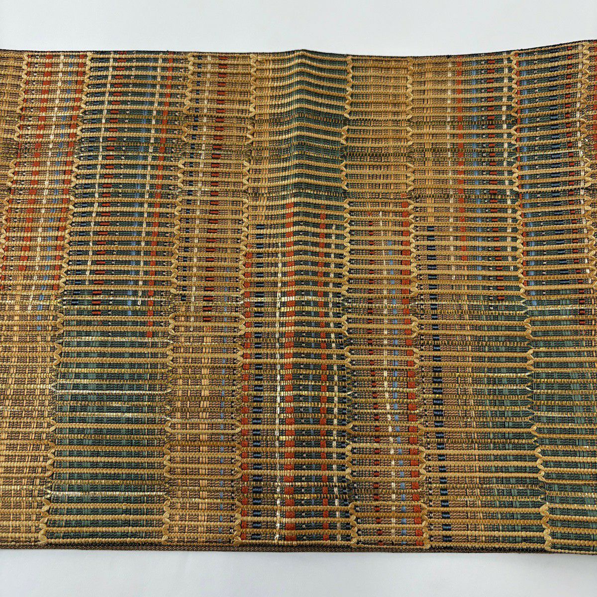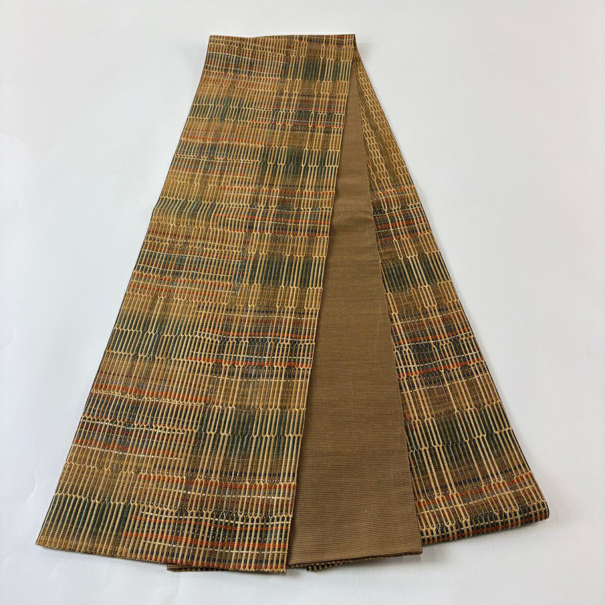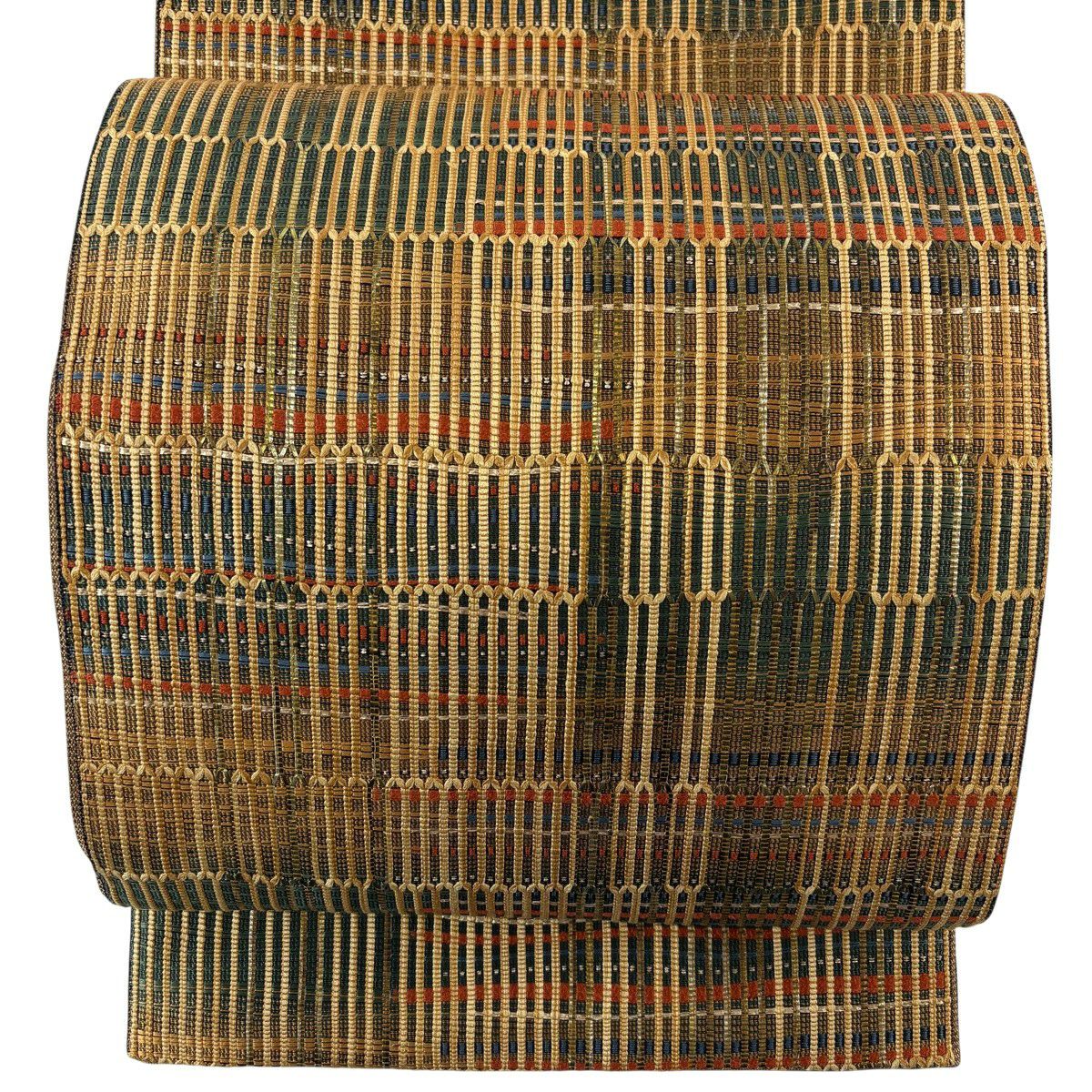 【美品】 袋帯 秀品 幾何学模様 縞 箔 山吹茶色 六通 正絹
