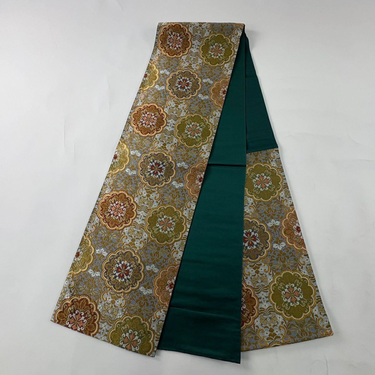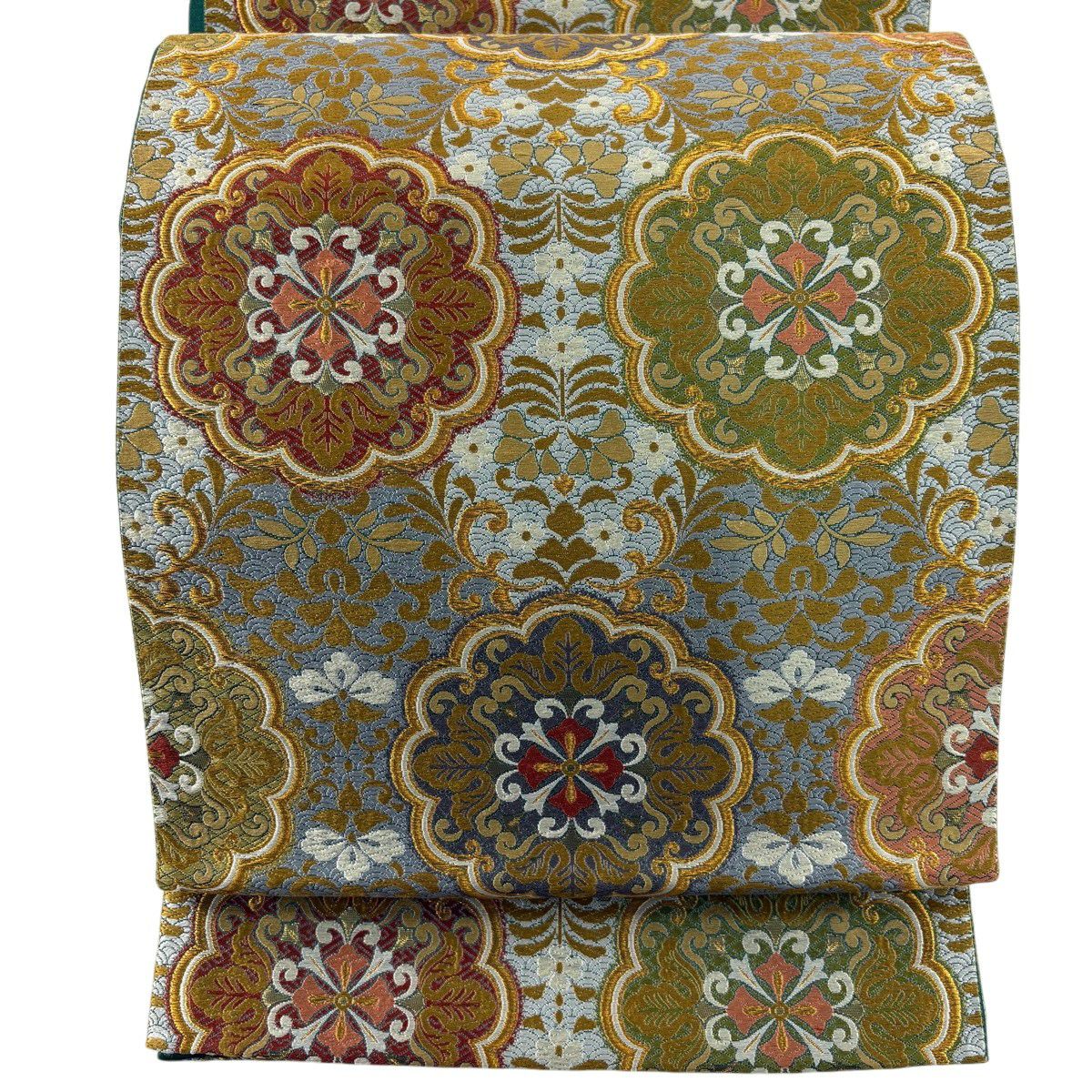 【美品】 袋帯 秀品 草花 七宝 箔 金銀糸 灰緑 六通 正絹
